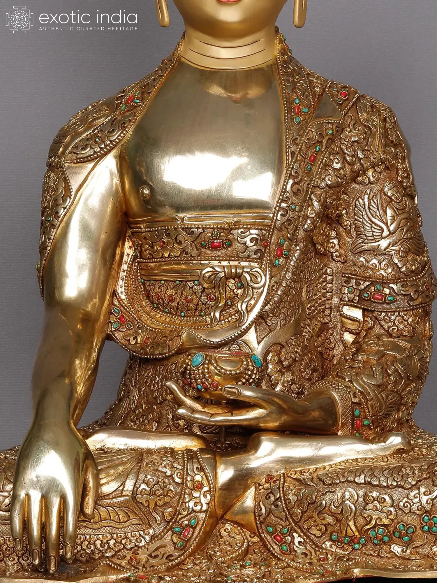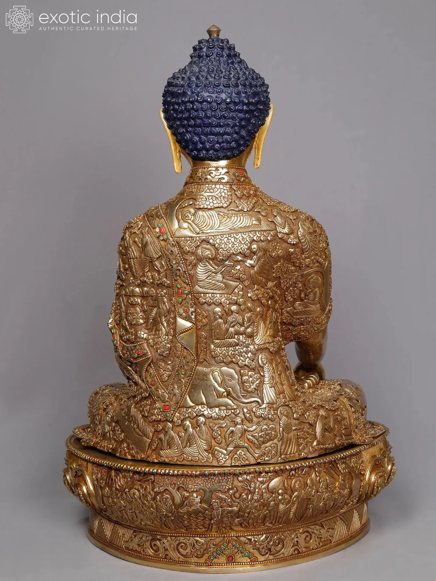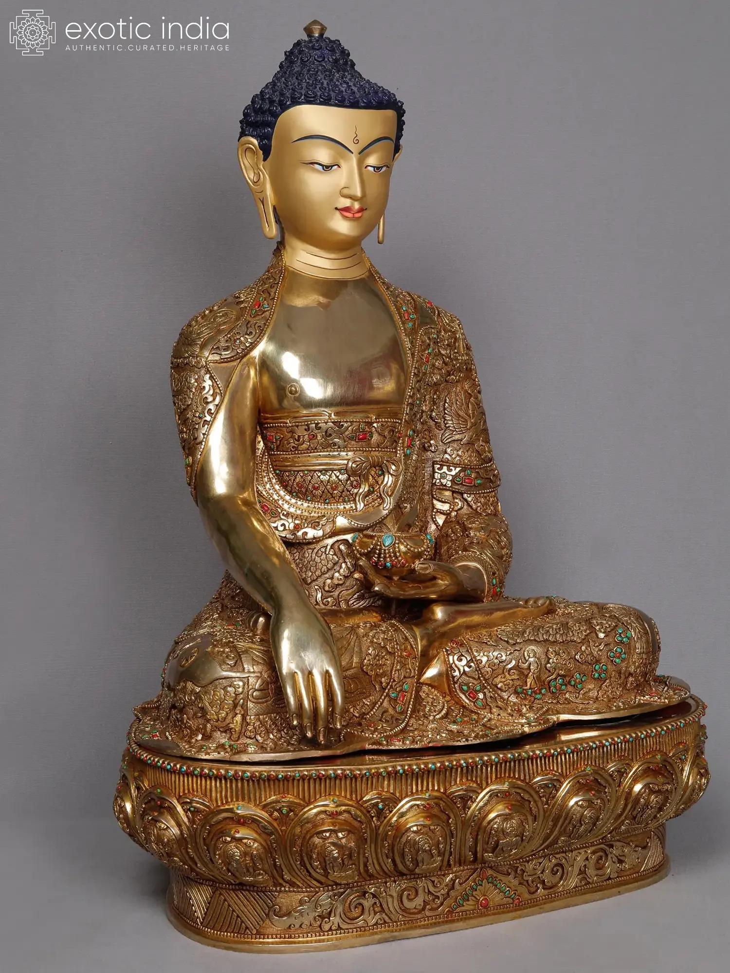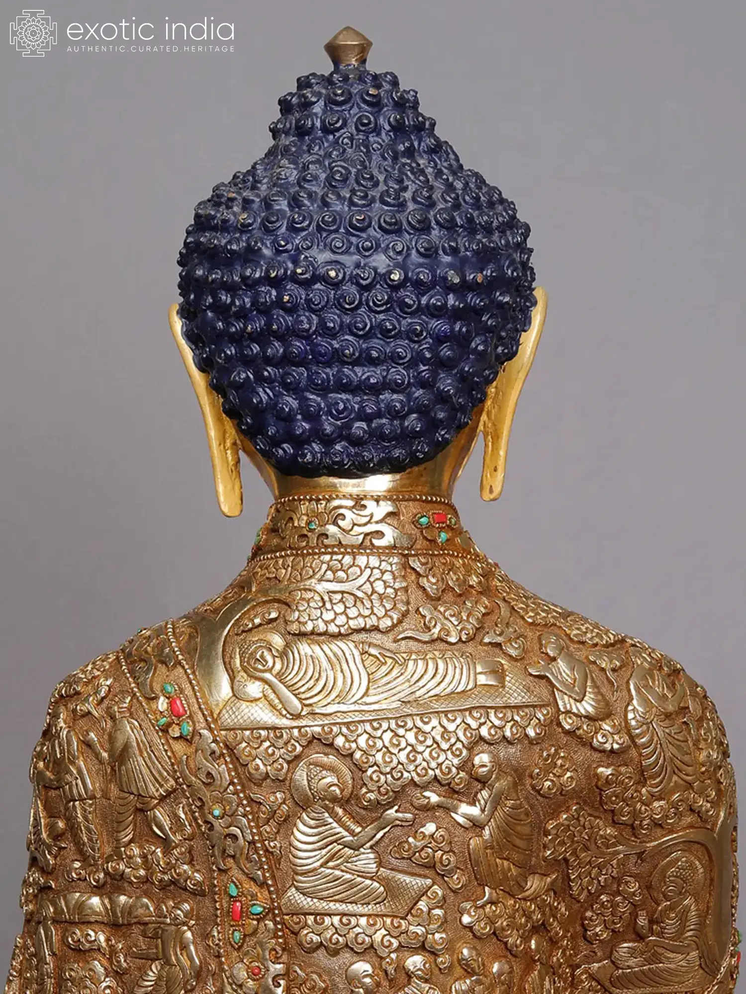 Draped in the spiritual aura of his life stories, this gilded copper Buddha statue from Nepal is a rare masterpiece from the Himalayan valley. The robe wrapped around Buddha’s gleaming body is patterned with tales of his life, which holds the essence of Buddhist teachings. The entire robe is intricately designed and studded with coral and turquoise. Each petal of the lotus seat of Buddha also nestles a scene from his sacred life story. Vitalized by the spiritual quality of Buddha’s face, this masterpiece is the way to experience Buddha’s wisdom.