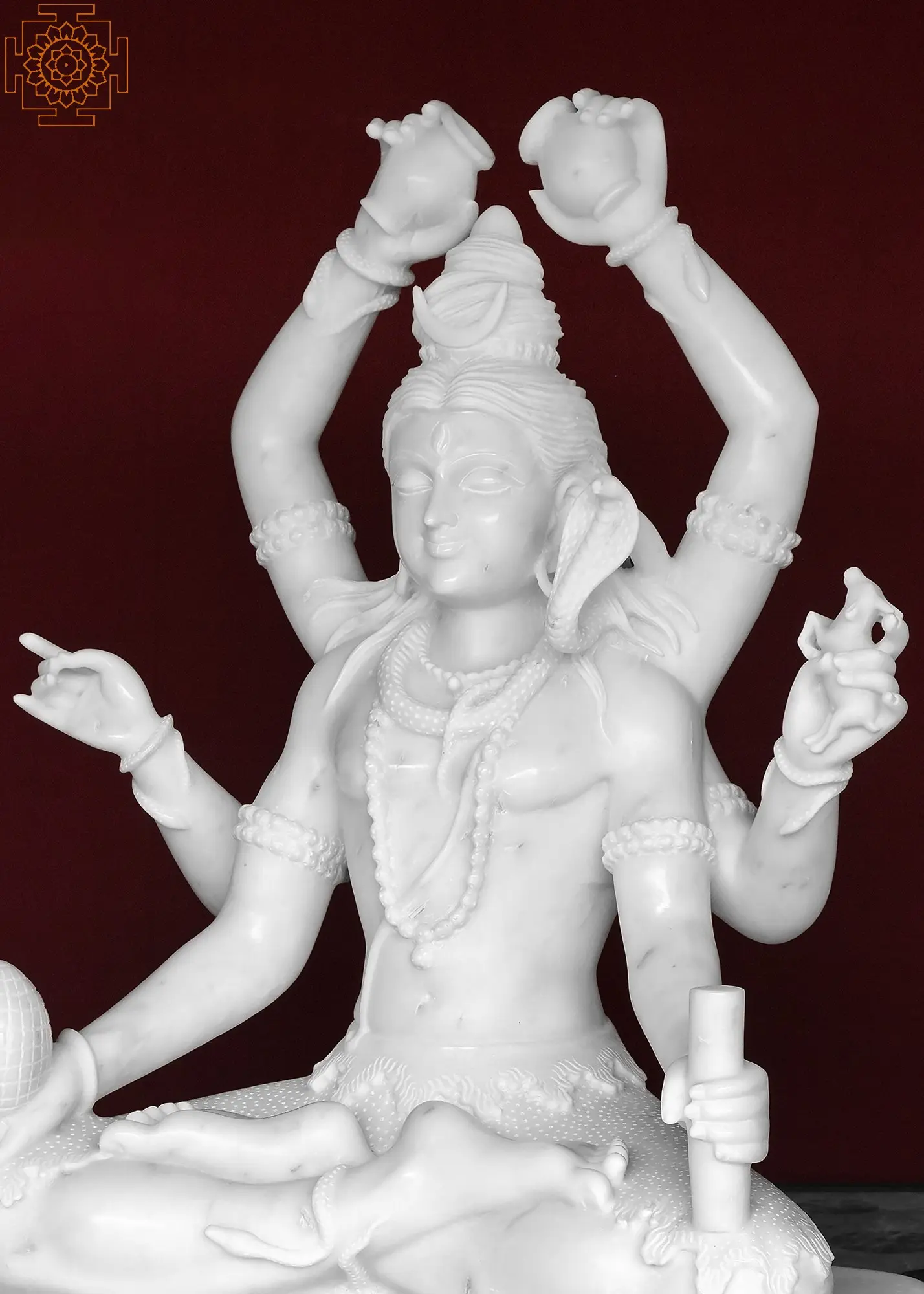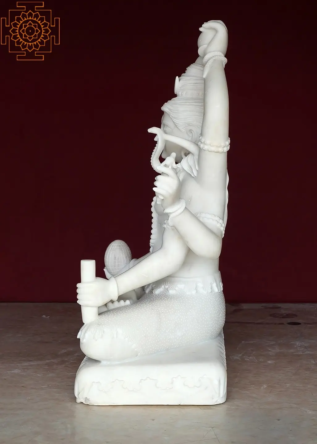 Invite the divine serenity and formidable power of Lord Shiva into your sacred space with this exquisite statue. Crafted from pristine white marble, this masterpiece captures the essence of Mahadev in his tranquil yet all-encompassing form, seated upon the majestic Mount Kailasha. This magnificent representation is not merely a decorative piece, but a conduit to spiritual contemplation and a testament to unparalleled artistry. Each detail of this statue speaks volumes about the rich mythology and profound symbolism associated with Lord Shiva. His iconic third eye, a symbol of supreme consciousness and destructive power, is subtly yet powerfully rendered. The serpents, entwined around his neck and arms, represent his dominion over primal energies and his role as the destroyer of ignorance. The serene expression on his face, amidst his divine attributes, conveys his transcendence over the material world, a state of eternal peace and profound wisdom. ––––––––––––––––––