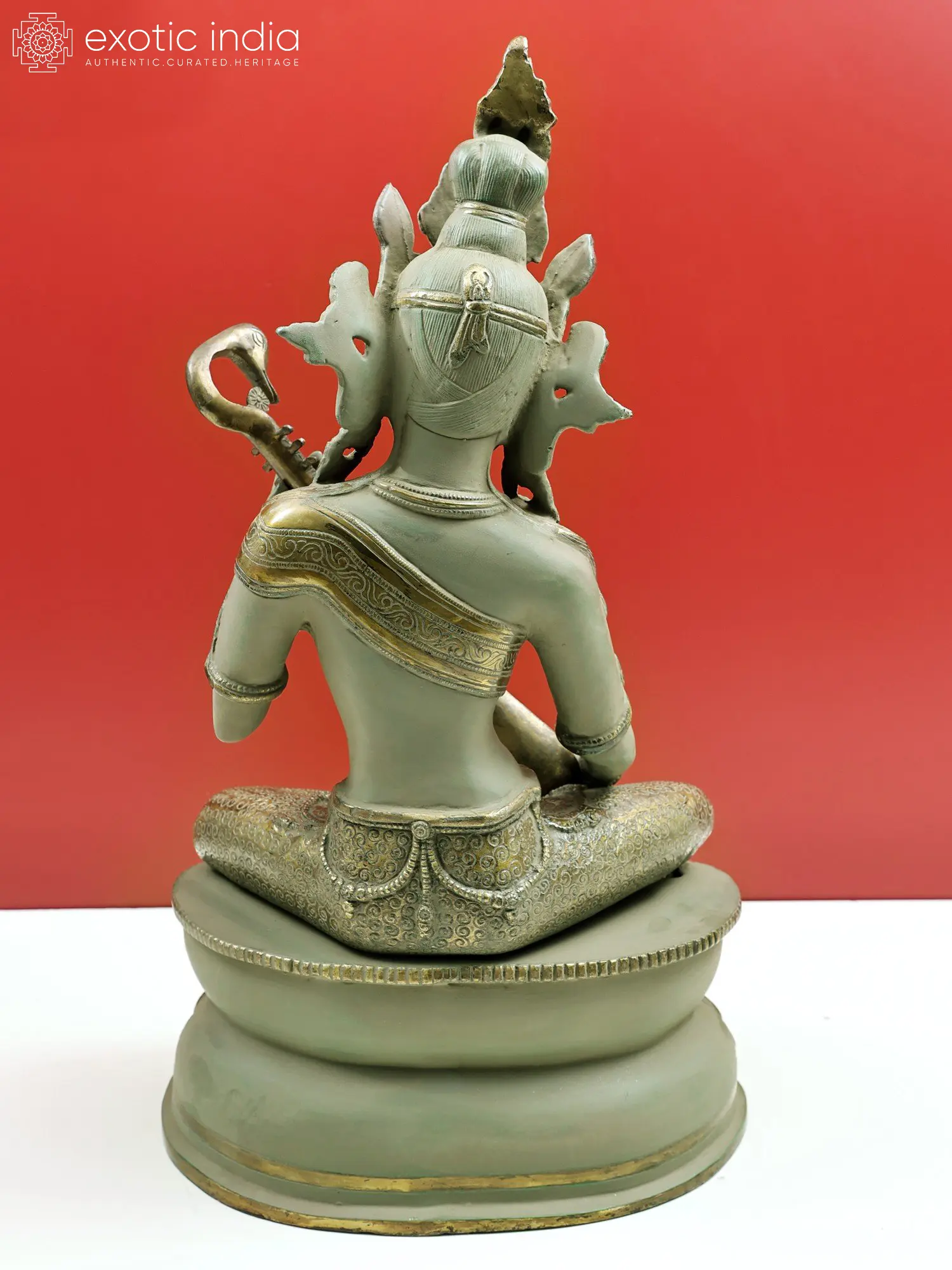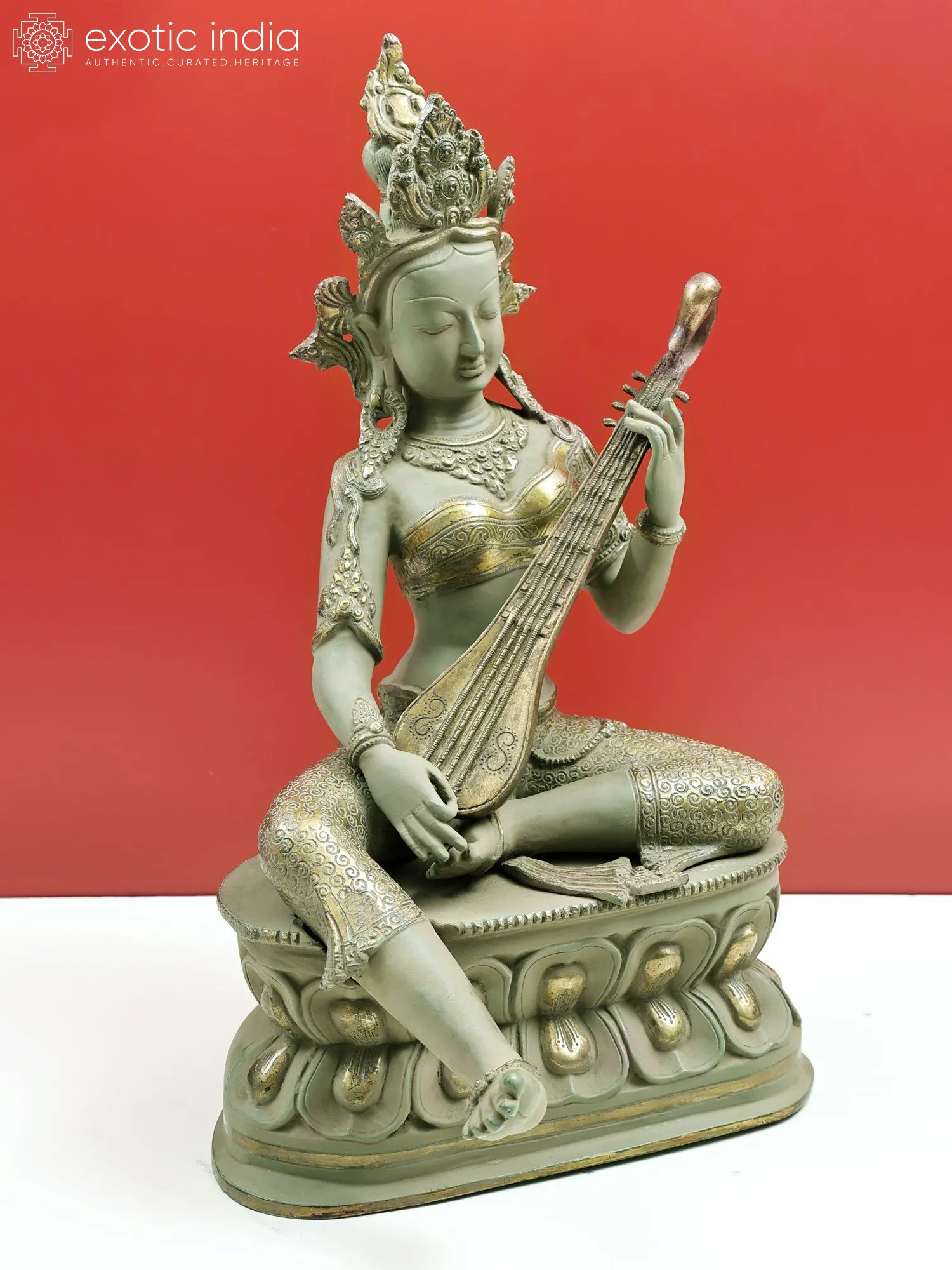 A Nepalese statue of the Hindu Goddess Saraswati. The serene dvibhujadharini (the one possessed of two arms) strums the veena, whose long and slender stem resembles the beauteous torso of its divine mistress. Such a Saraswati statue is indicative of Her role as the presiding deity over aesthetics, learning, and the fine arts.