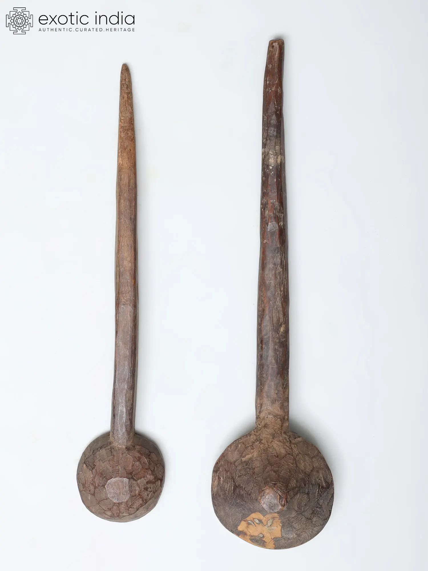 These vintage Hawan spoons are more than just functional items; they are objects of profound cultural and historical significance. Their age and patina whisper stories of past ceremonies, of prayers offered and blessings received. They represent a direct connection to a rich cultural heritage and invite contemplation on the timeless practices and beliefs that have shaped India's spiritual landscape for centuries. Owning these spoons is owning a piece of history, a tangible link to ancient traditions and the enduring power of faith. Display these striking spoons in your home as a unique decorative statement that celebrates spirituality, culture, and the enduring beauty of handcrafted artistry. The natural variations in the wood, the subtle imperfections, and the aged finish all contribute to their unique charm and collectibility, making each pair truly one-of-a-kind.
