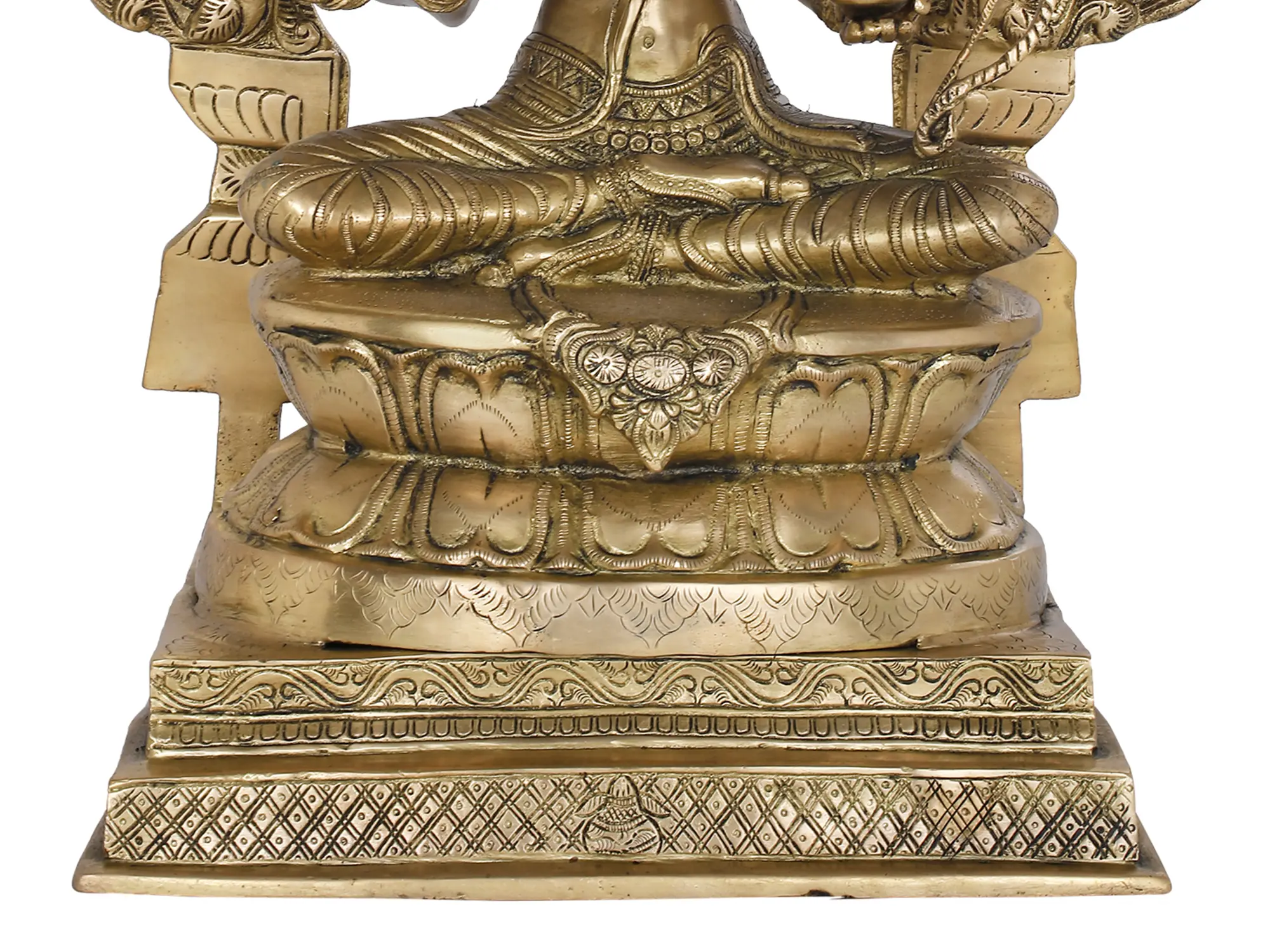 Crafted from high-quality brass, this statue is not merely a religious artifact but a testament to the enduring tradition of Indian metal artistry. The warm, golden hue of the brass lends a timeless and sacred quality to the sculpture. The meticulous detailing on the ornamentation, the flowing drapery, and the lotus pedestal showcase a deep understanding of iconography and artistic precision. The sturdy base, adorned with intricate geometric patterns and symbolic motifs, provides a stable foundation for this divine representation, ensuring its grandeur and presence in any sacred space. This piece is poised to become a cherished heirloom, a source of blessings, and a beautiful reminder of the profound spiritual heritage of India.