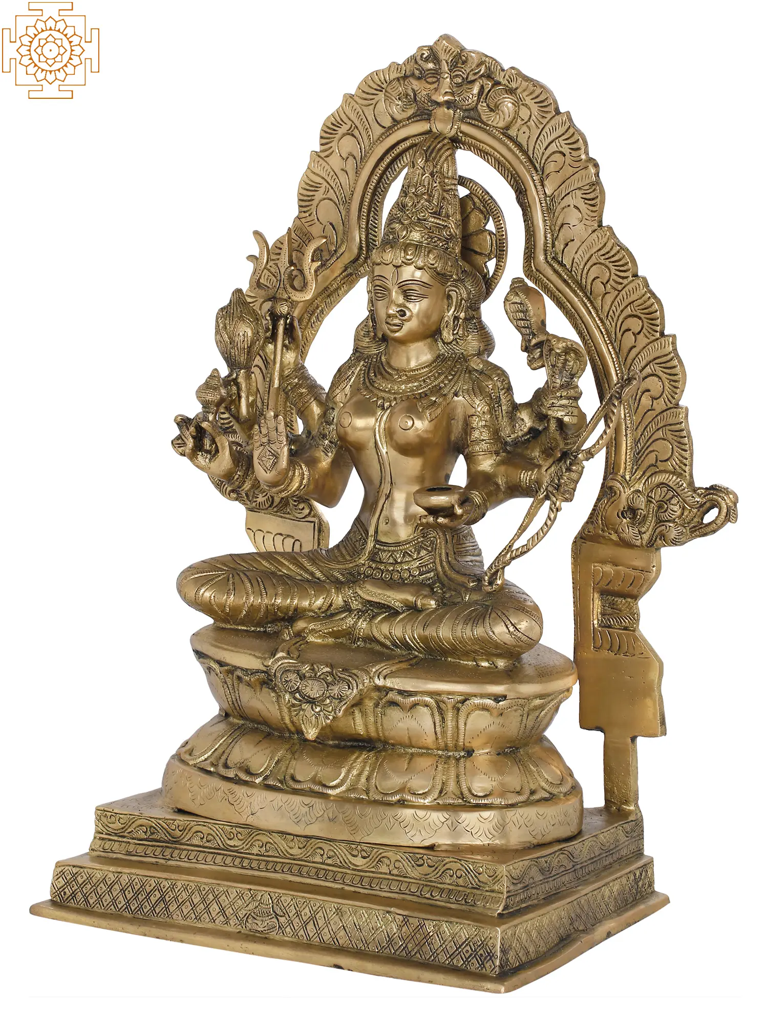 This exquisite brass statue captures the benevolent presence of Santoshi Mata, a beloved Goddess revered for her bestowal of good fortune and satisfaction. Seated in a serene lotus posture, she radiates an aura of peace and abundance, making her a focal point of devotion and a source of spiritual solace. The intricate craftsmanship evident in every detail speaks to the skill of the artisans who have brought this divine form to life. The Goddess is depicted with multiple arms, each holding symbolic objects that represent her power and blessings. Her serene facial expression, adorned with delicate jewelry, invites contemplation and devotion. The elaborate arch behind her, a masterpiece of intricate carvings, amplifies her divine aura and signifies her celestial dominion. The detailed motifs, including what appear to be stylized serpents or celestial creatures at the base of the arch, hint at the protective and cosmic energies she commands, drawing parallels to the divine serpents (Nagas) often associated with water, fertility, and hidden treasures in Hindu mythology.