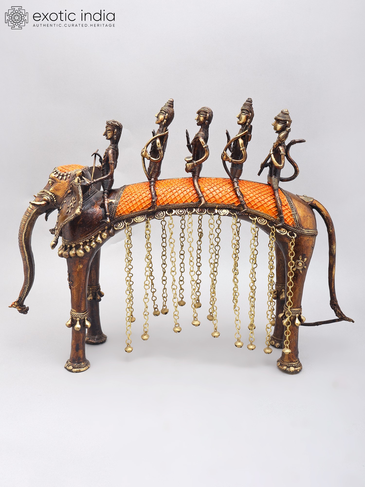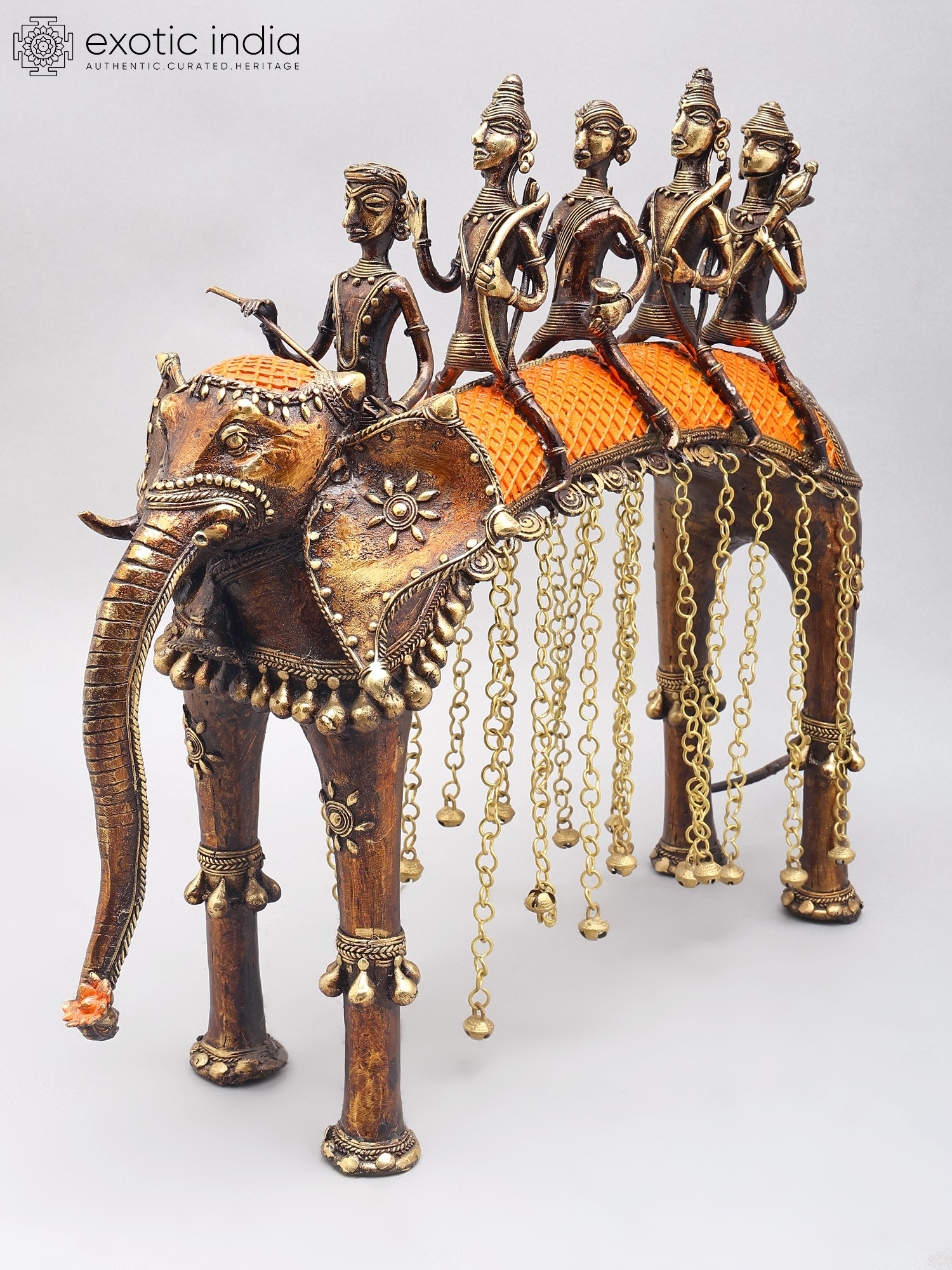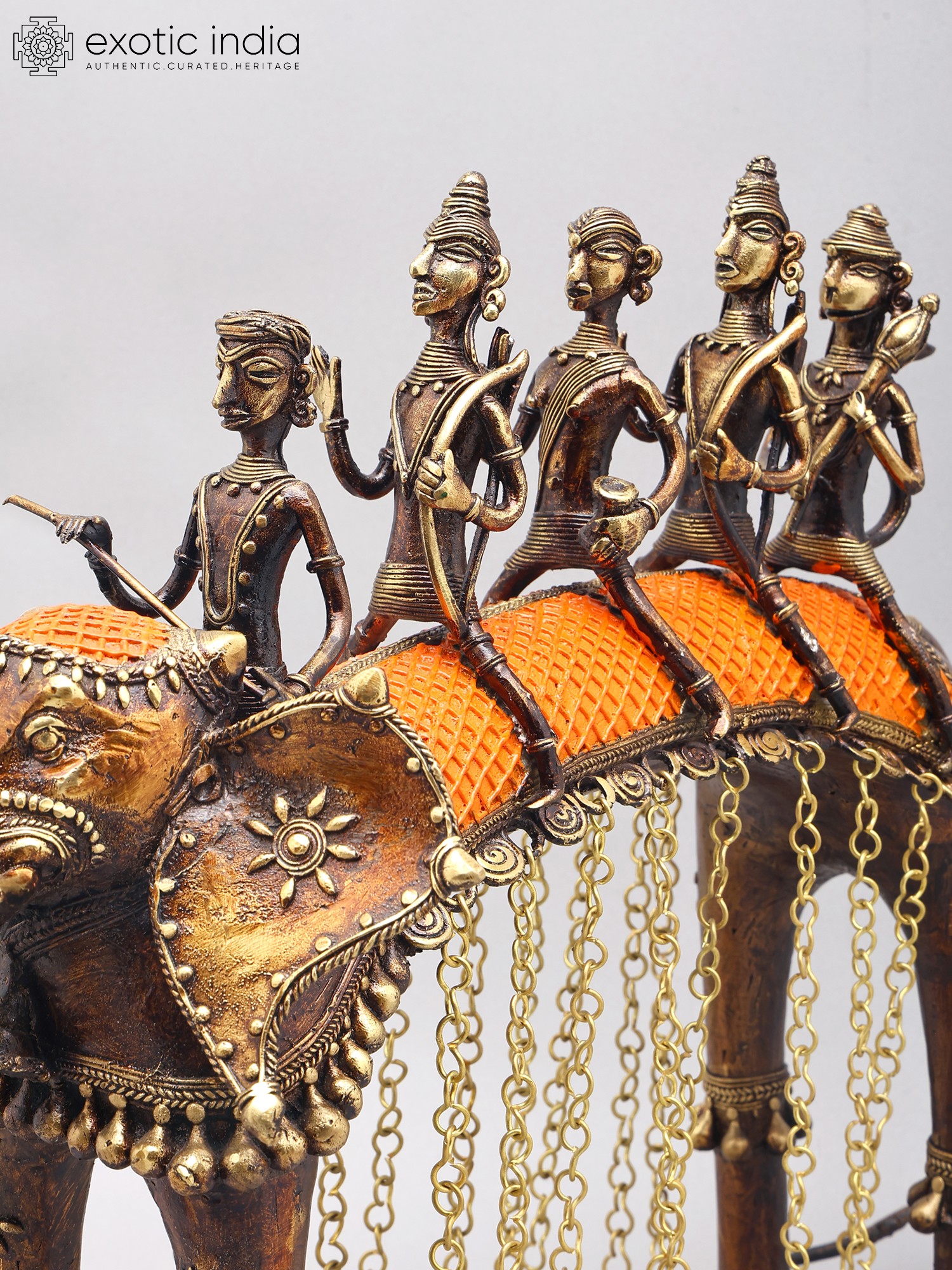 Features a tribal art style with intricate detailing on figures and elephant.