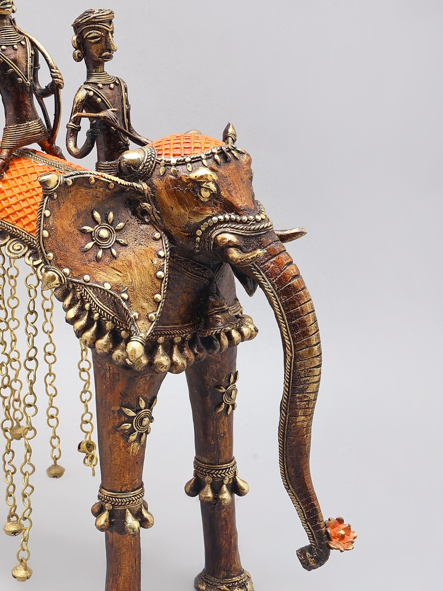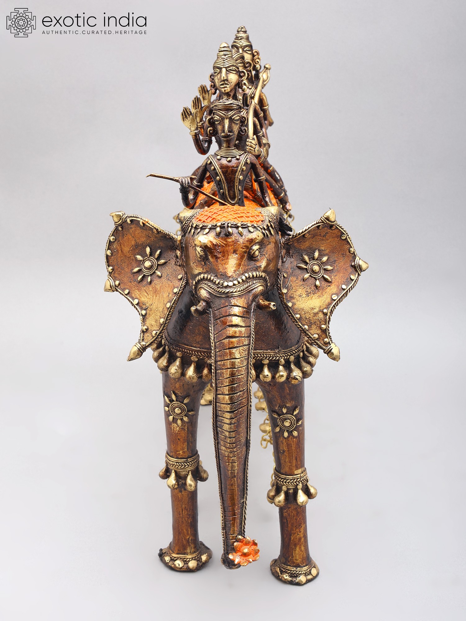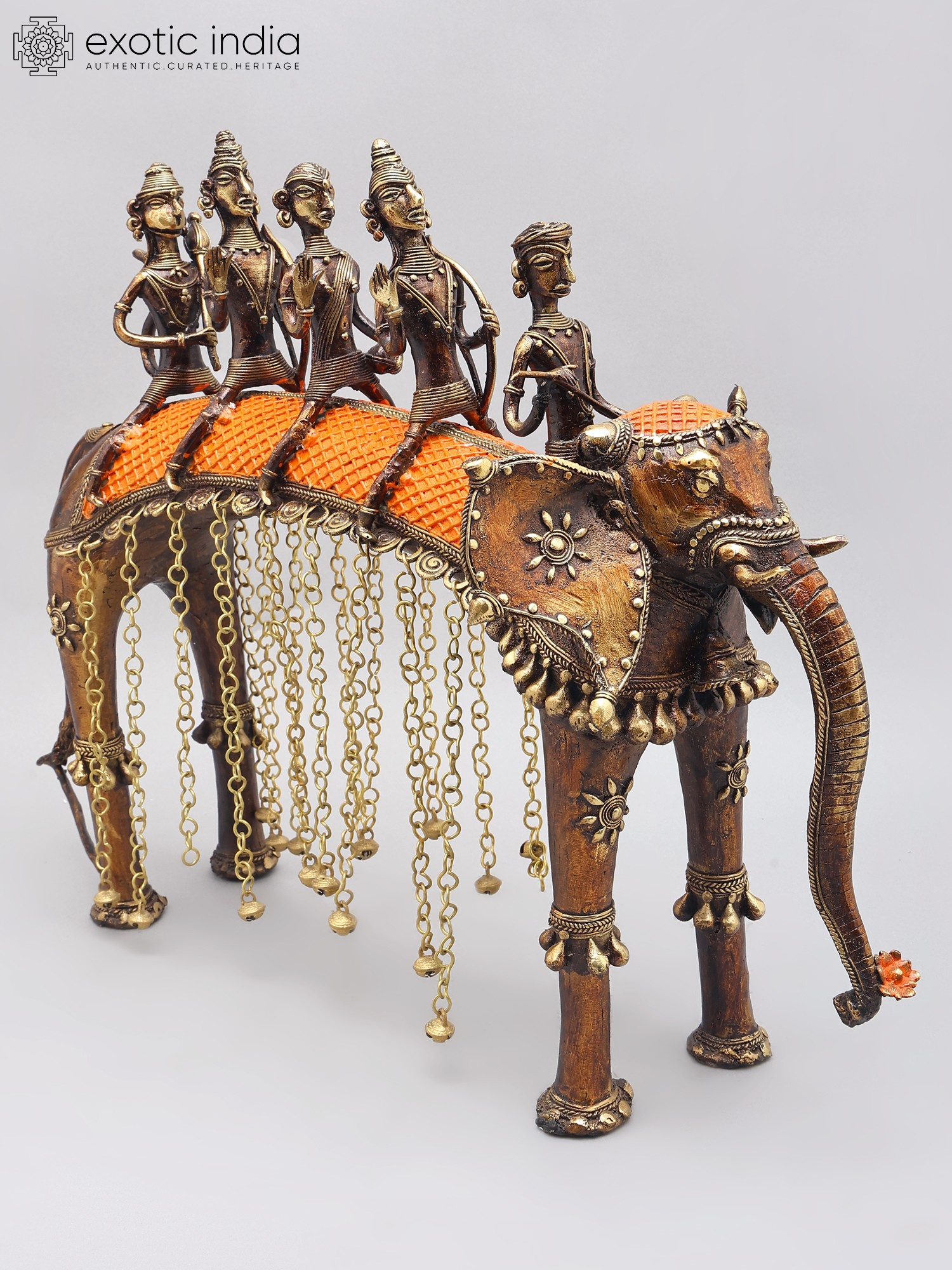 Features a tribal art style with intricate detailing on figures and elephant.