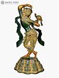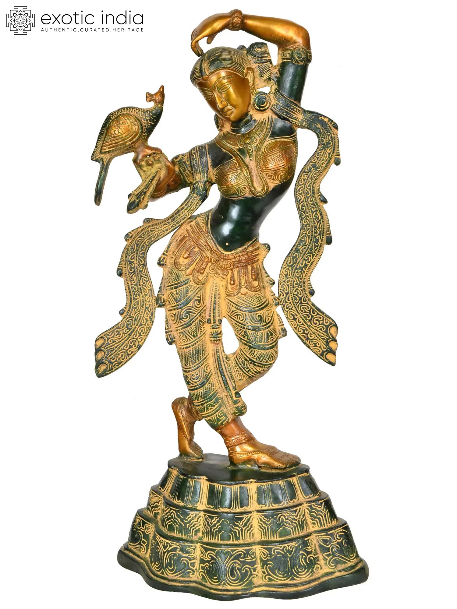 In the right hand, she holds a peacock, a sign of purity, love, harmony and truth, complementing to her act of applying vermillion for her love. She is communicating with the bird while applying sindoor, expressing her desires- full of lusture and beauty. She wears a sumptuous patterned dhoti and a similar scarf dancing down from her shoulders.