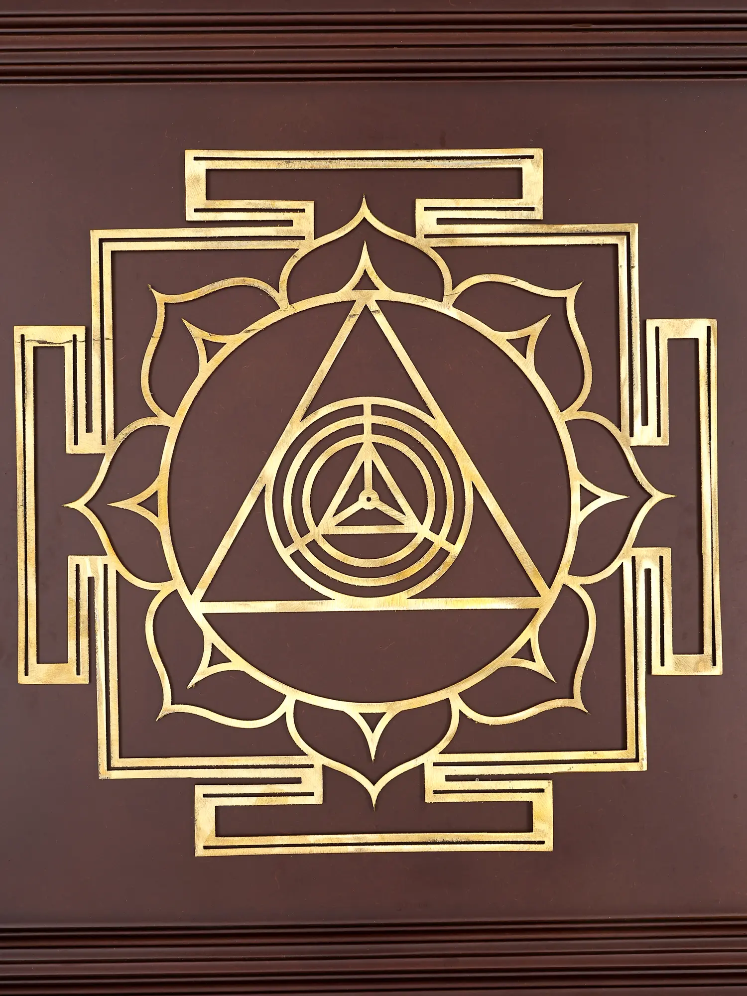 This yantra is masterfully constructed, with the lustrous brass radiating a warm, inviting glow against the deep, polished wood. The brass, known for its purifying properties and its association with Lakshmi, the goddess of wealth and prosperity, is intricately worked to create sharp, defined lines and patterns. The wooden frame provides a grounding and natural aesthetic, enhancing the yantra's presence and making it a distinguished piece of wall decor. The substantial size of the yantra ensures it commands attention, serving as a powerful devotional aid in your home or sacred space. Whether used for daily puja, meditation, or simply as an inspiring presence, this yantra is a profound testament to both artistic skill and spiritual depth, inviting blessings and positive transformation into your life.