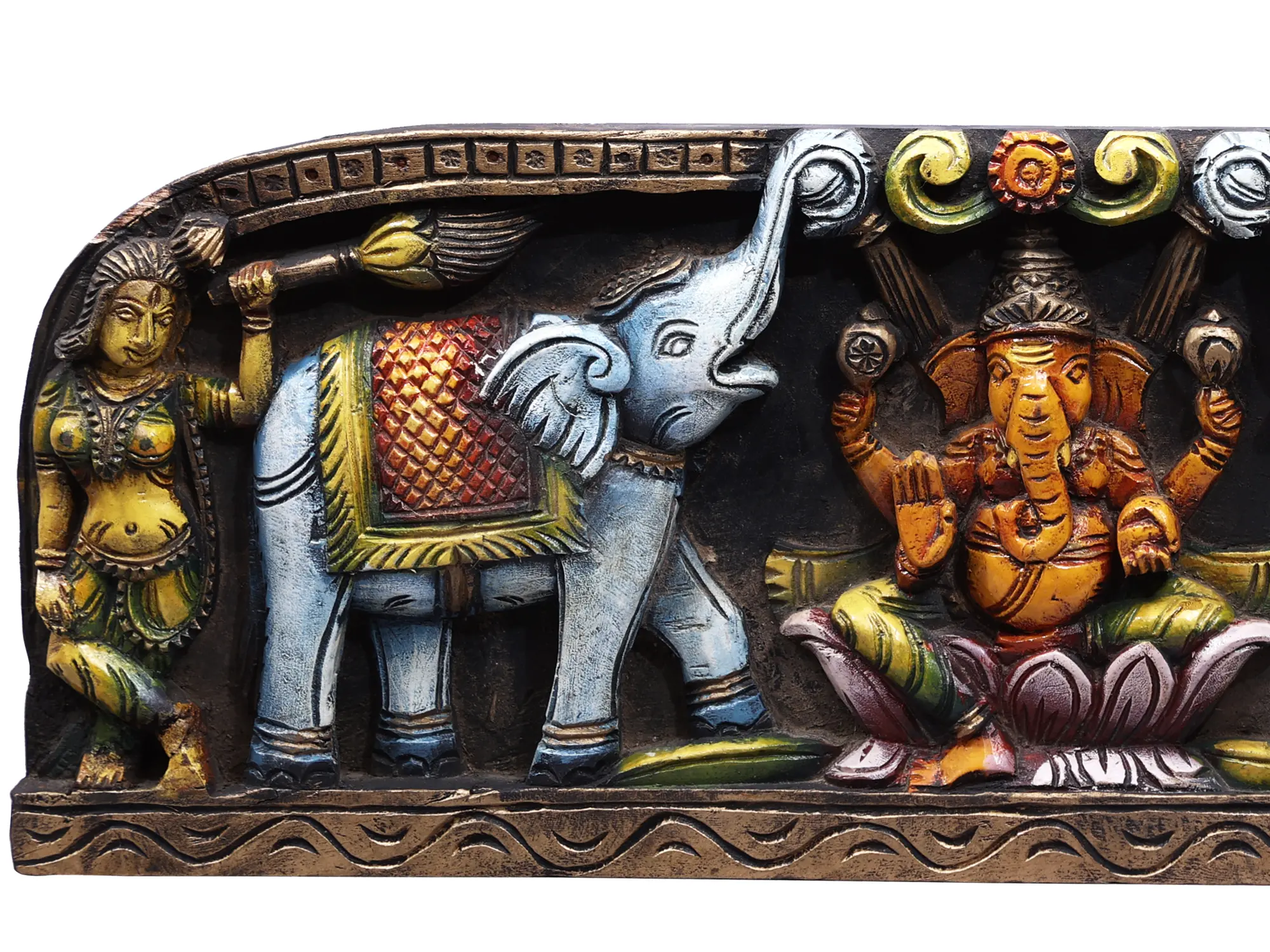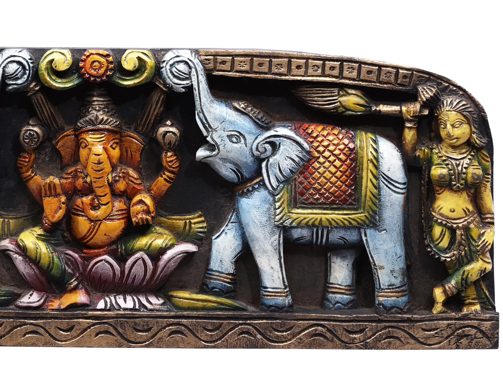 Enthroned on a lotus seat, with elephants joyously serving him and female attendants bearing the flying whisk (an emblem of royalty), Ganesha in this wooden artwork represents his reign over the fields of auspiciousness, luxury, and wisdom- virtues that are integral for the ideal and fulfilled life.