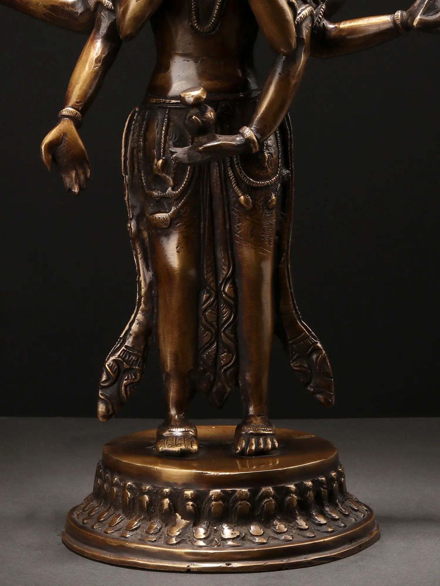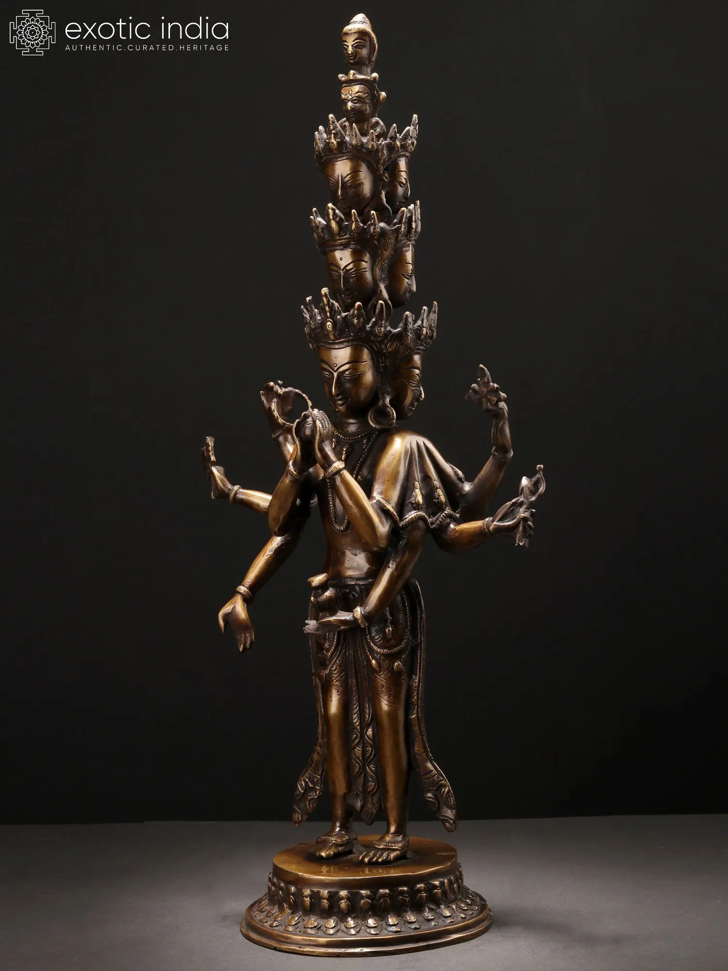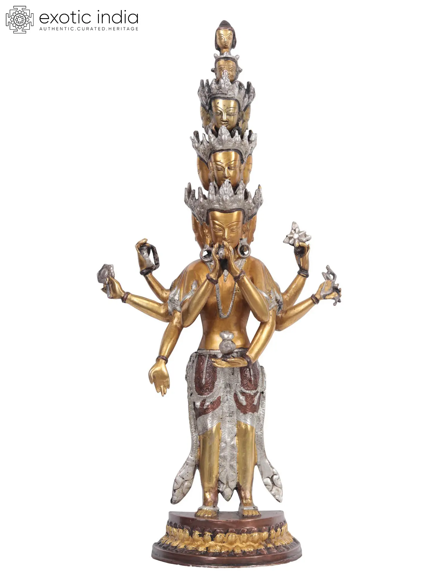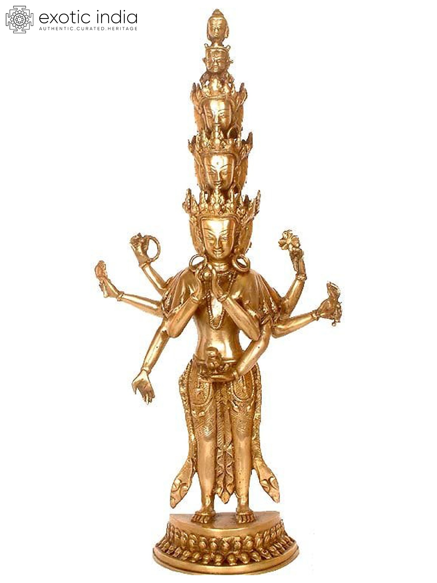 This brass statue is a testament to the enduring artistic traditions of India, where countless generations of artisans have dedicated their skills to creating representations of deities and bodhisattvas. This form of Avalokiteshvara is a powerful reminder of the potential for compassion within each of us, and it serves as an inspiration to cultivate kindness, empathy, and the aspiration to relieve the suffering of others. The intricate detailing, the balanced proportions, and the overall sense of serenity radiating from this handcrafted piece, underscore the deep devotion that inspires its creation. The statue is a beautiful reminder of the power of compassion to transform the world.