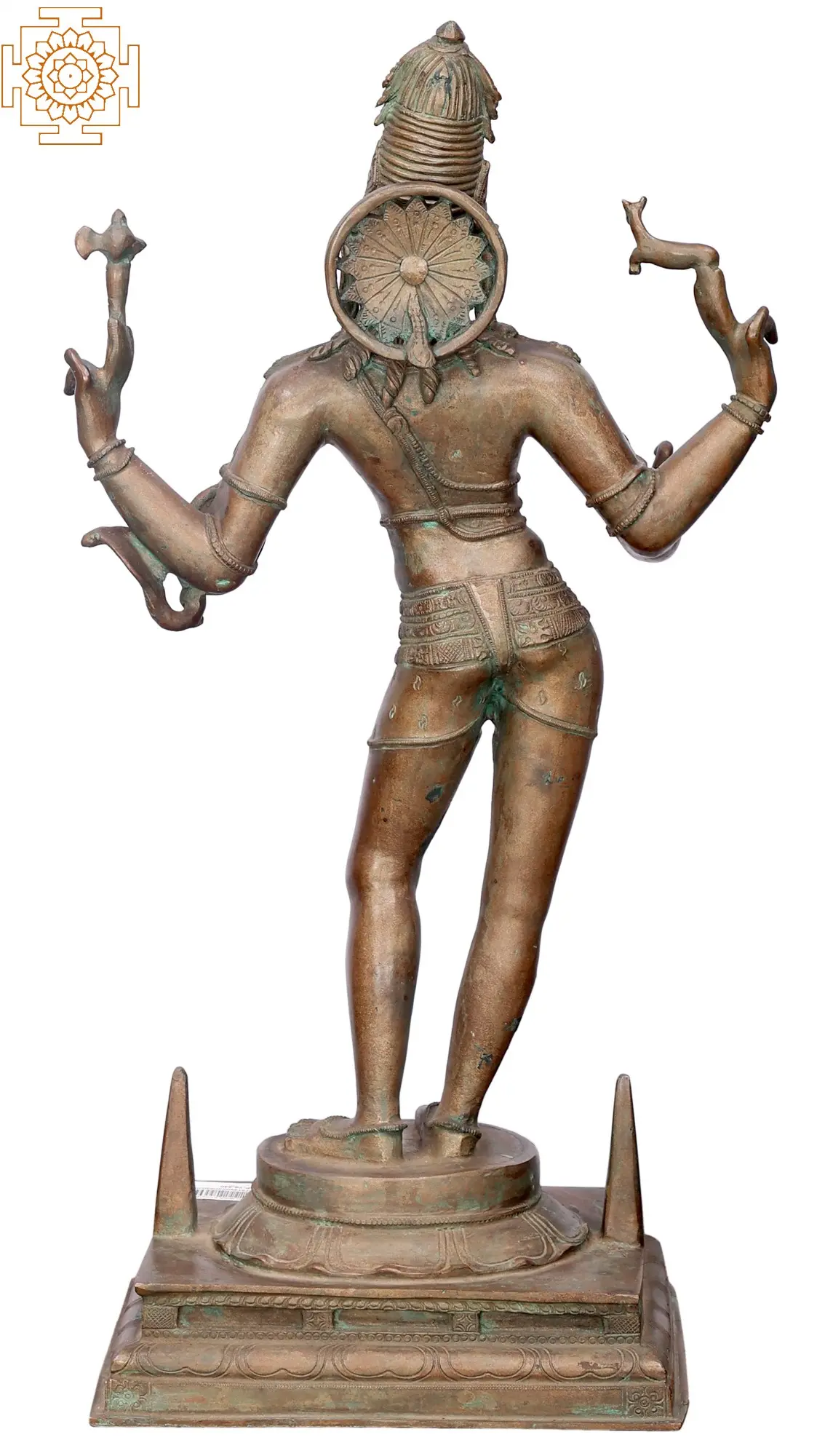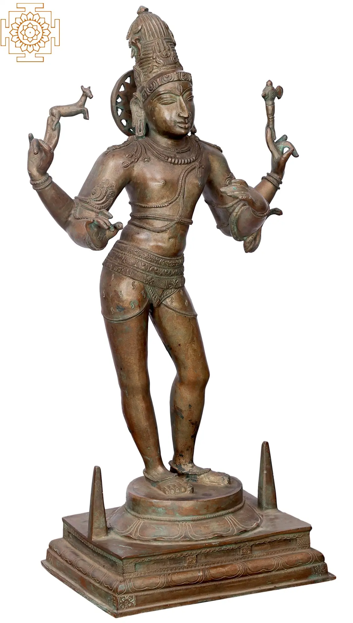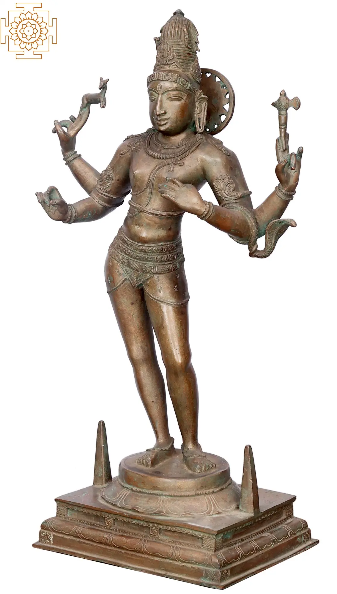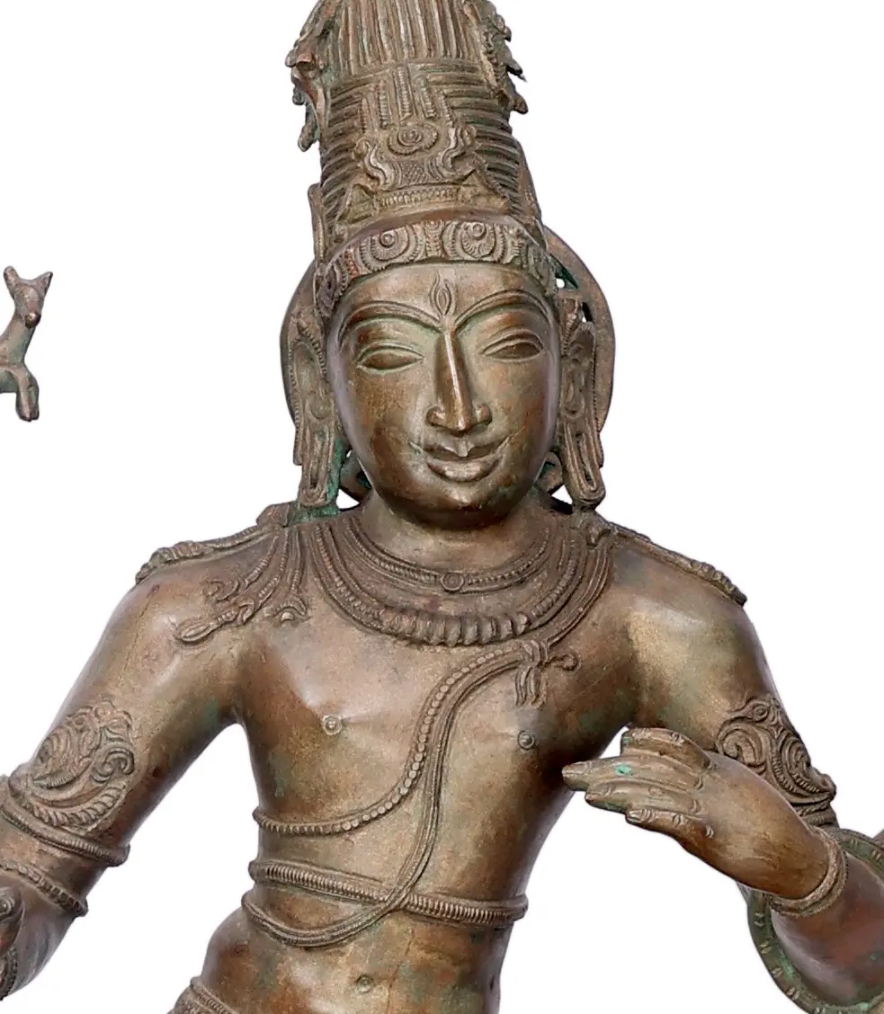 This beautiful bronze image shows Shiva as Pashupati, standing in a graceful pose on a pedestal with two handles, suggesting that it is a Chala or a movable icon. The divine form of Shiva is adorned with a Jatamukuta (crown made with his tresses), a third eye on his forehead, delicate necklaces, a Yajnopavita with two strings, Udarabandha or belly belt, and a dhoti made from tiger hide.