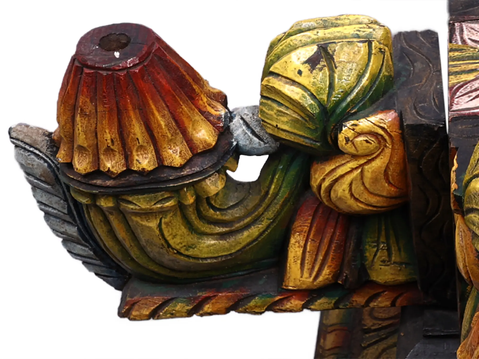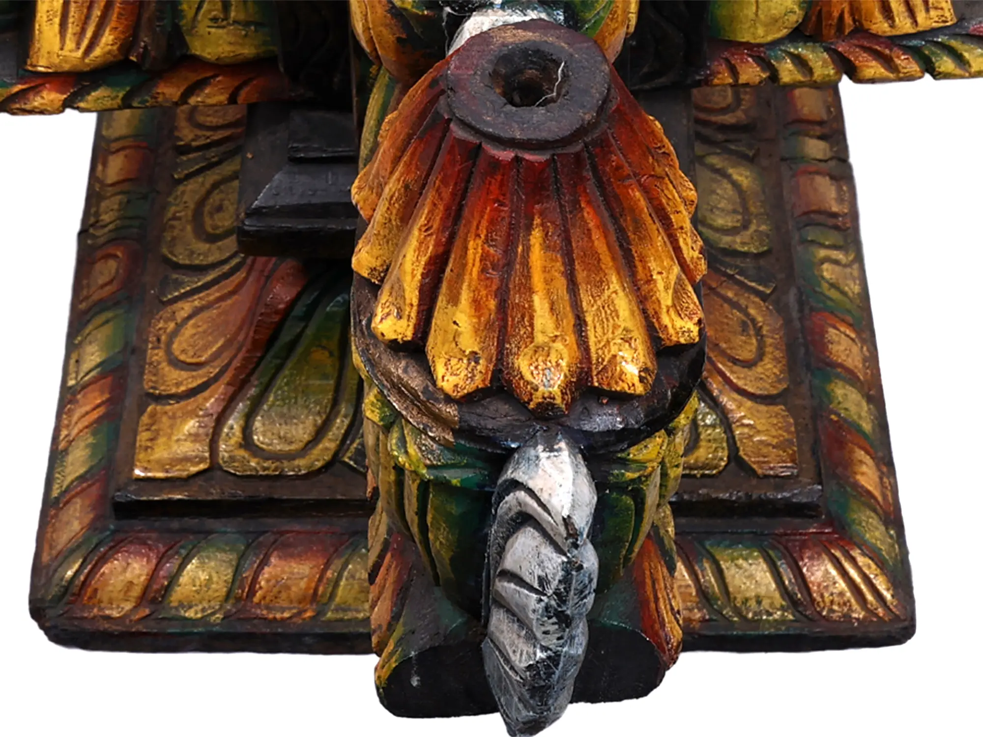 This exquisite wooden creation is more than just a decorative piece; it's a testament to ancient artistry and a symbol steeped in rich cultural and spiritual significance. Handcrafted from wood, this base features a vibrant palette of colors, including deep reds, sunny yellows, and lush greens, evoking the boundless beauty of nature and the auspiciousness of sacred rituals. Each carved detail, from the delicate petal-like formations to the stylized avian motifs that suggest the grace of swans or mythical