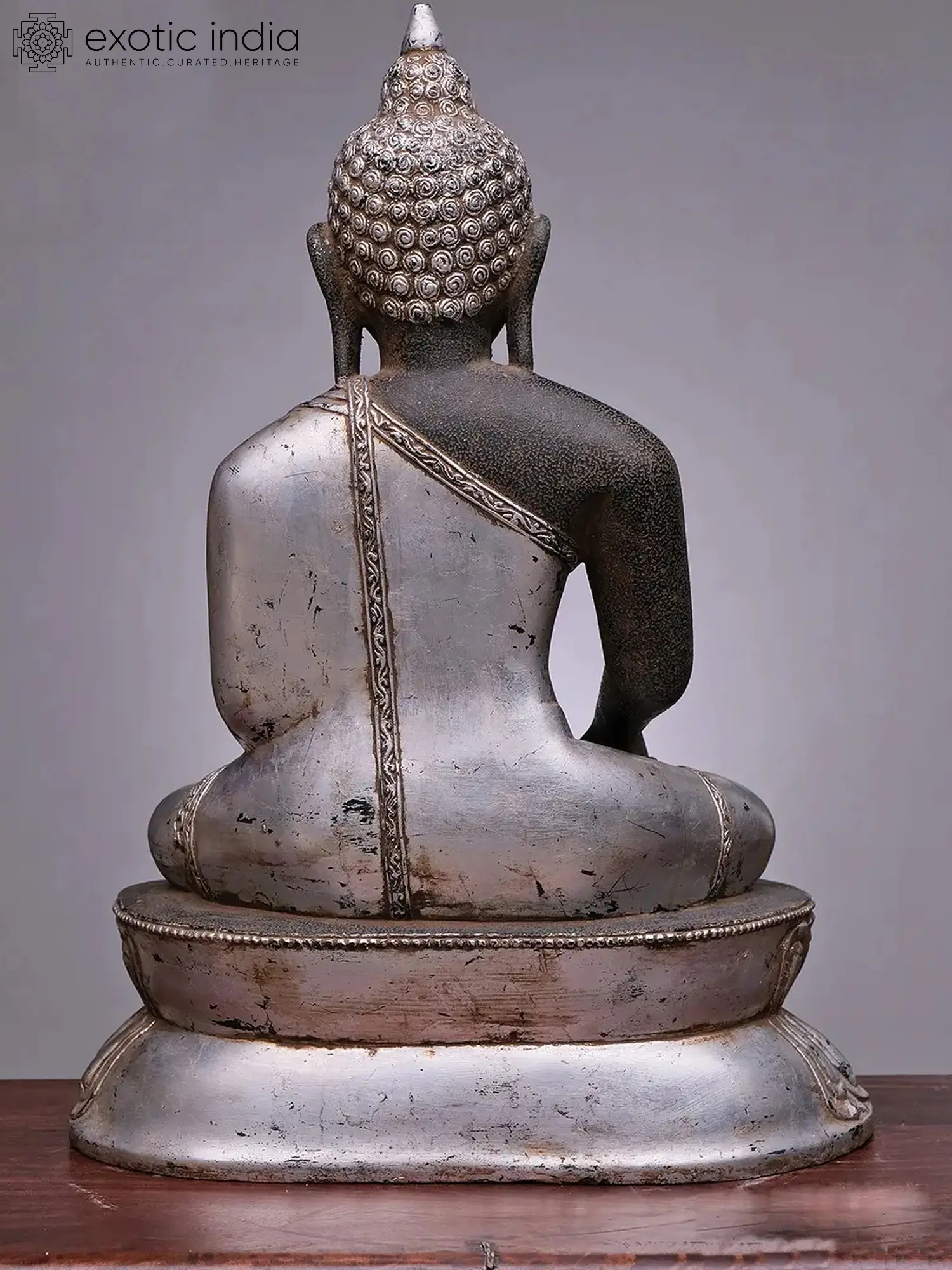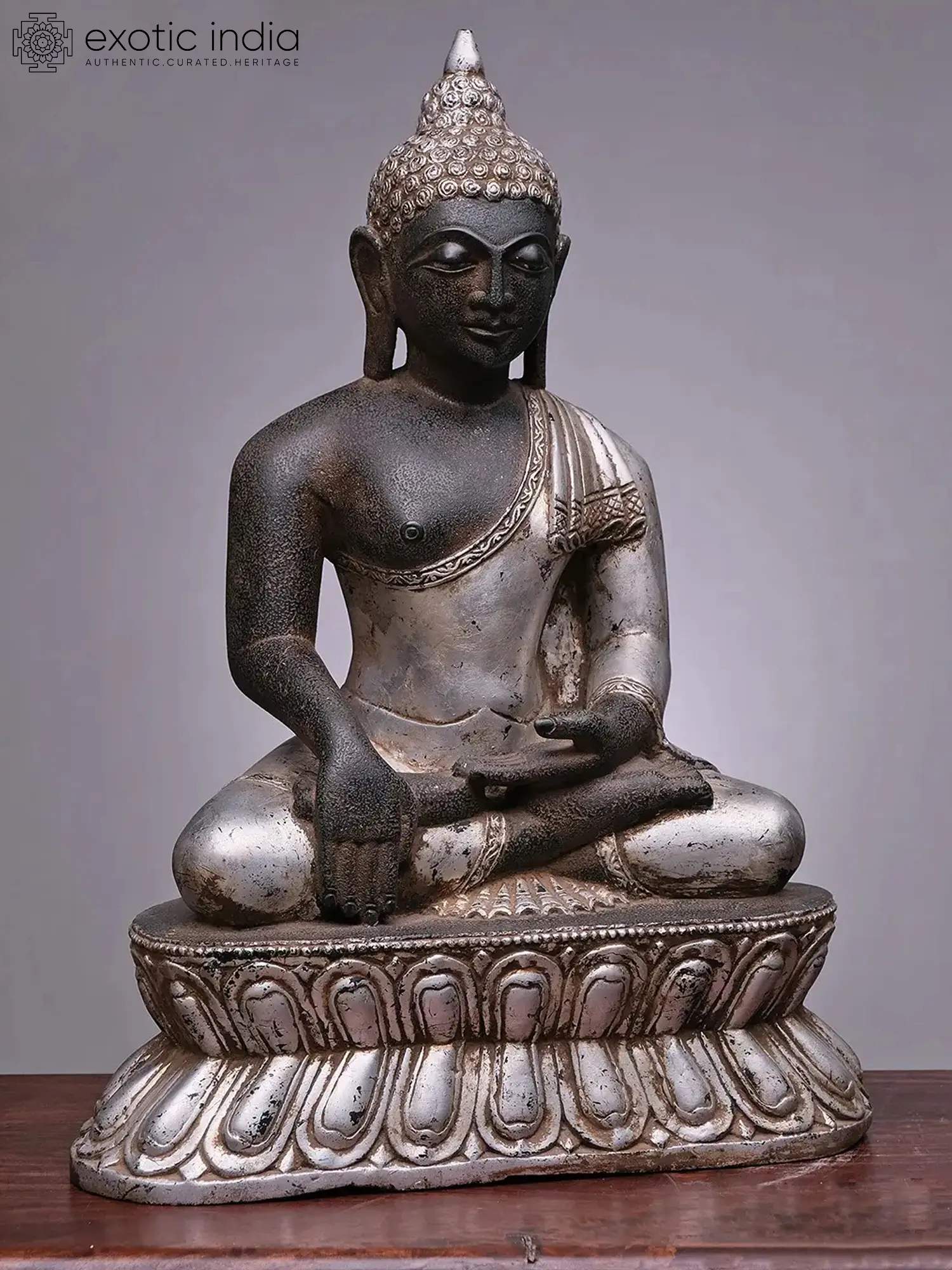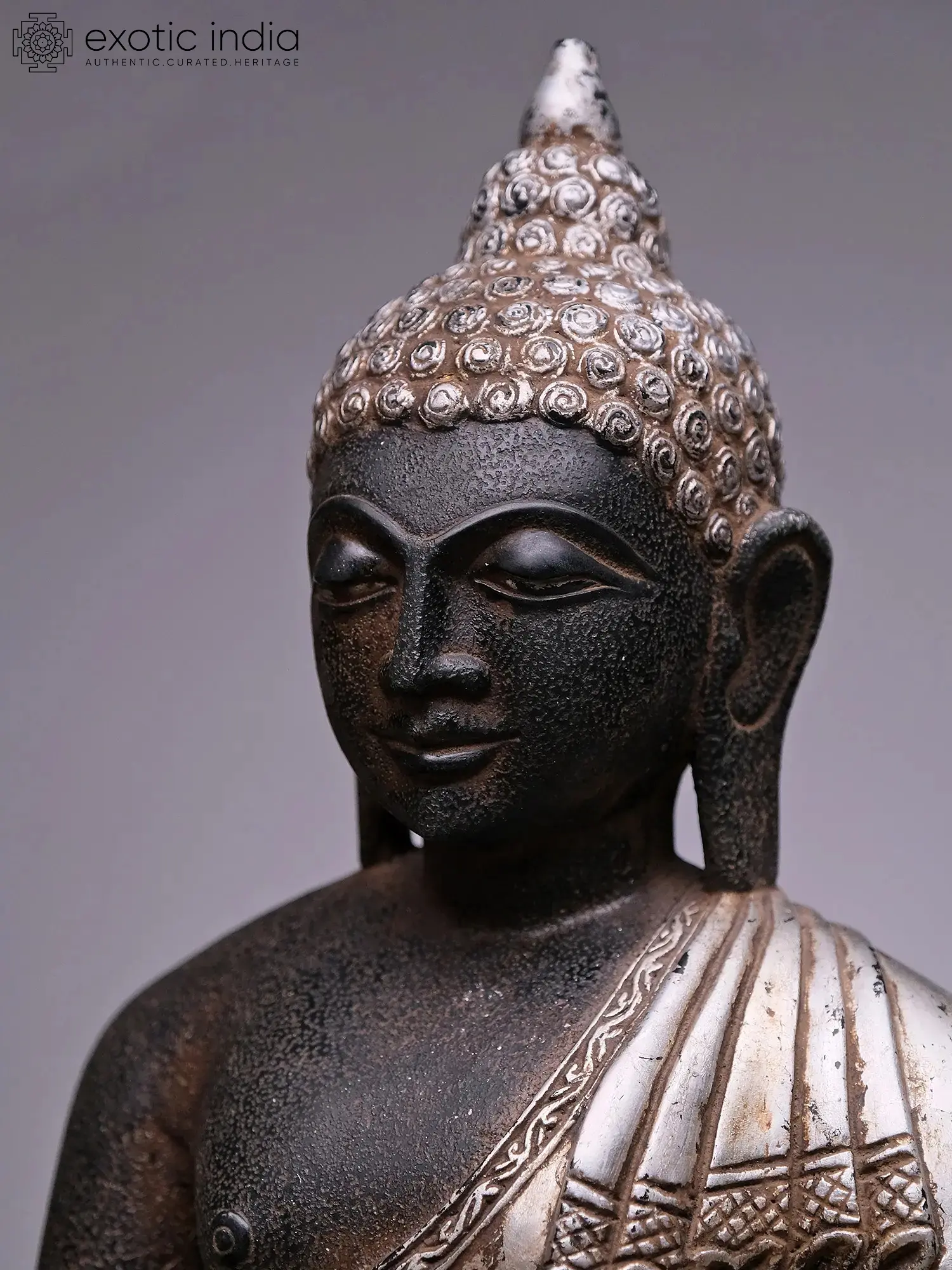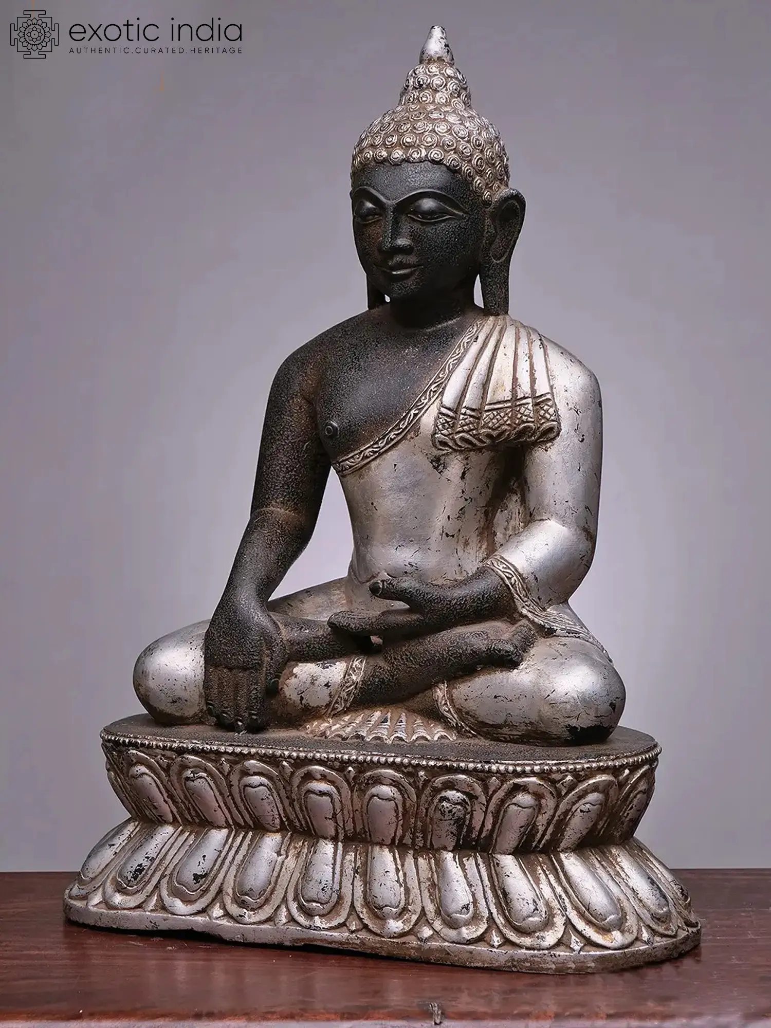 Behold a magnificent representation of the awakened one, Lord Buddha, captured in a serene seated posture upon a lotus pedestal. This exquisite statue, meticulously handcrafted from luminous white marble, embodies the profound peace and enlightenment that Siddhartha Gautama achieved. The dual-toned finish, with its striking contrast between the dark, textured visage and the gleaming silver-hued robes and body, adds a unique depth and gravitas to the piece. The intricate detailing on the crown, the delicate folds of the sanghati (monastic robe), and the serene expression on the Buddha's face all speak to the skill of the artisan and the spiritual reverence imbued in its creation. ––––––––––