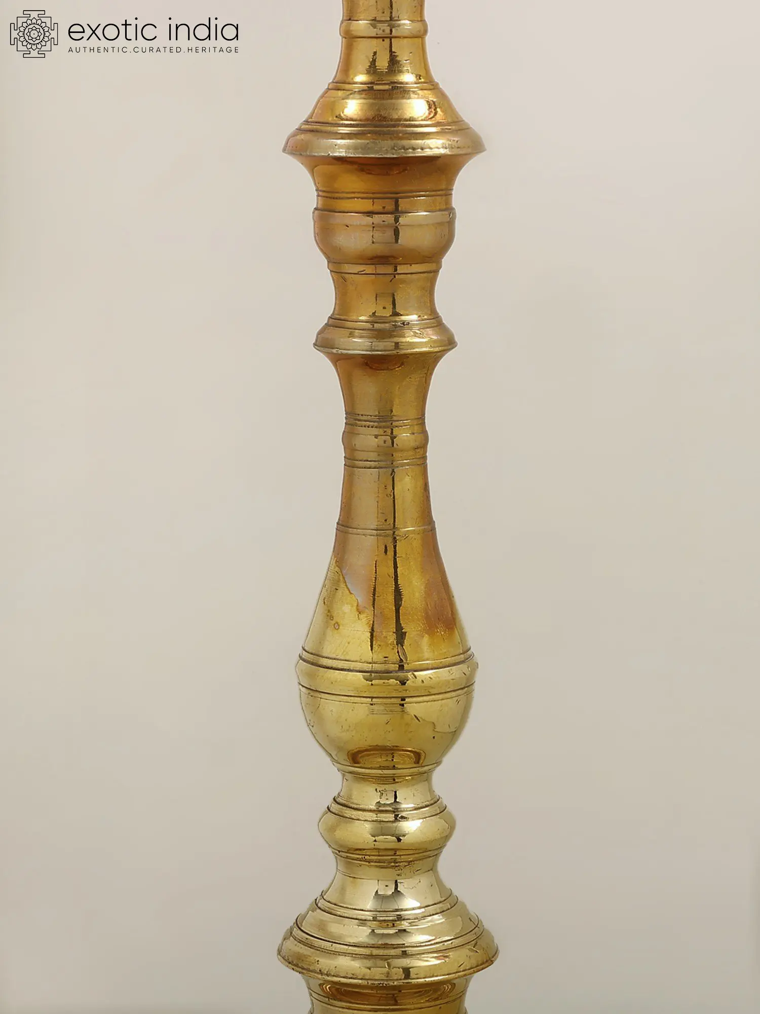 Fashioned from brass, the Annam lamp that you see on this page has a moderately long, somewhat thick stem. Its edges undulate with perfect symmetry, making for a curvaceous silhouette. The dia tray, which is located right at the foot of the hamsa and at the zenith of the stem, comprises five continuous mouths.