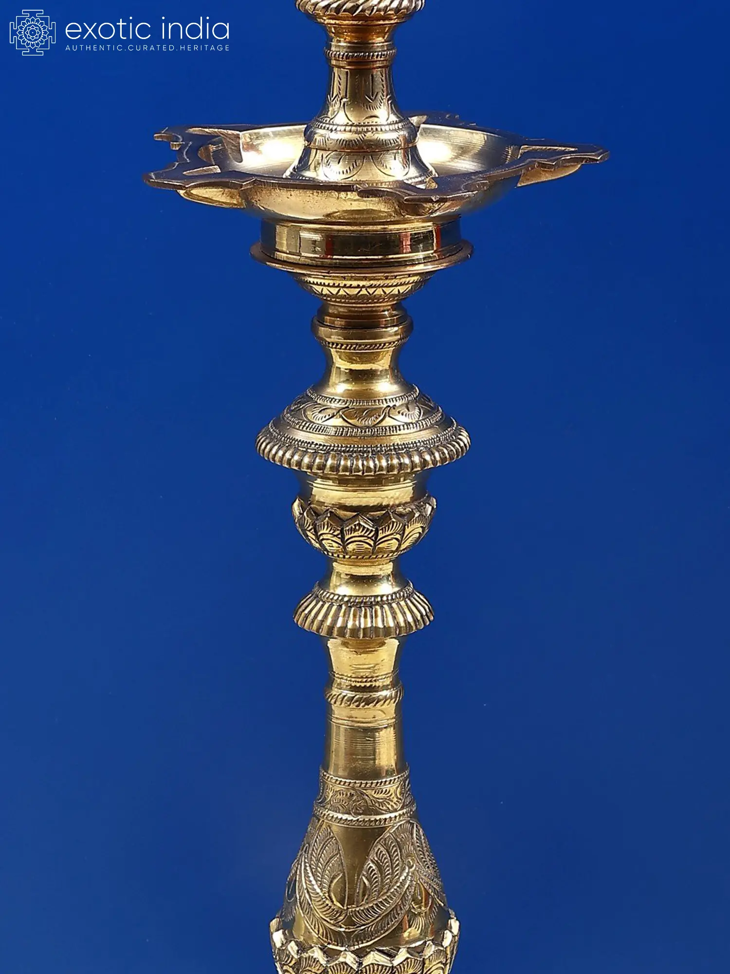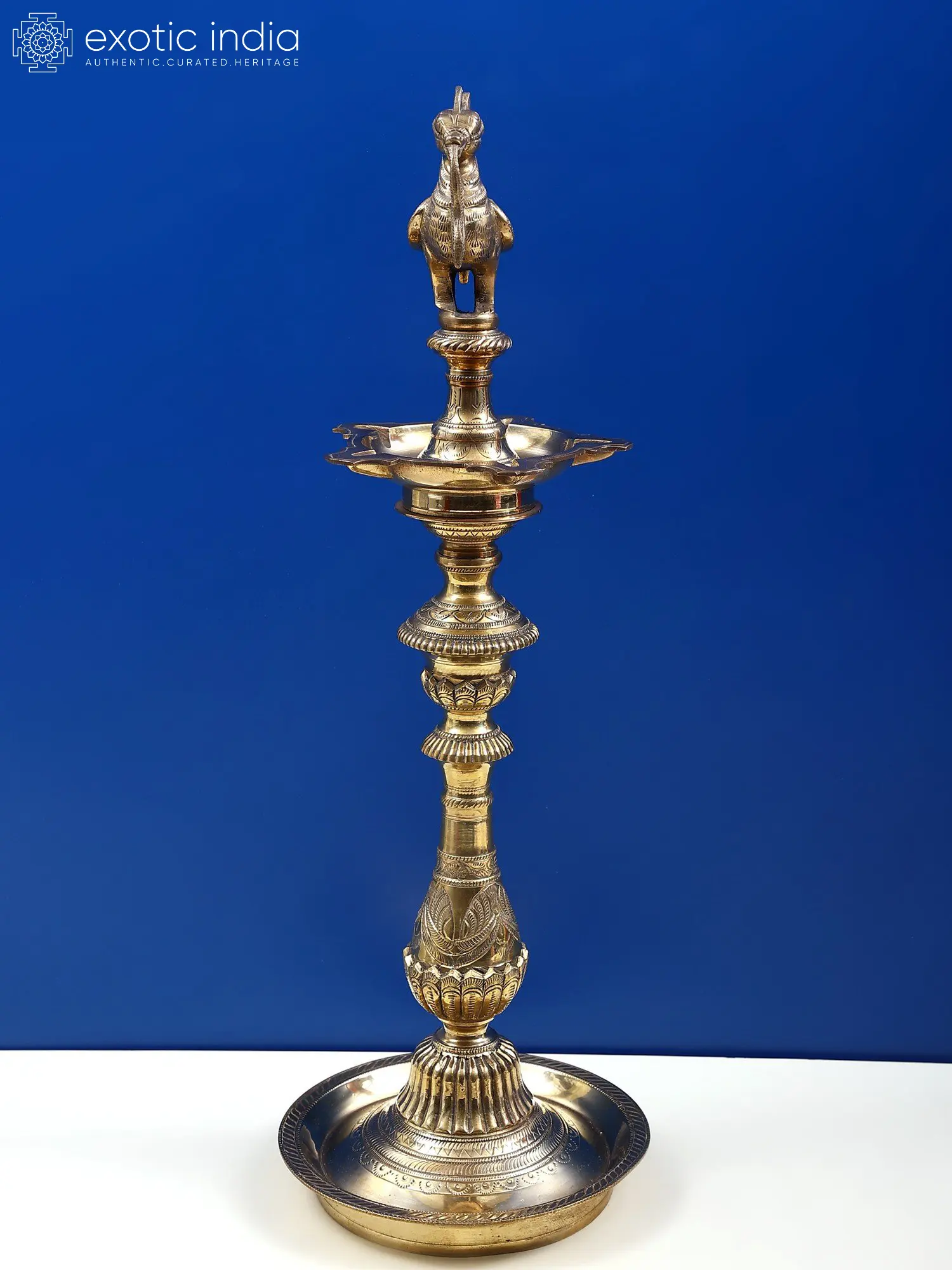 A typical South Indian light that may be found in houses and temples is the Kuthu Vilakku, also known as the Peacock Oil lamp. It is made of brass and has five wicks: one for the body, mind, intellect, ego, and soul aspects of human life. The legendary Annam (peacock) is the epitome of grace and dexterity. This lamp has a central oil basin with five wicks and a columnar form. A disc serves as the bottom support for the entire construction. This lamp represents self-illumination and harmony, spiritual enlightenment, and the manifestation of divine qualities in one's life. It also symbolizes these things thanks to its wonderful and sturdy stand.