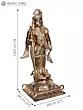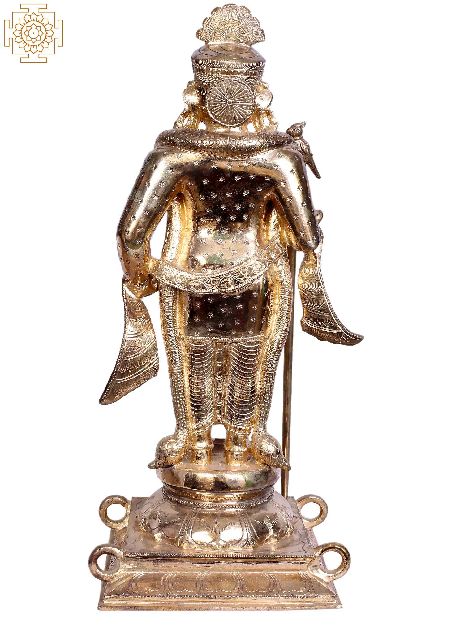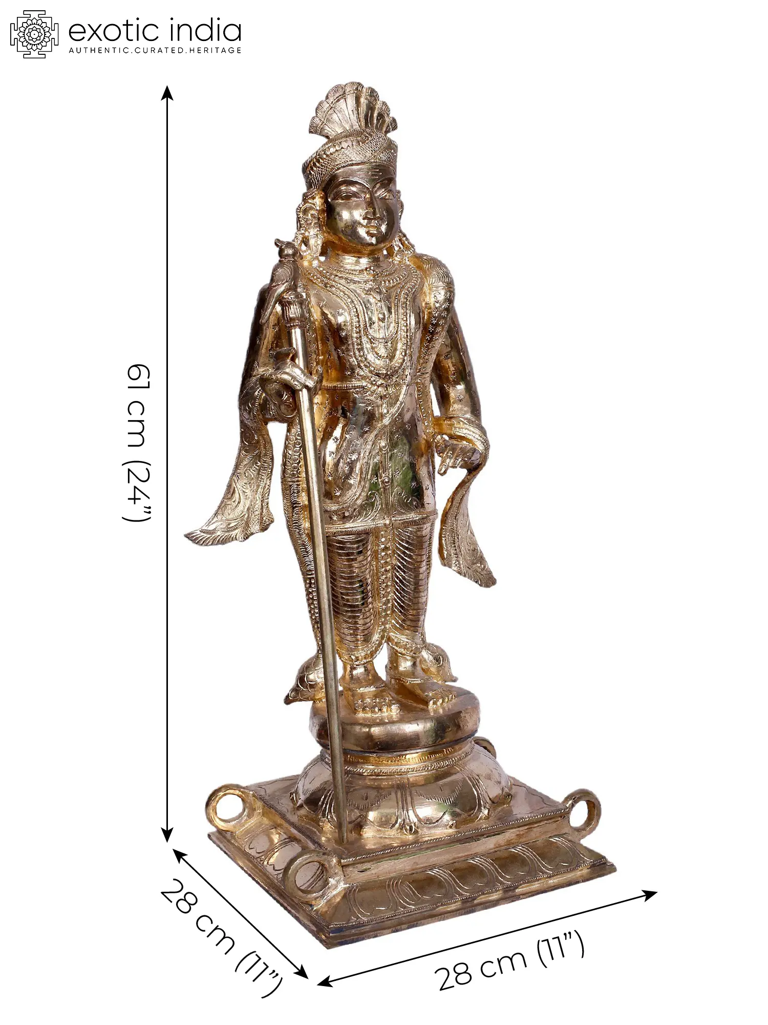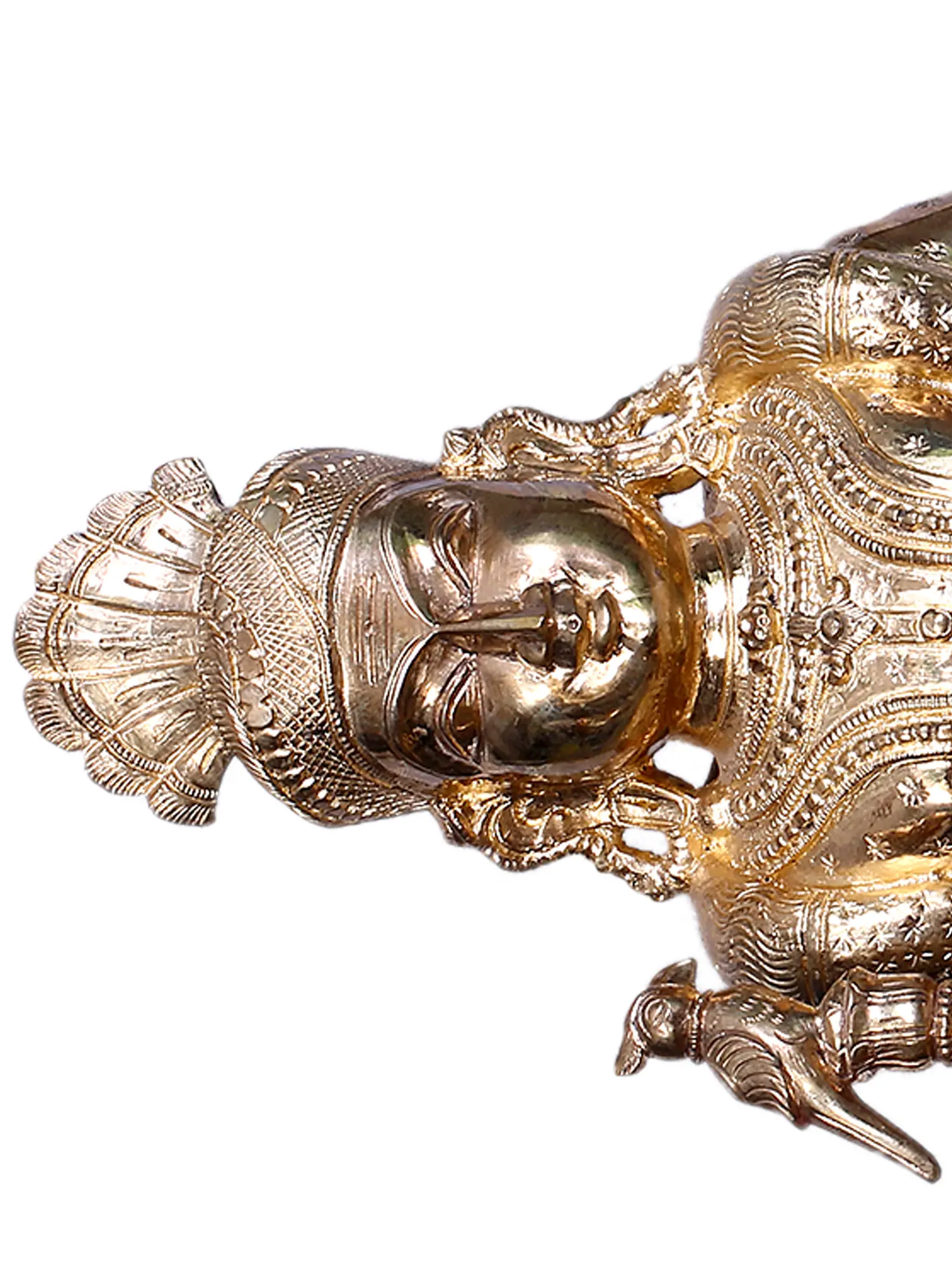 Standing in divine splendour, Kartikeya, “the celestial warrior”, the beloved Son of “Goddess Parvati and Lord Shiva”, commands awe. Clad in resplendent regalia, his form exudes majesty as Kartikeya, also known as cradles “ShaktiVel”, the formidable spear bestowed by his divine mother, “Mahadevi Parvati Devi”. A Turban (Pagadi), “a symbol of valour”, graces his noble head. Kartikeya, the embodiment of courage, stands as a testament to familial love and cosmic duty. His gaze, a potent blend of determination and serenity, speaks of a cosmic duty shouldered with grace. Crafted using the ancient “Madhuchista Vidhana (Lost-Wax) technique”, this “Panchaloha Bronze”, artwork, a visual hymn, resonates with the essence of Hindu mythology—depicting the perpetual dance between the mortal and divine, the eternal cycle of creation, and the eternal victory of virtue over chaos.