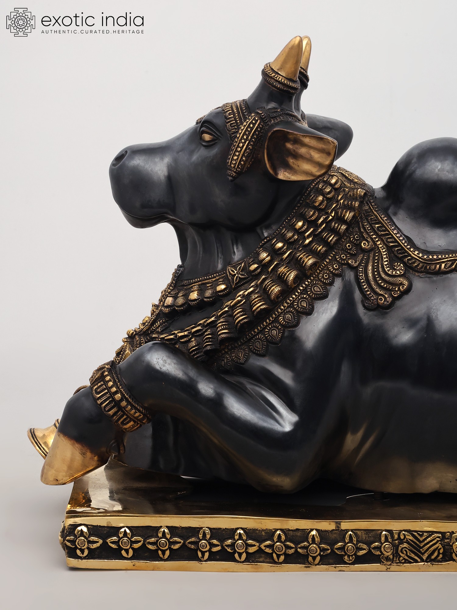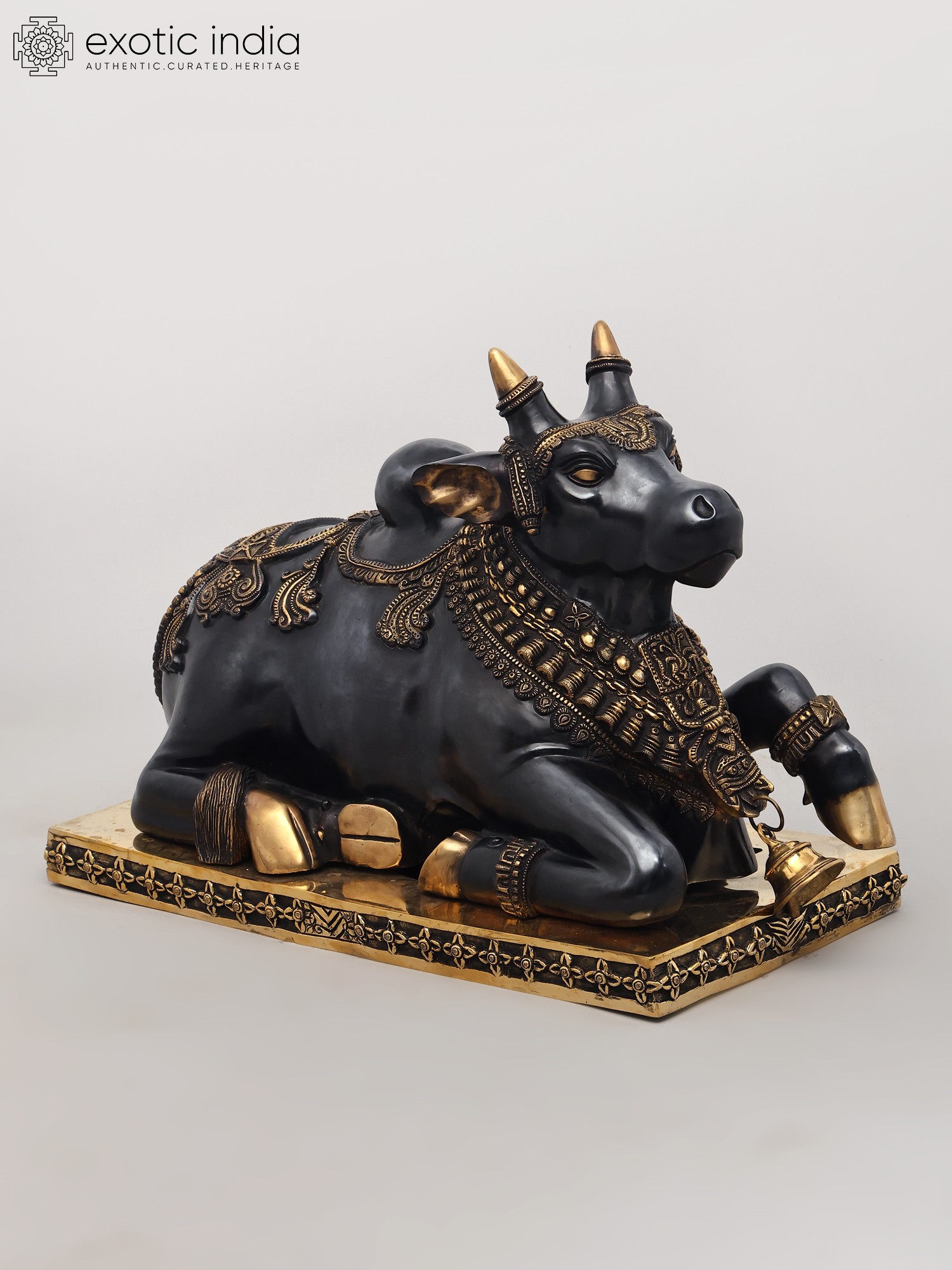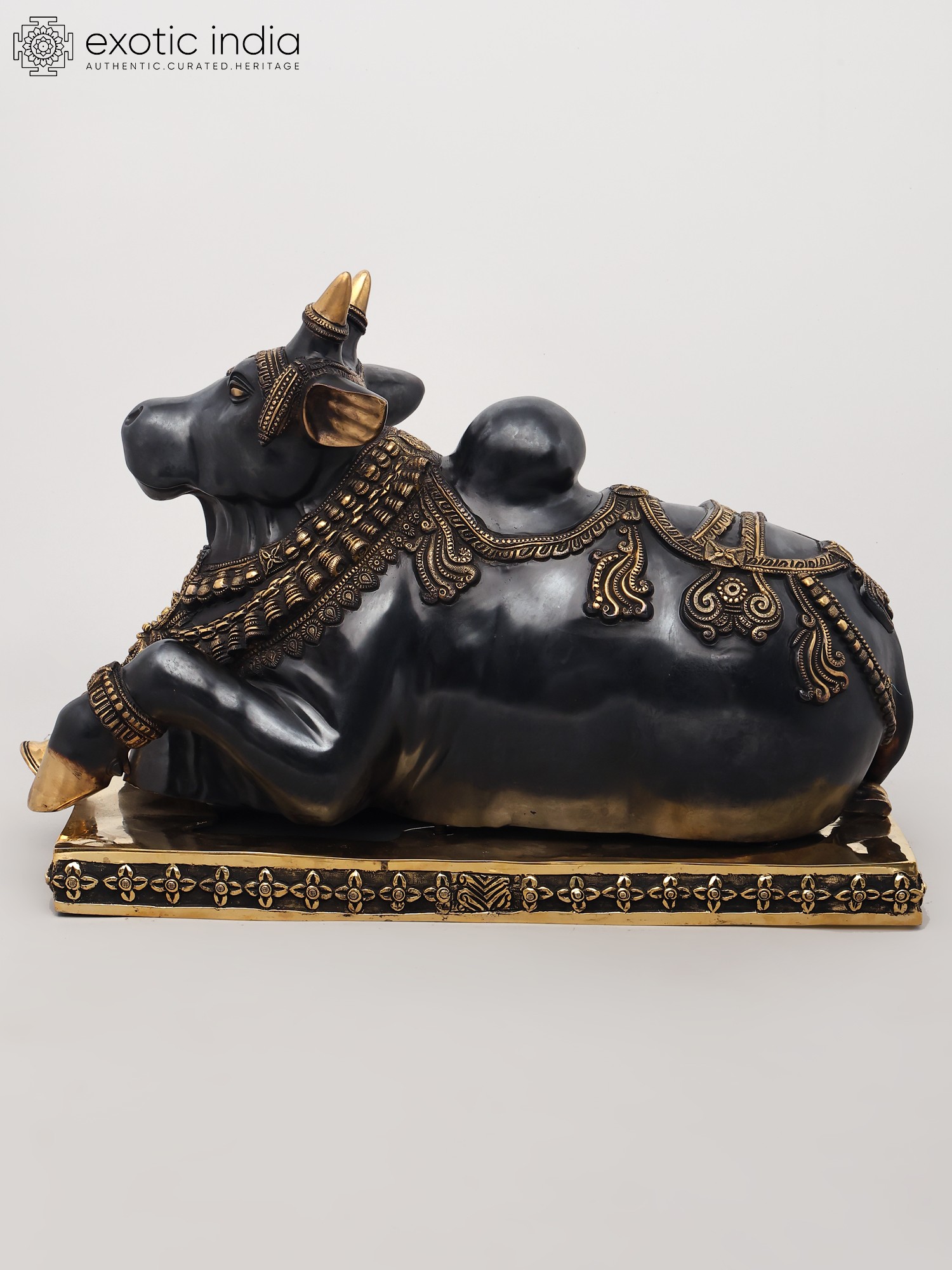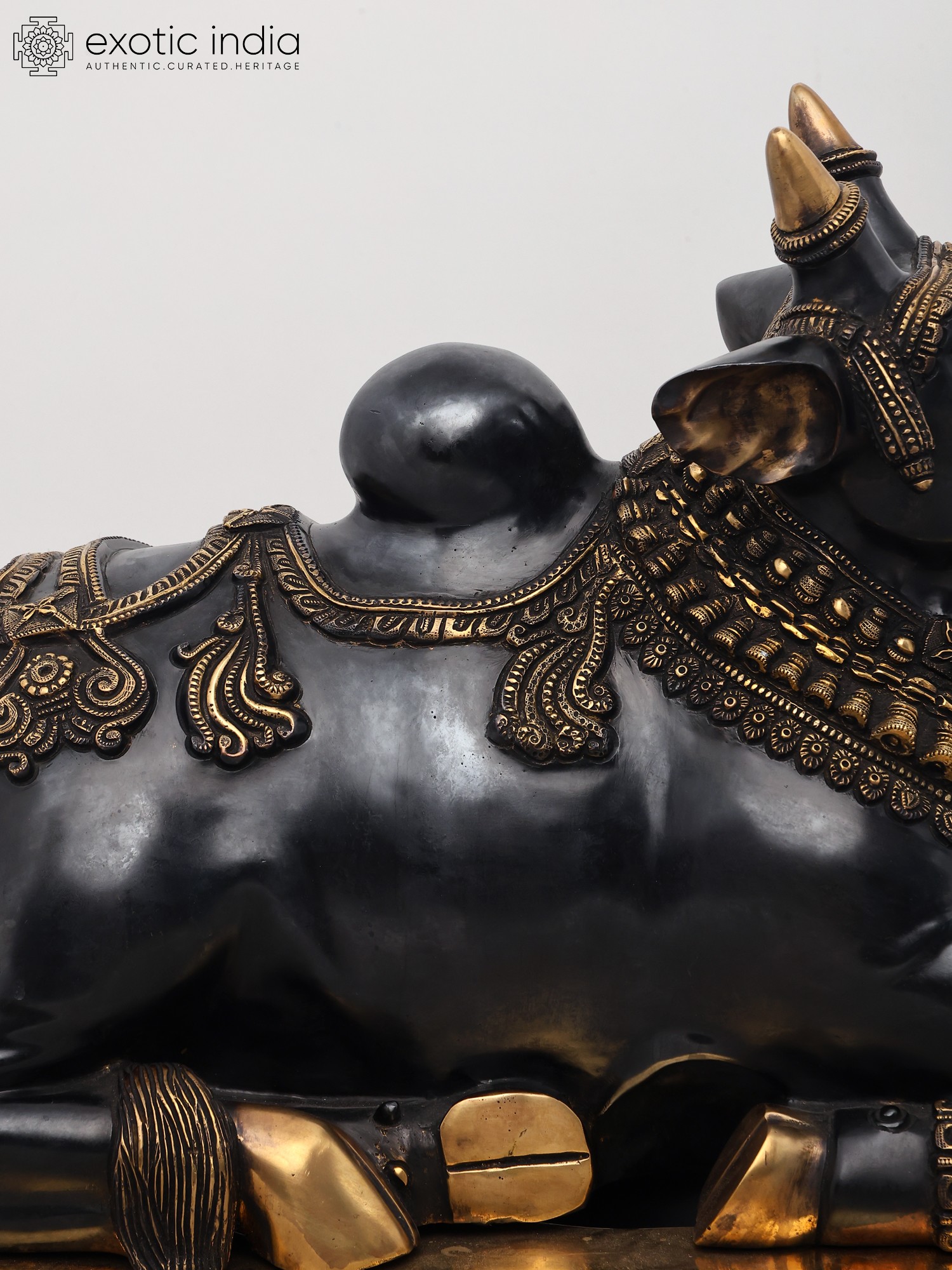 The statue showcases the pinnacle of Indian brass craftsmanship. The sculptor has breathed life into the metal, depicting Nandi in a characteristic resting posture, with folded legs and a calm, introspective gaze. The surface is adorned with intricate carvings and embellishments, suggesting regal adornment. Bands of finely detailed patterns wrap around his neck and legs, reminiscent of ceremonial jewelry. A richly decorated saddle-like covering graces his back, enhanced with scrolling motifs and a beaded fringe. The polished brass gleams, reflecting the light and highlighting the exquisite artistry, making this piece a true testament to the skill of the artisans.