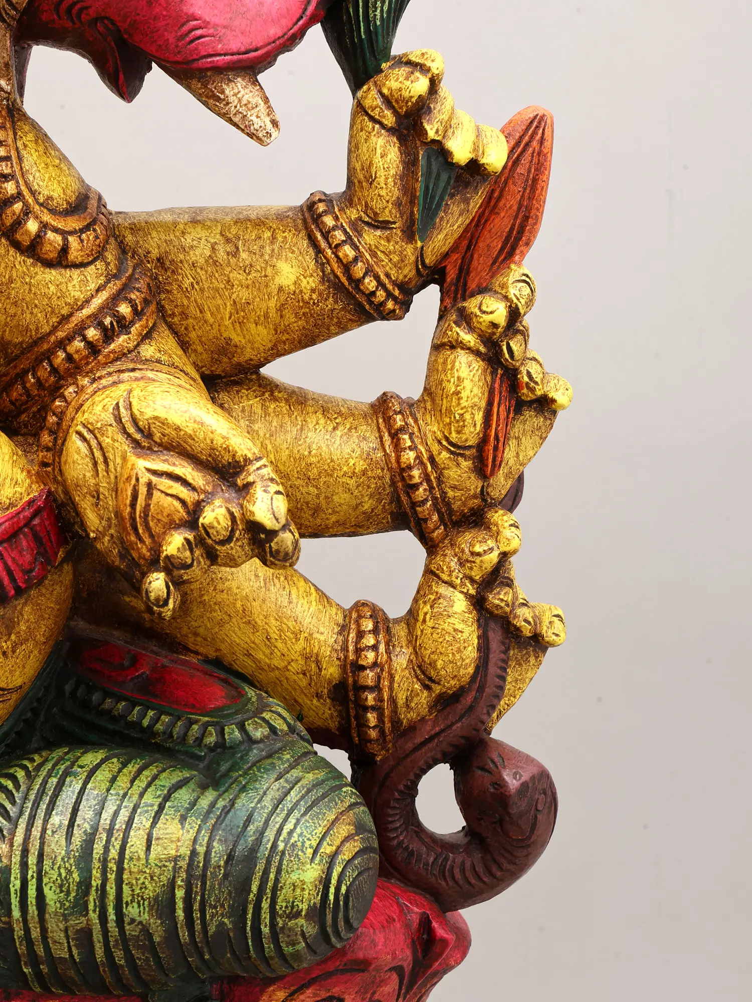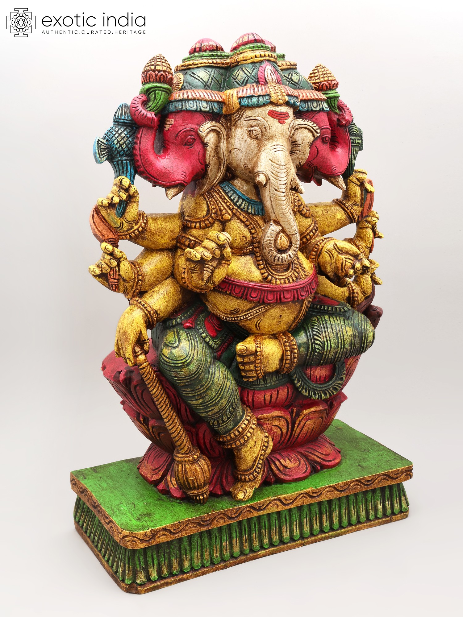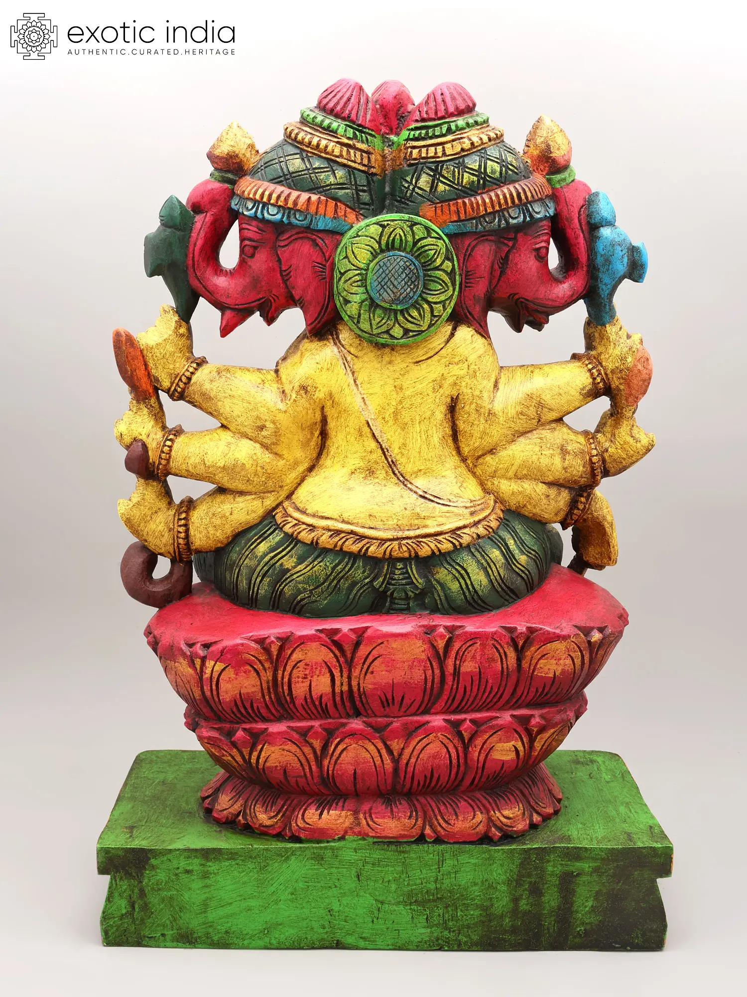 24" Eight Armed and Three Headed Lord Ganesha Seated on Lotus | Wood Carving