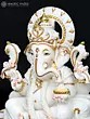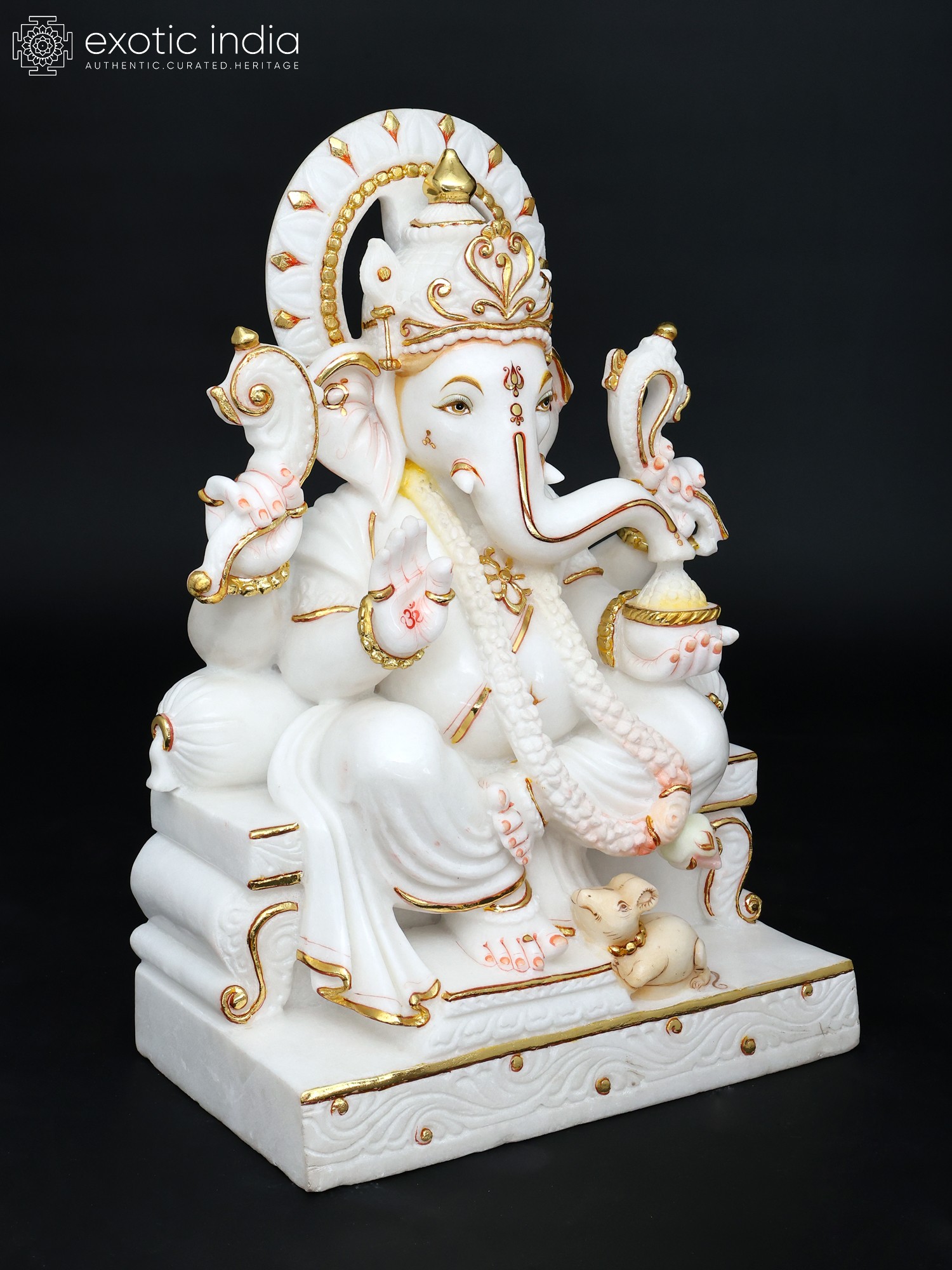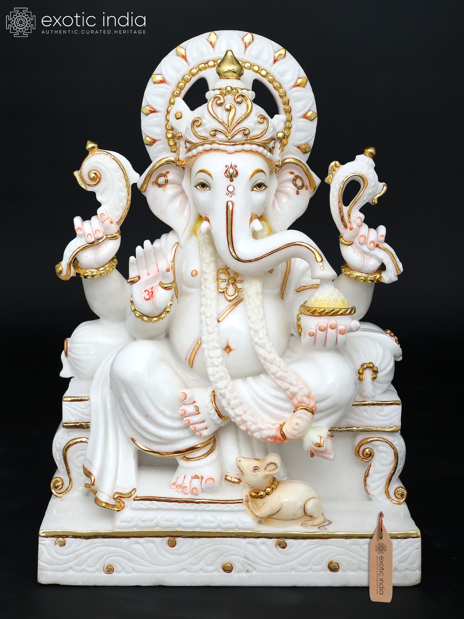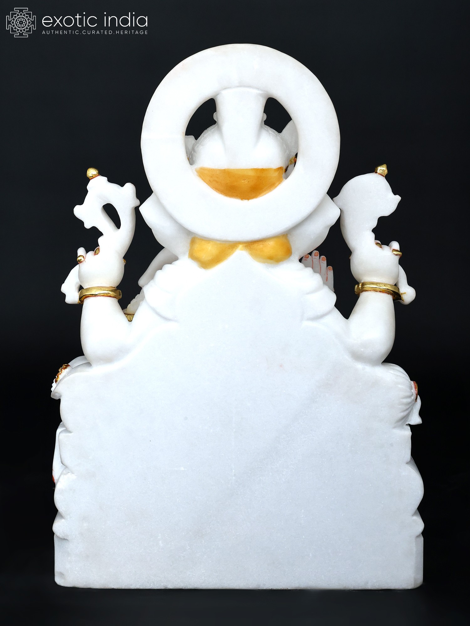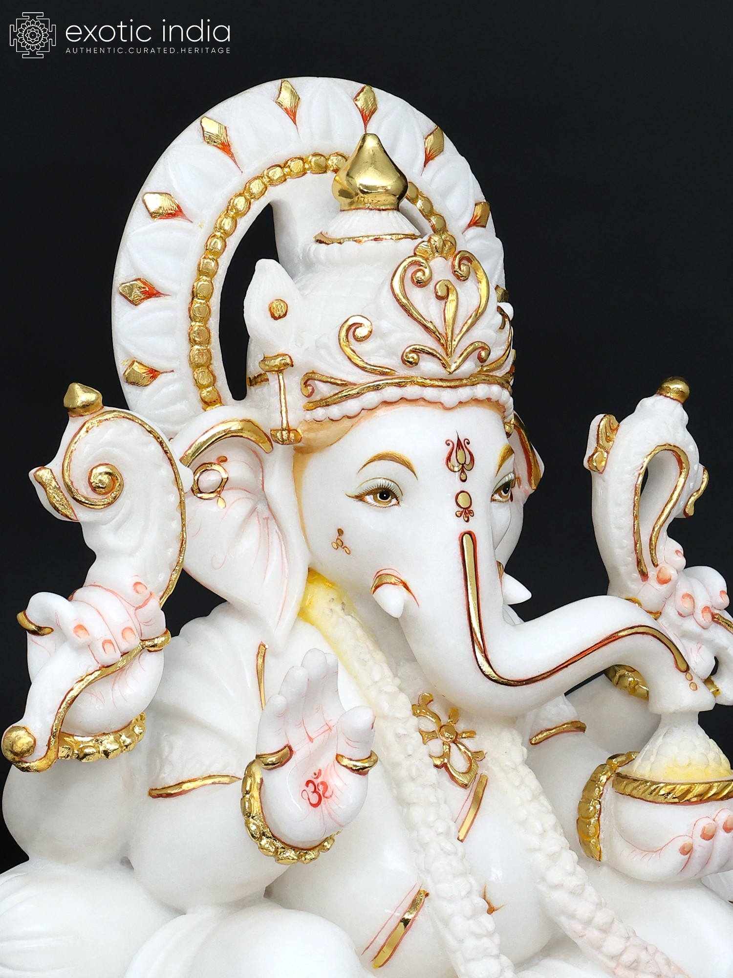30" Four Armed Blessing Lord Ganapati Seated on Throne | White Marble Statue