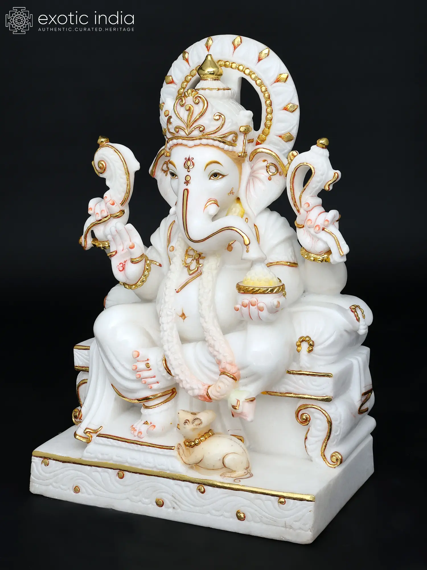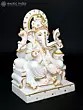 11" Four Armed Lord Ganapati Seated on Lotus With Mushak | White Marble Statue For Temple