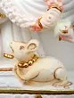Observe the dignified posture, seated upon an ornate throne that speaks of divine authority. Four arms are rendered with grace, each holding symbolic objects that represent his manifold powers. The gentle flow of the draped garments, complemented by the detailed lotus motif adorning the headdress and halo, conveys a sense of ultimate serenity. The inclusion of the humble Mushika (mouse), his loyal vahana, adds a touch of endearing realism, underscoring the deity's accessibility.