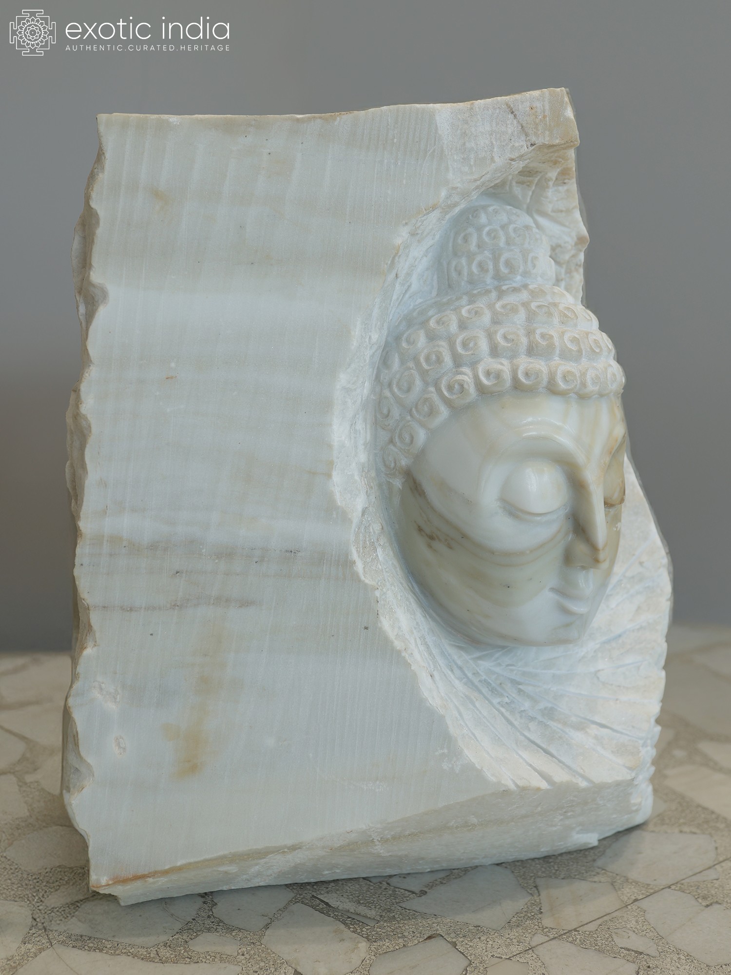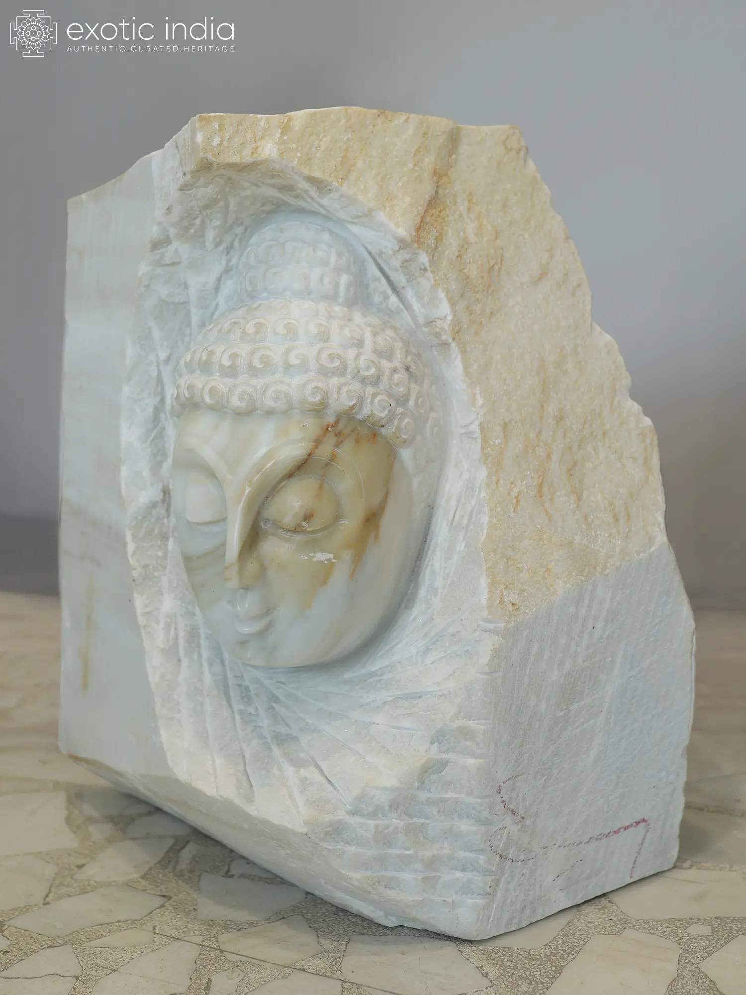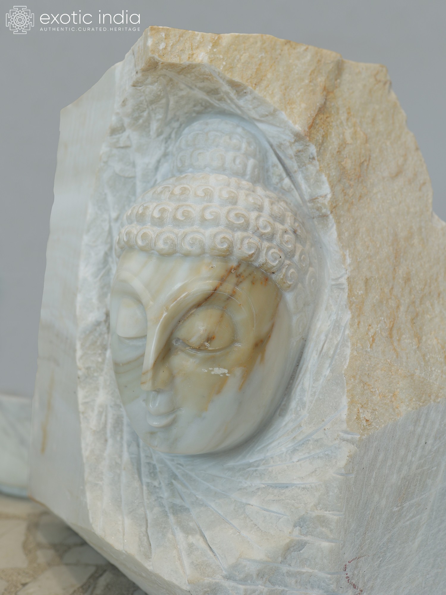 This arresting sculpture captures the very essence of profound tranquility and the awakening spirit. Carved from a singular block of natural white marble, the piece presents a striking contrast between the raw, untamed beauty of the unworked stone and the exquisite, delicate rendering of Lord Buddha's face. It is a masterful demonstration of modern artistry, where the sculptor has allowed the inherent qualities of the marble to guide the form, as if the divine visage was always destined to emerge from within. The raw edges and rough texture of the stone cradle the serene countenance, symbolizing the Buddha's journey from the worldly to the enlightened state.
