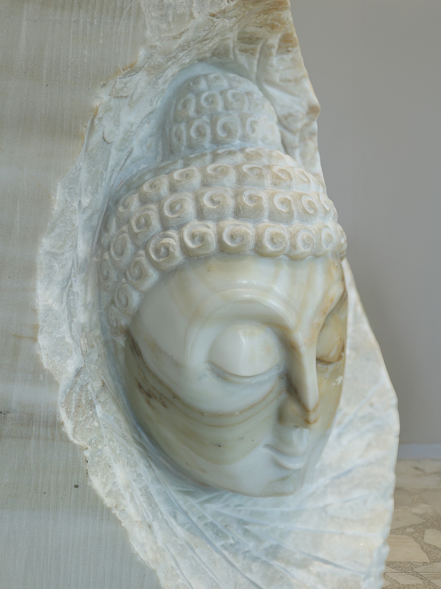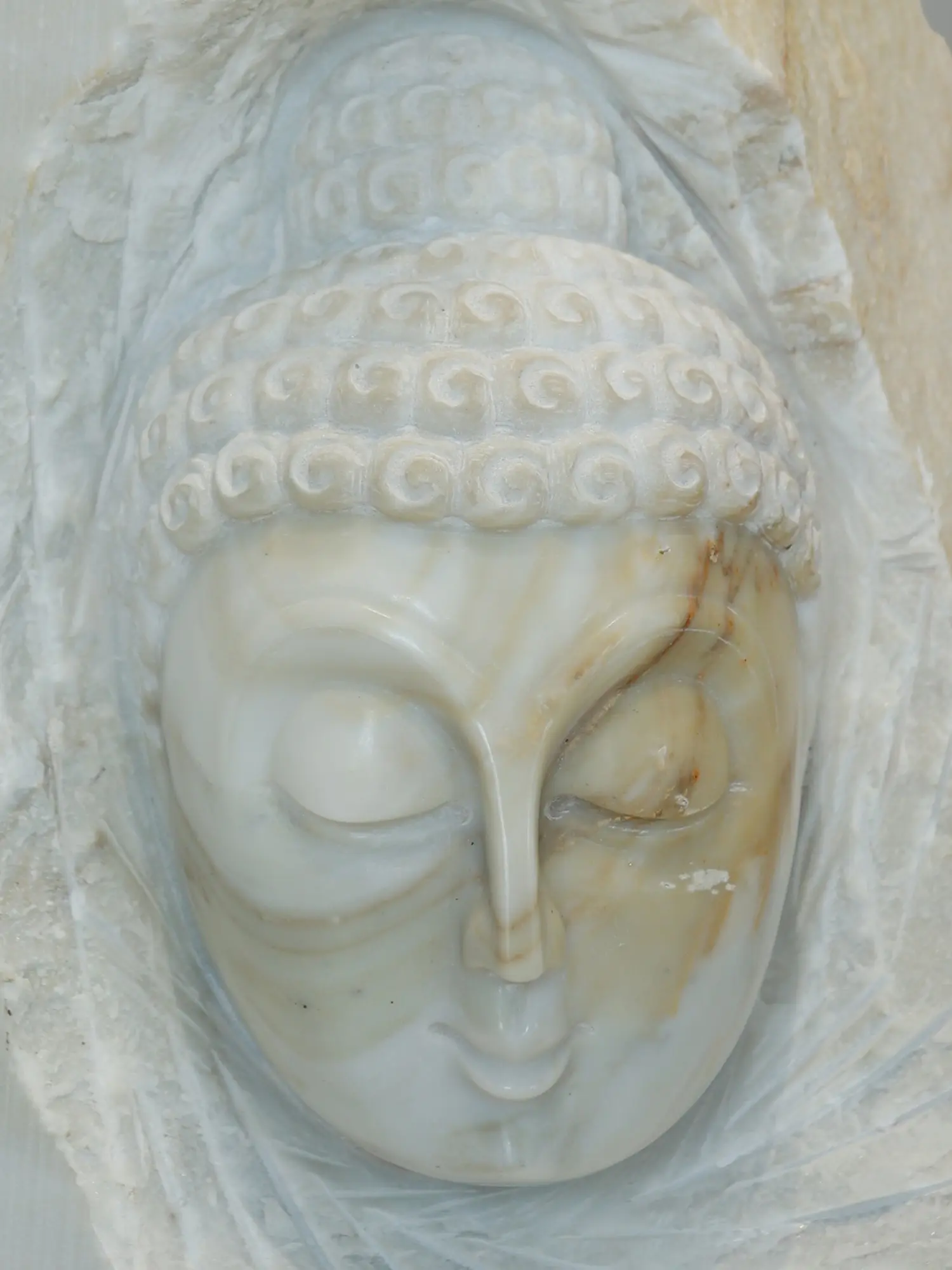 The portrayal of the Buddha's face is deeply steeped in tradition. The serene expression, the closed eyes signifying deep meditation, and the subtle smile hint at the attainment of Nirvana. The tightly coiled curls of his hair are a classical representation, often depicted as symbolic of his wisdom and the overcoming of desires. The artist’s contemporary approach lies in its presentation – the Buddha's face is not fully liberated from the stone but rather emerges from it, suggesting that enlightenment is a continuous process, an unfolding awareness that arises from within the very fabric of existence. This modern interpretation can be seen as a visual metaphor for the Buddhist teaching that the Buddha nature resides within all beings, waiting to be discovered. The rough, unfinished exterior of the marble can be interpreted as the unawakened mind, while the polished, serene face represents the illuminated consciousness.