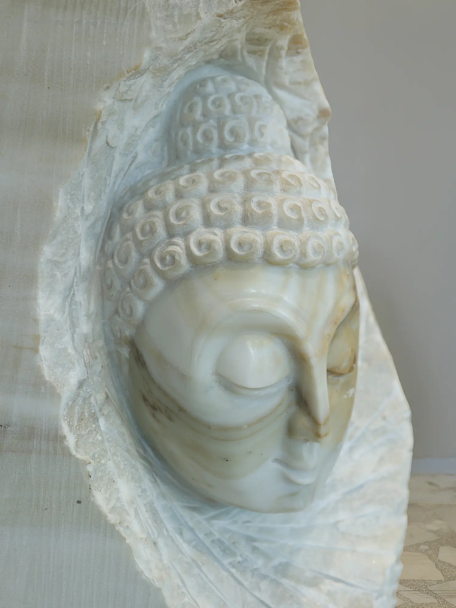 This sculpture transcends mere decoration; it is a profound piece of modern art that invites contemplation and introspection. It seamlessly blends the rich cultural heritage of Indian craftsmanship with a contemporary aesthetic, making it an ideal addition to any discerning collection. Its substantial presence and the inherent beauty of the marble ensure it will become a focal point in any space, be it a meditation room, a living area, or an office. The sculpture’s abstract framing of the Buddha’s face encourages viewers to engage with its spiritual and artistic qualities on a personal level, fostering a sense of peace and mindfulness in its presence.
