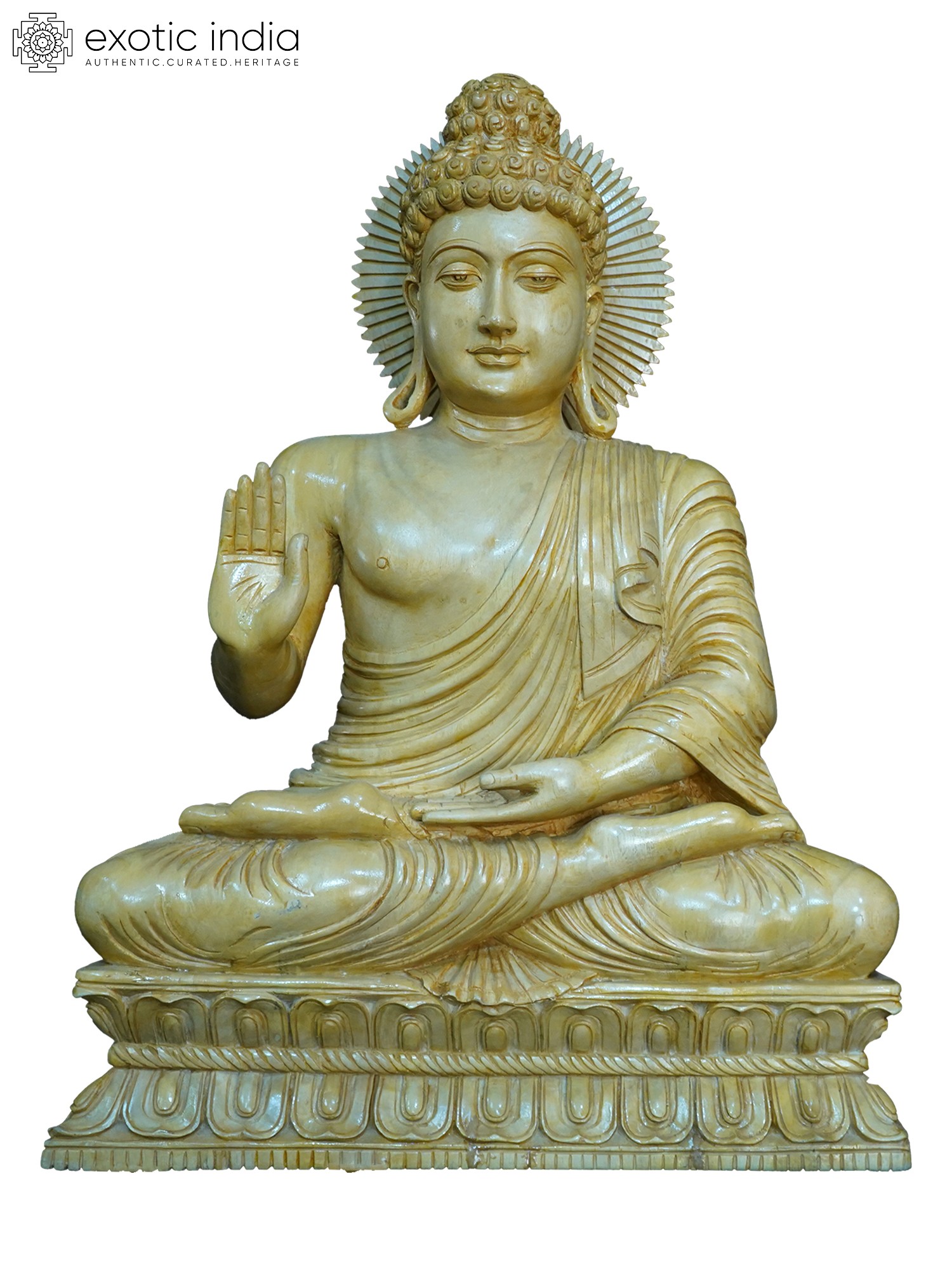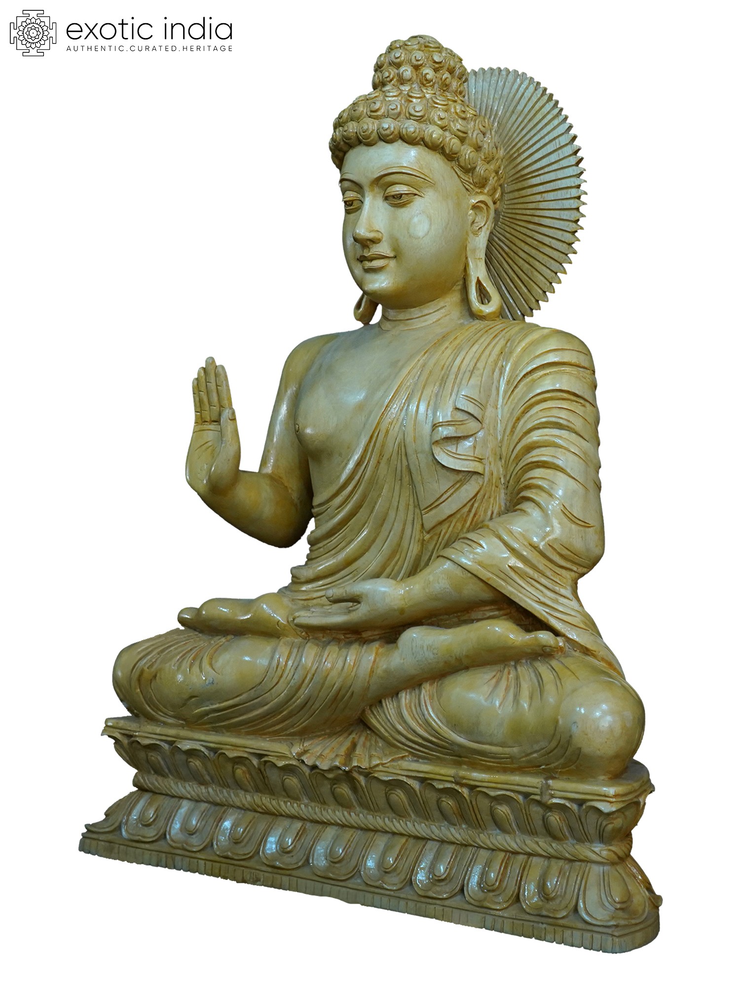 The raised right hand of the Buddha in this statue displays the Abhaya Mudra, a gesture signifying protection, peace, and the dispelling of fear. This ancient hand gesture carries a profound meaning, representing the Buddha's reassurance to his followers, promising them safety from the cycle of suffering. As the newly enlightened one, Siddhartha Gautama, now the Buddha, extended his hand, it was a declaration of fearlessness, not just for himself, but for all beings who sought refuge in his teachings. The gentle curve of the fingers and the open palm exude an aura of calm and reassurance. This mudra serves as a visual invocation of courage and tranquility, encouraging one to overcome anxieties and embrace a life of compassion.
