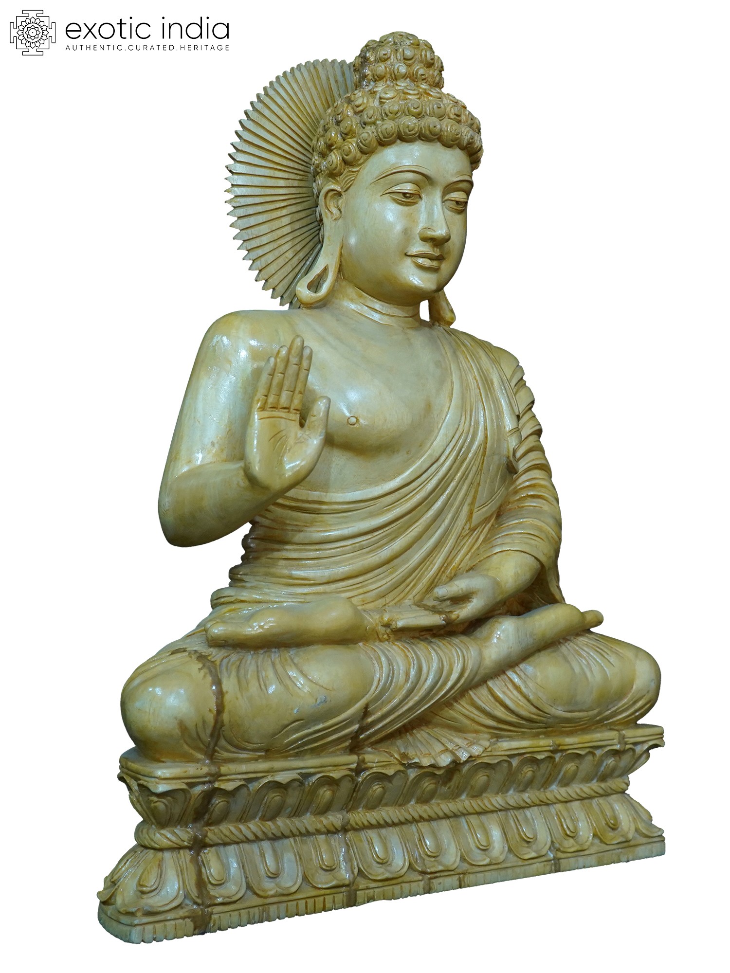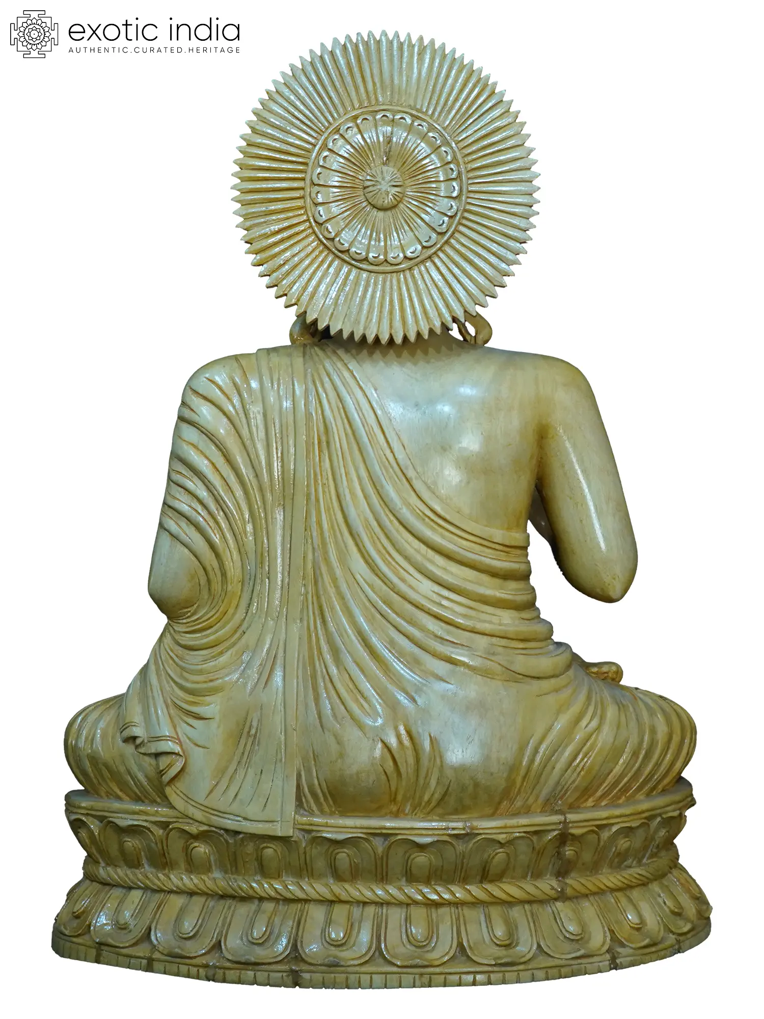 Crafted from white wood, this statue depicts Lord Buddha in a seated posture, his presence radiating serenity and wisdom. The hand-carved detailing brings to life the subtle nuances of his enlightened form. The smooth, polished surface of the wood enhances the statue's elegant appeal, making it a captivating addition to any space. Whether displayed in a meditation room, living area, or office, this statue serves as a potent reminder of the path to inner peace and enlightenment.