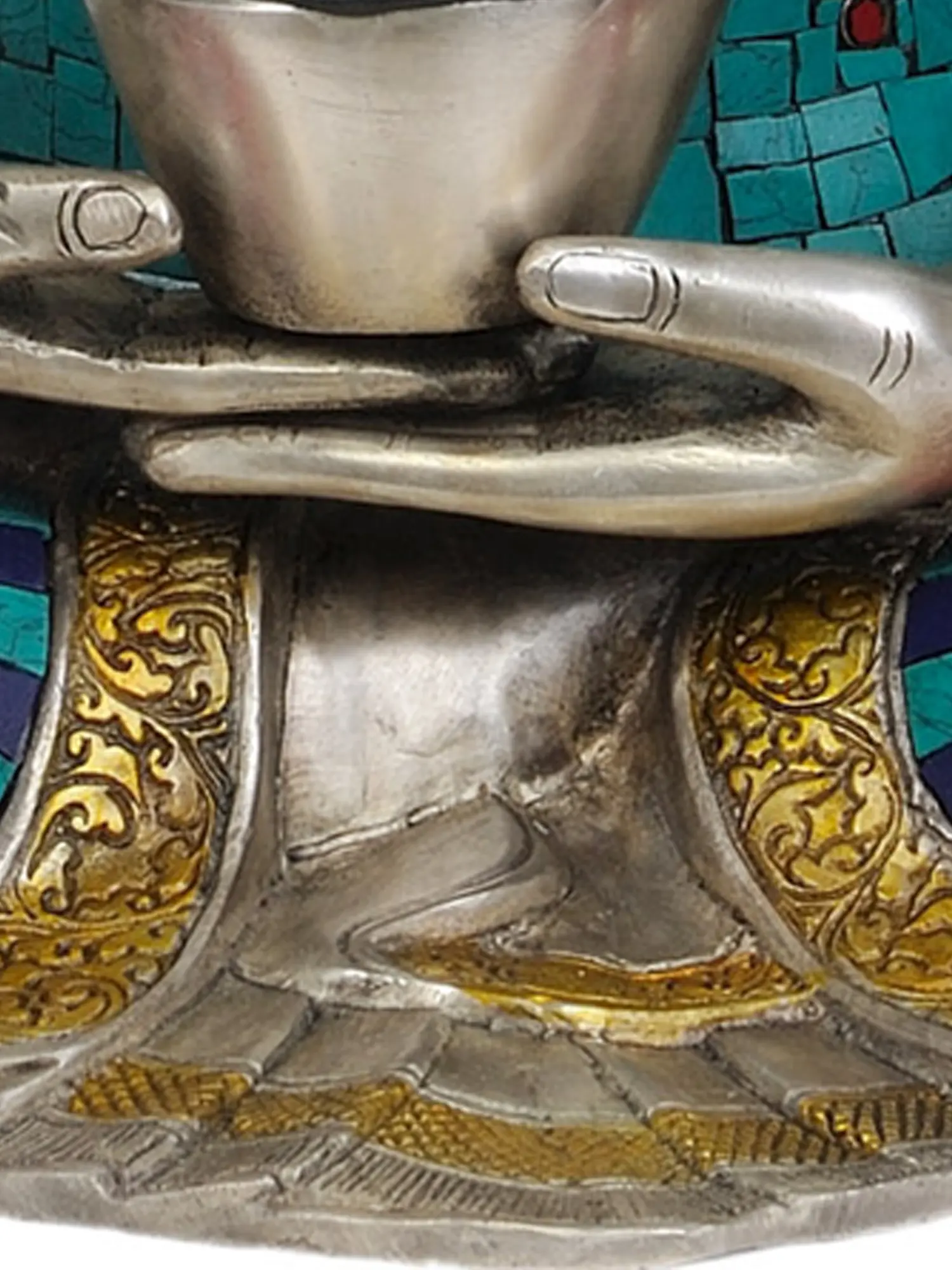 This handcrafted representation of Lord Buddha captures the profound tranquility and compassion that defines his teachings. Seated in the lotus position, a posture symbolic of meditative stillness and spiritual awakening, Buddha holds the Pinda-Patra, the alms bowl, a testament to his renunciation of worldly possessions and his embrace of a life devoted to inner peace. The serene expression on his face reflects the state of Nirvana, the ultimate liberation from suffering and the cycle of rebirth. The intricate craftsmanship brings to life the story of Siddhartha Gautama, the prince who abandoned a life of luxury to seek enlightenment. His journey, marked by rigorous asceticism and profound meditation, culminated in his awakening under the Bodhi tree. He then dedicated the remainder of his life to teaching the Dharma, the path to liberation, offering guidance and inspiration to countless individuals across generations.