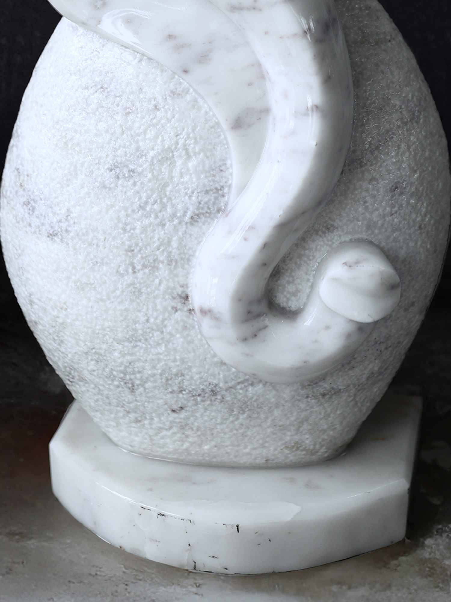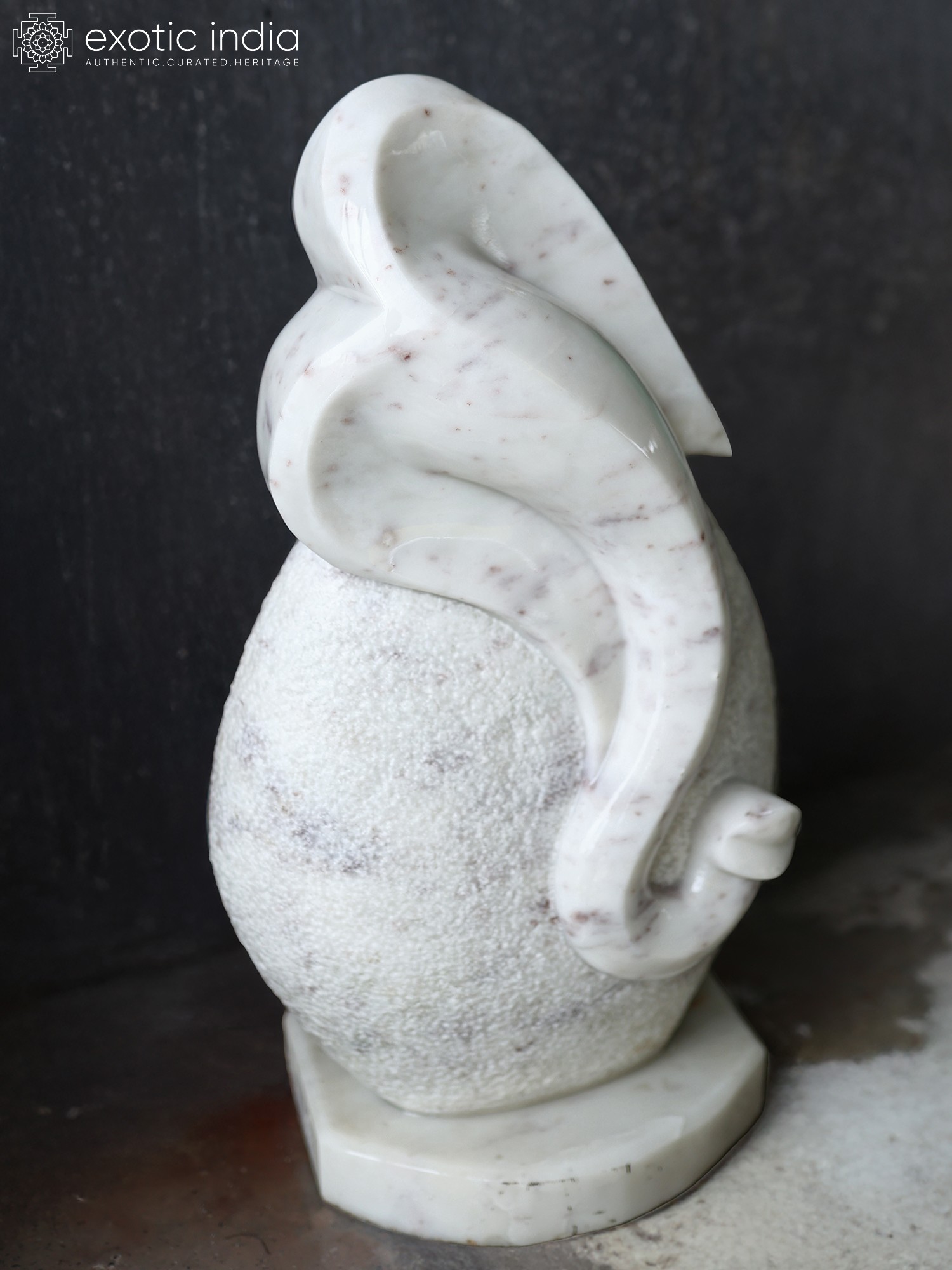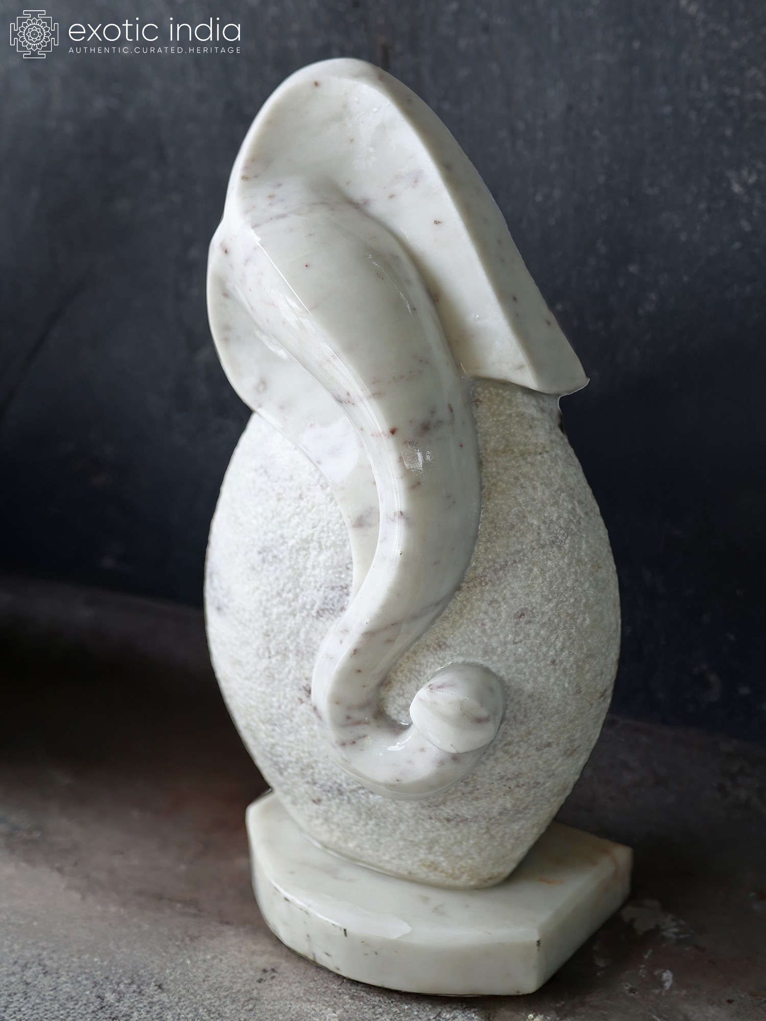 This striking marble sculpture presents a contemporary reimagining of Lord Ganesha, the beloved elephant-headed deity revered as the remover of obstacles and the patron of arts and sciences. Crafted from natural marble, this piece transcends traditional iconography, offering a fresh perspective on an ancient divine form. The artist has embraced abstract principles, distilling the essence of Ganesha into fluid lines and dynamic curves. The textured finish on the body of the statue contrasts beautifully with the polished, sleek rendering of his trunk and tusks, creating a visual dialogue that is both engaging and sophisticated.