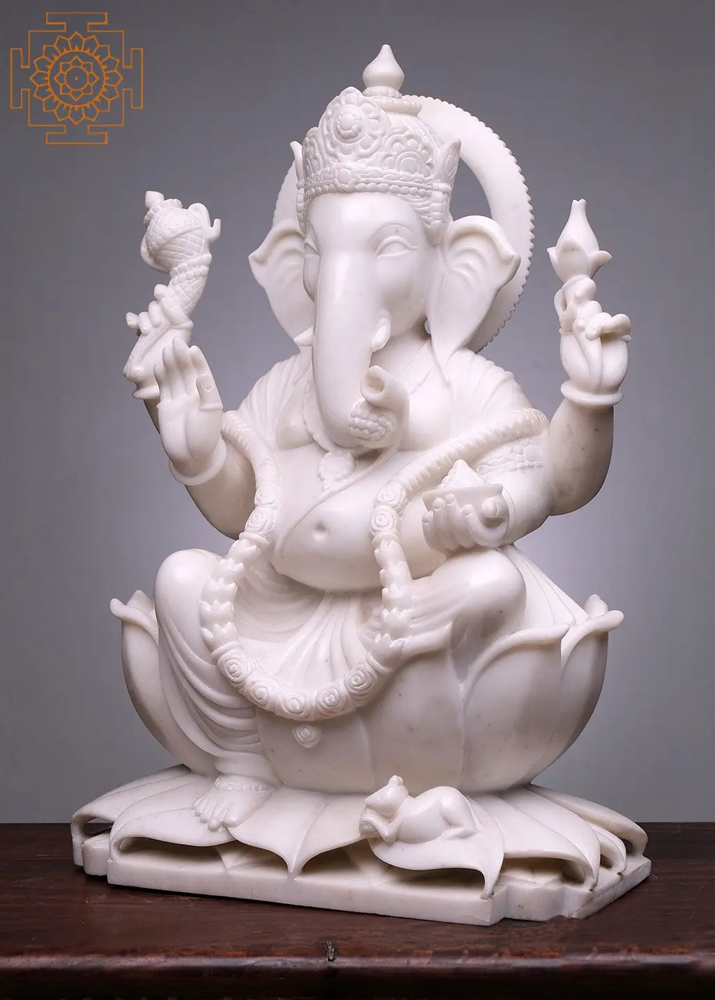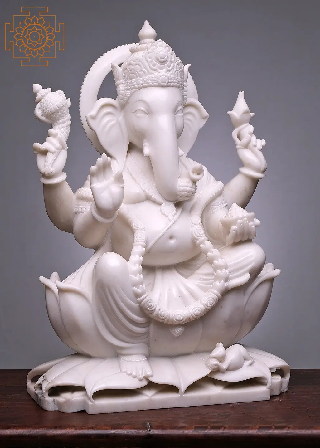 24" Lord Ganesha Seated on Lotus | Handmade | White Marble Ganesha Statue | Ganpati Statue | Vinayak Padma Deity