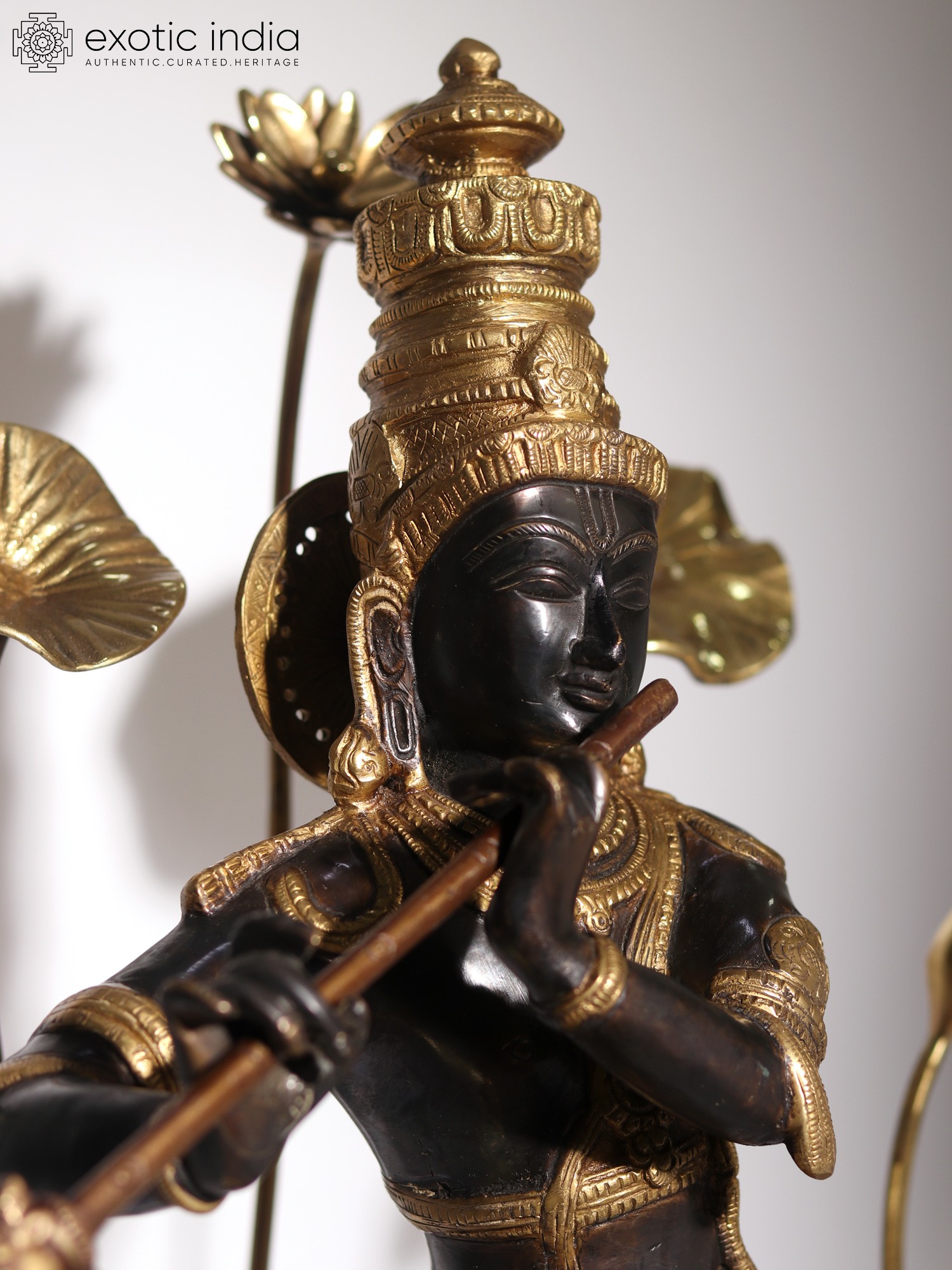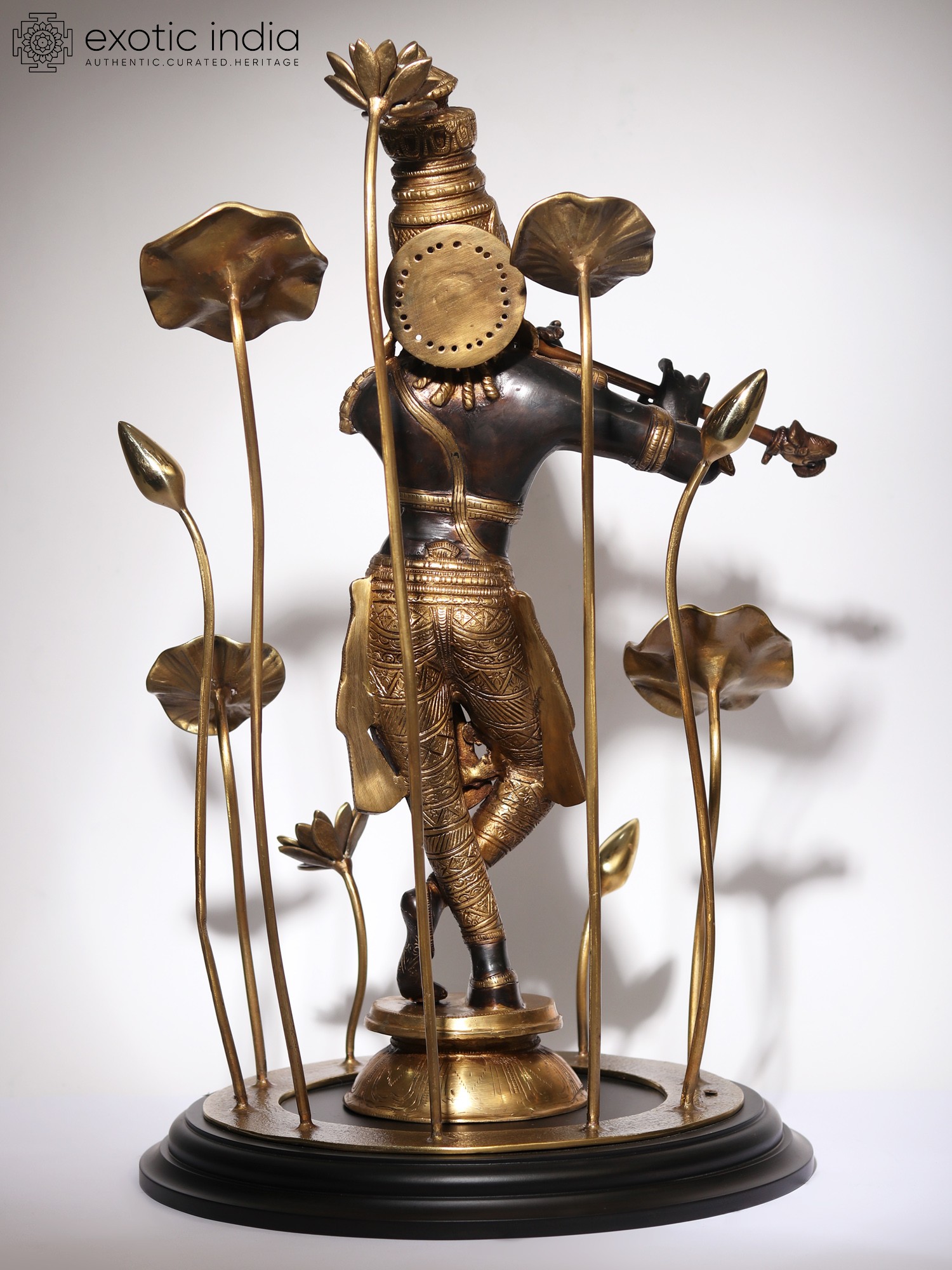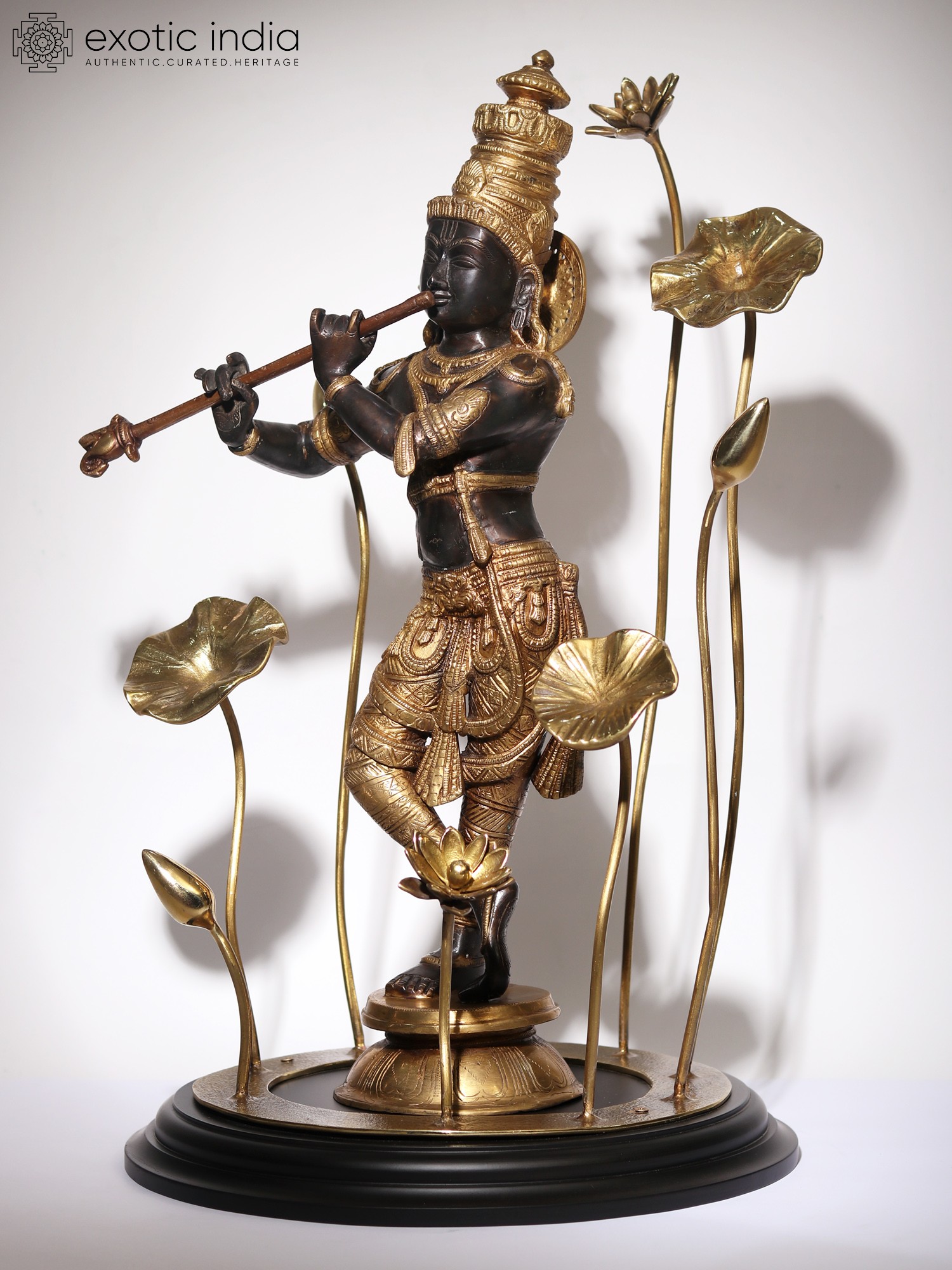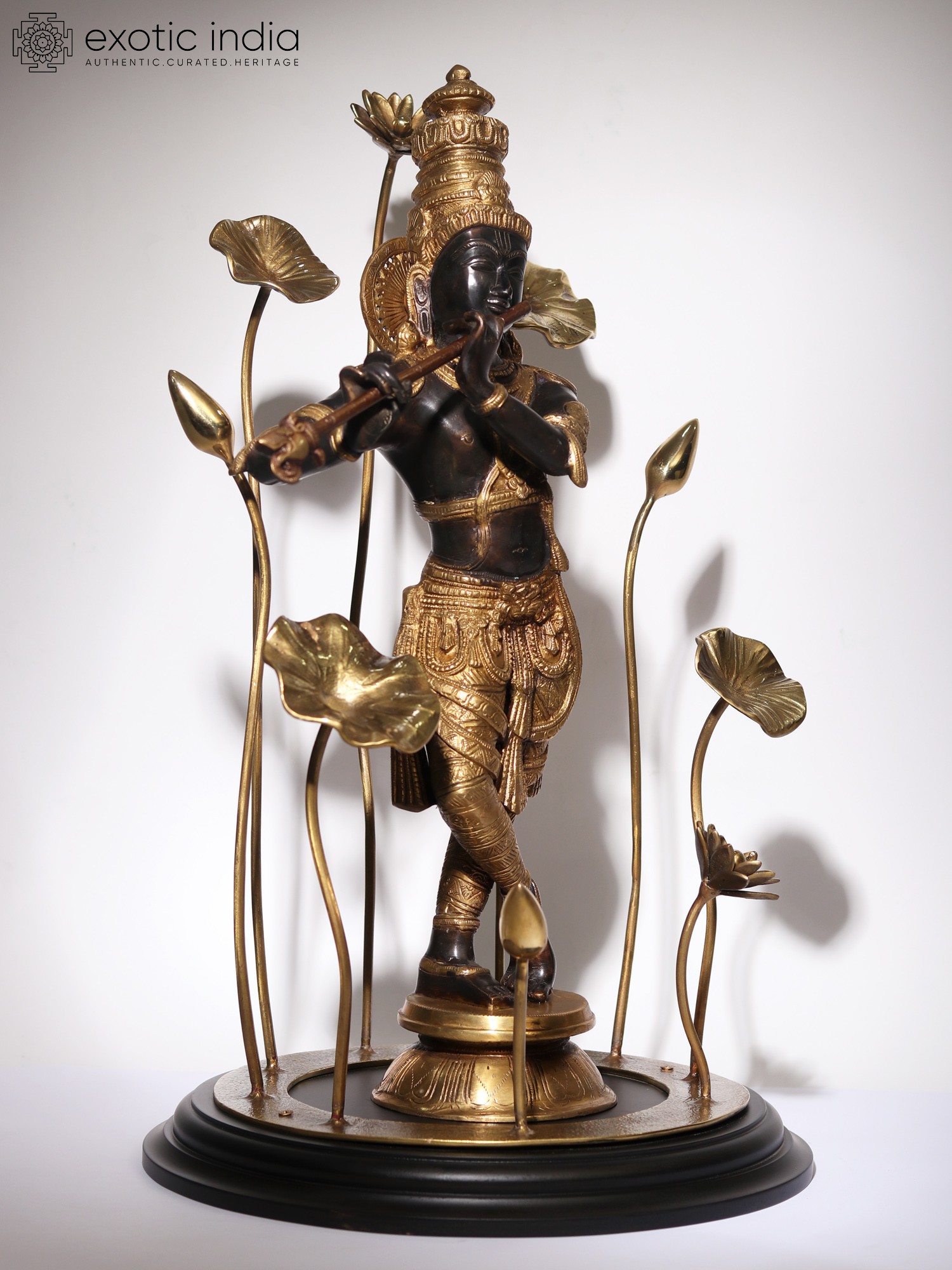 On a circular wooden base, the lotus pedestal of Krishna is placed, on which he stands in his charming Tribhanga or triple bent pose. Ornate jewelry, crown, and a splendidly detailed dhoti form his attire. Gently holding his flute, Krishna closes his eyes, in a meditative mood, marked by his closed eyes and tranquil visage. As the supreme source of nourishment and profound wisdom, the manifestation of Param Brahman, Krishna appears in this sculpture, which is a unique and superb visual narration of his powers.
