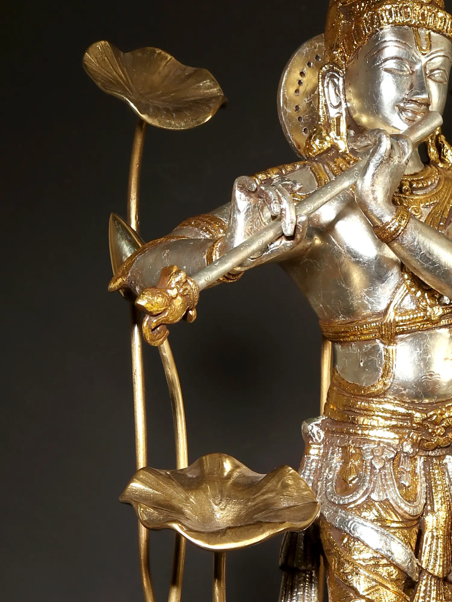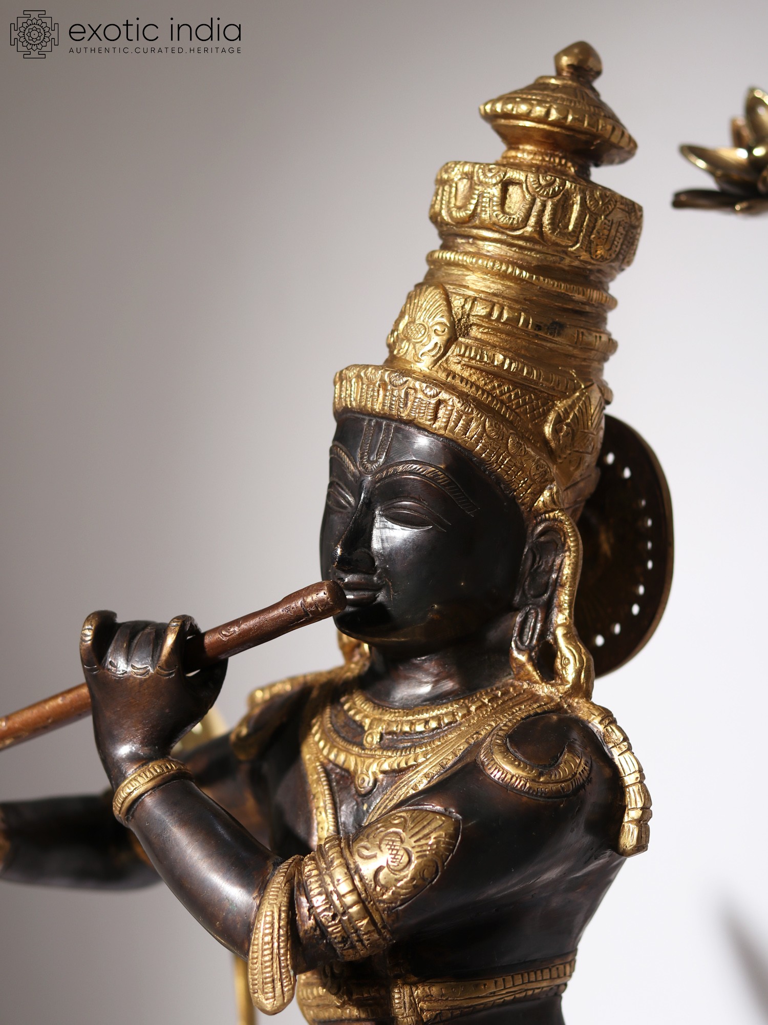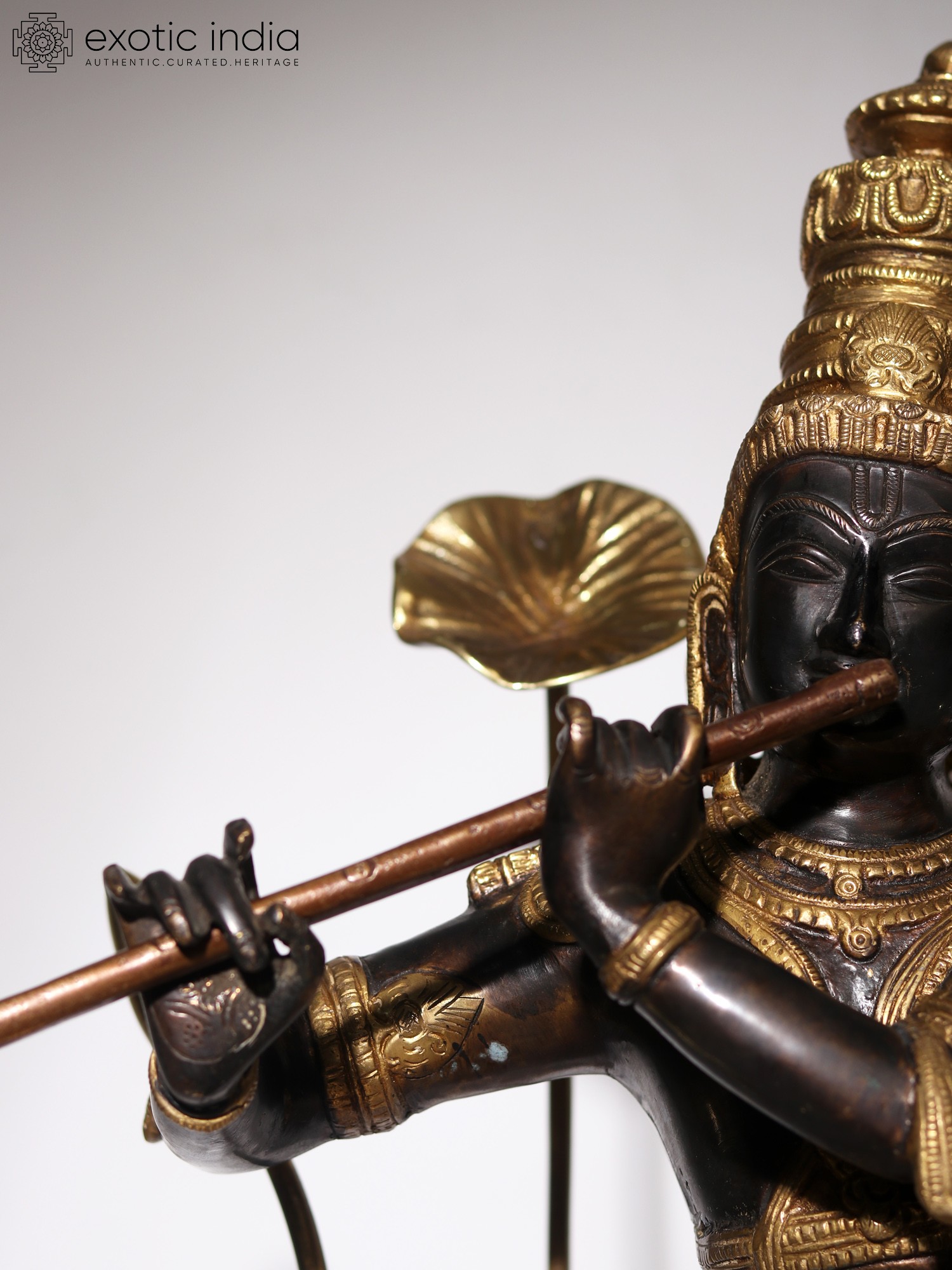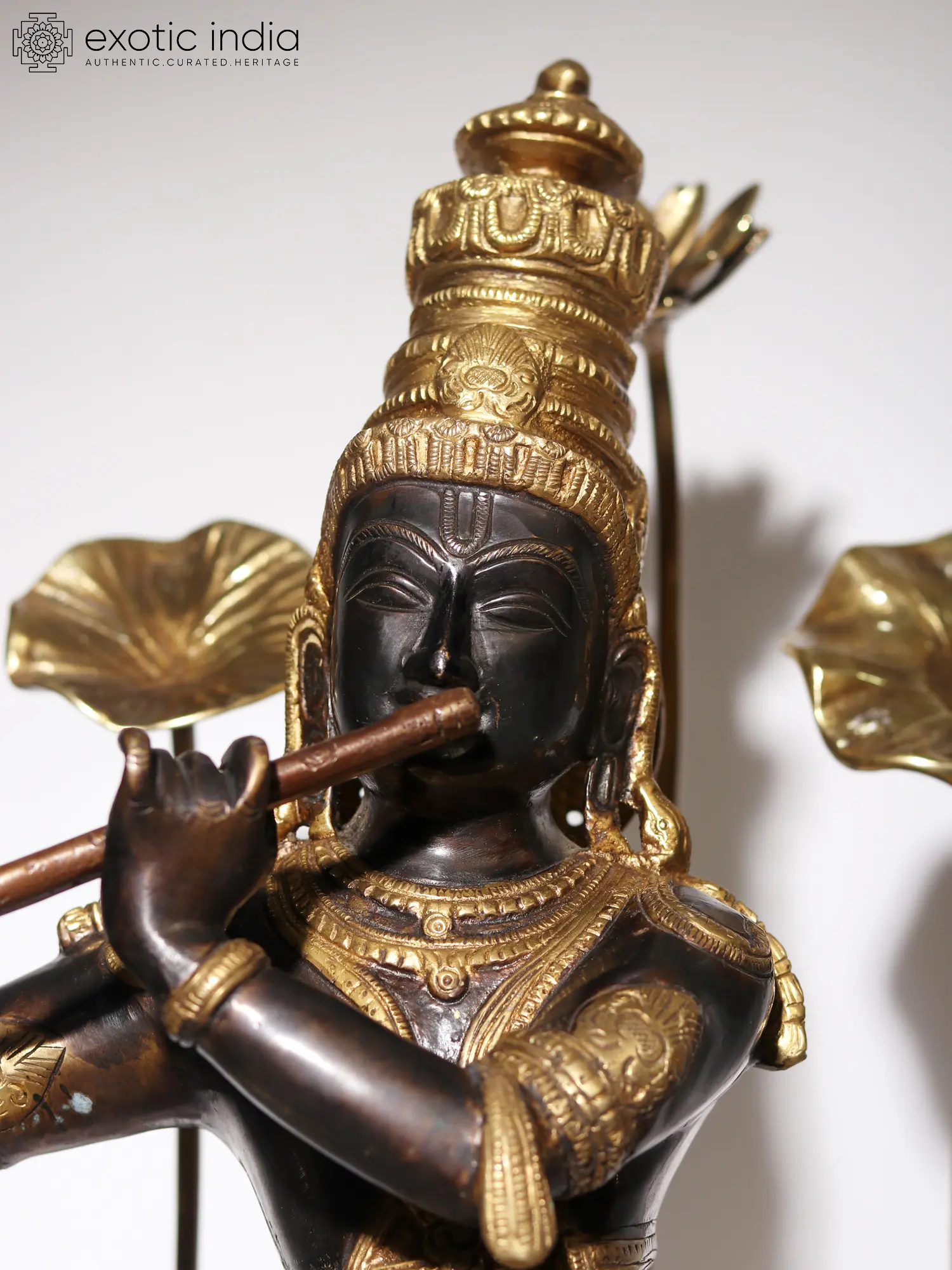 On a circular wooden base, the lotus pedestal of Krishna is placed, on which he stands in his charming Tribhanga or triple bent pose. Ornate jewelry, crown, and a splendidly detailed dhoti form his attire. Gently holding his flute, Krishna closes his eyes, in a meditative mood, marked by his closed eyes and tranquil visage. As the supreme source of nourishment and profound wisdom, the manifestation of Param Brahman, Krishna appears in this sculpture, which is a unique and superb visual narration of his powers.