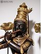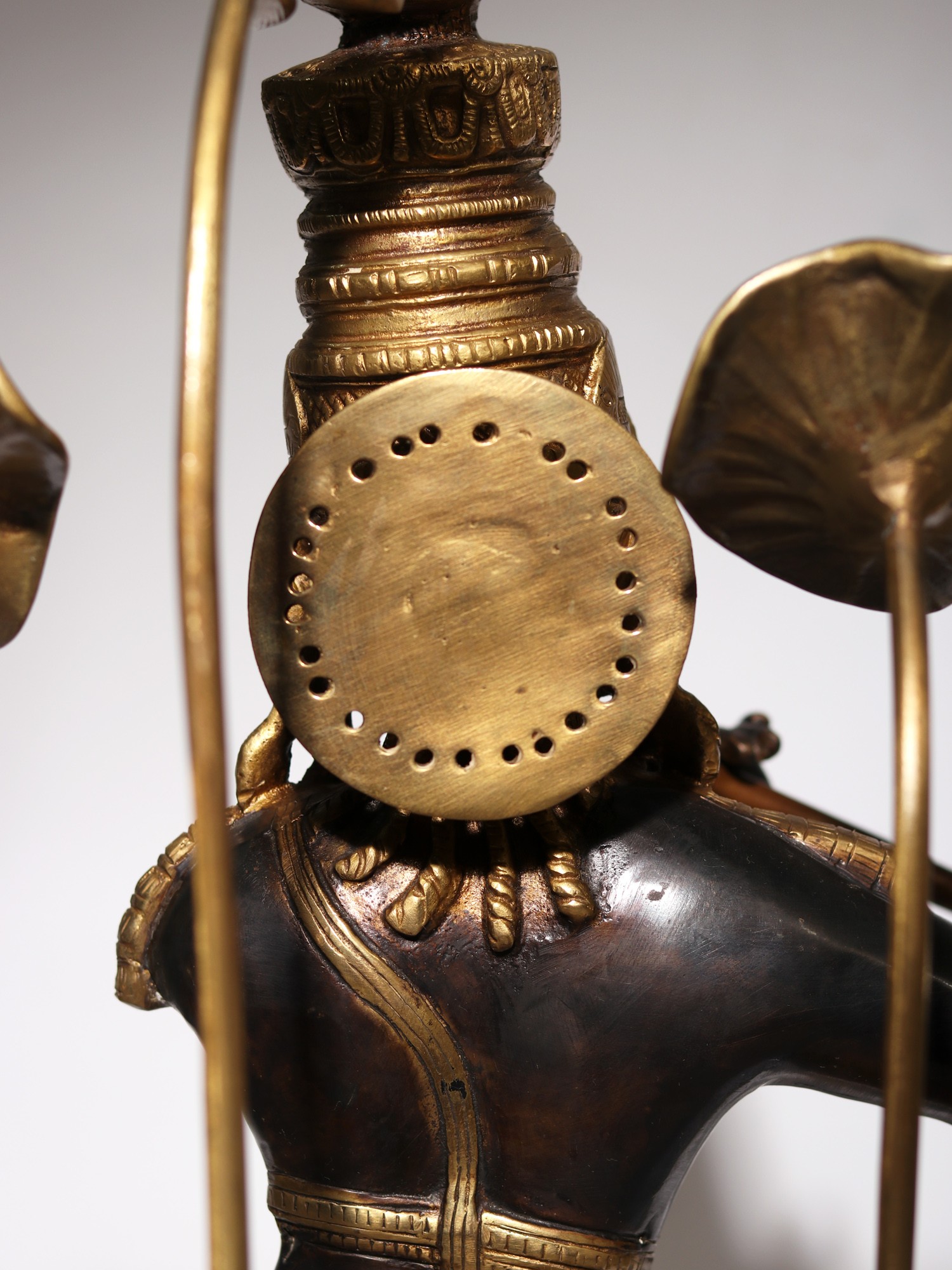 An aesthetically rich representation of Krishna’s ambrosial beauty, this brass statue presents the fluting Lord surrounded by fragrant lotuses- symbols of purity and attainment of supreme wisdom. Nurtured by the presence of Sri Krishna, true wisdom and bliss bloom in the heart, an experience that has been masterfully captured by the makers of this brass statue.