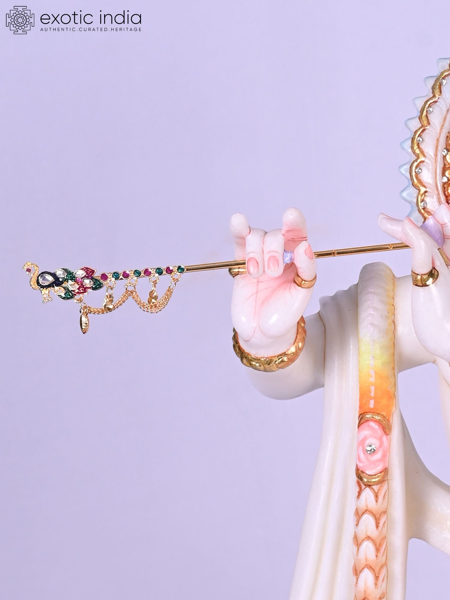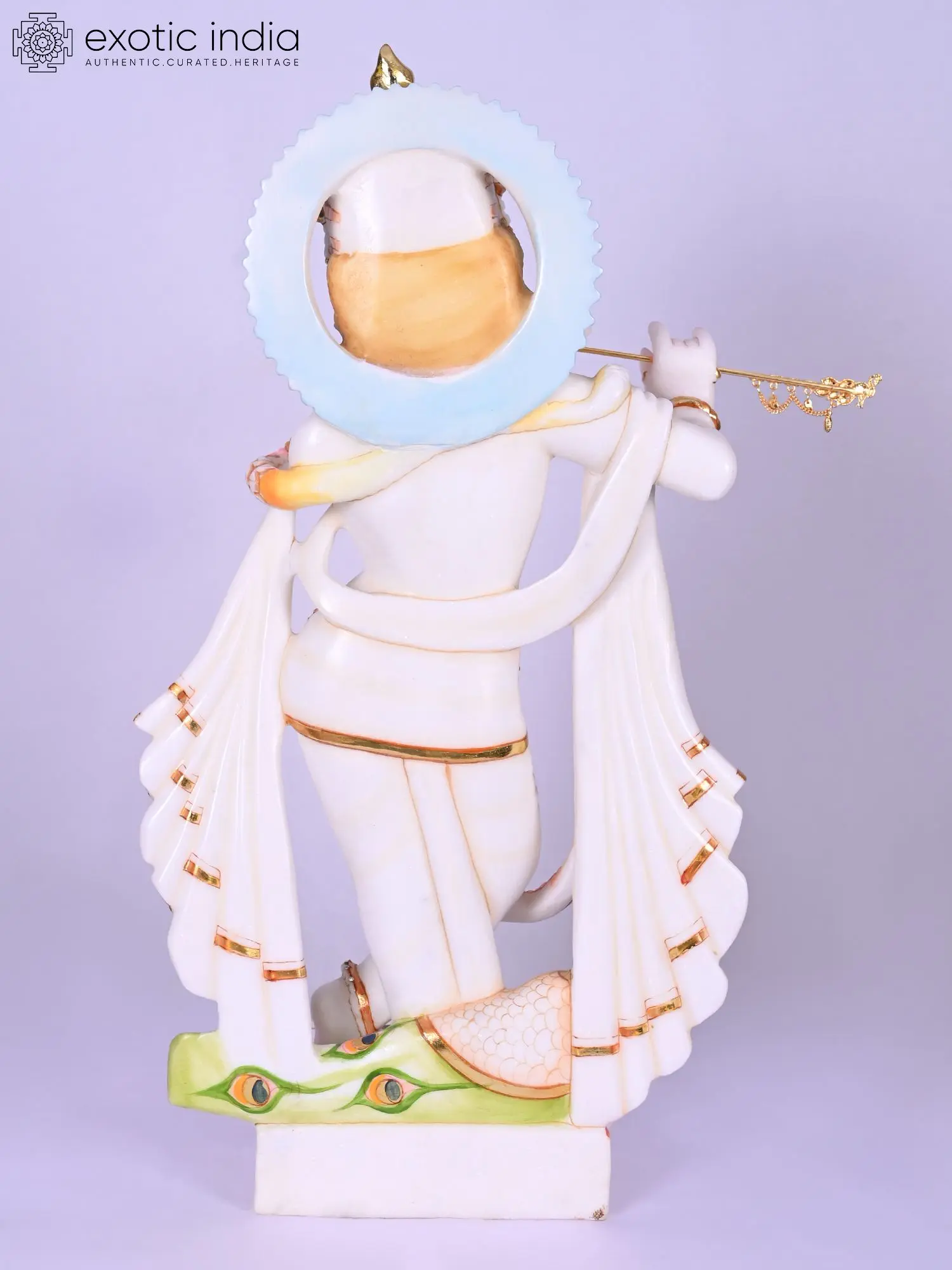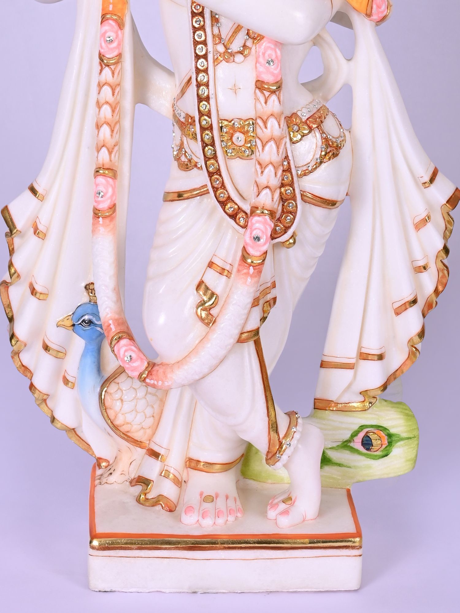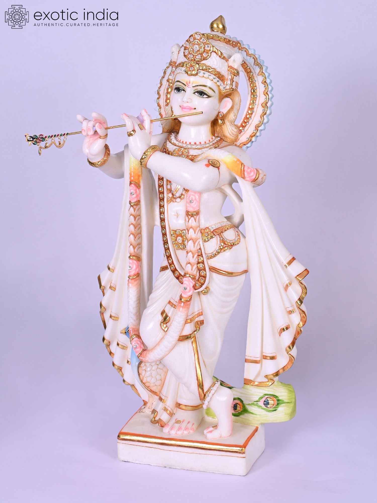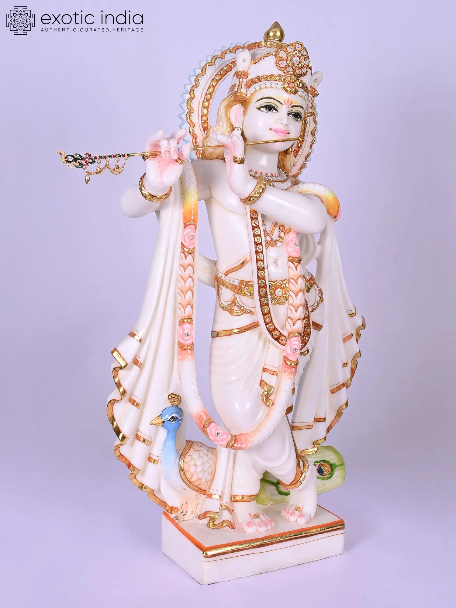 The graceful posture, the gentle tilt of the head, and the delicate fingers poised around the flute all speak of a divine presence captured in stillness. You'll marvel at the intricate gold leaf detailing that accentuates the flowing robes and the ornate crown, reflecting light and adding a regal splendor. The inclusion of the peacock, a symbol deeply associated with Lord Krishna, further enhances the visual narrative and symbolic richness.
