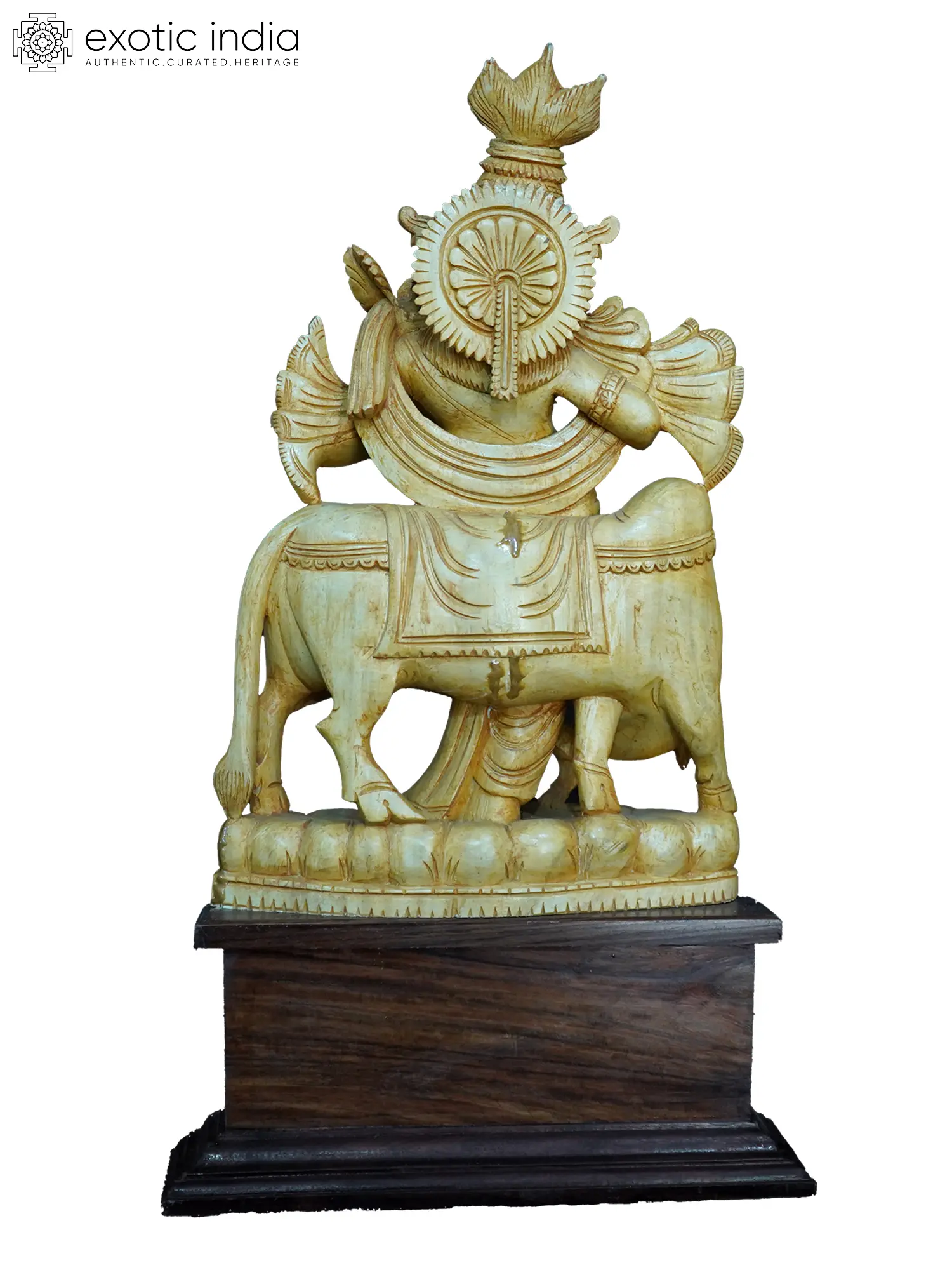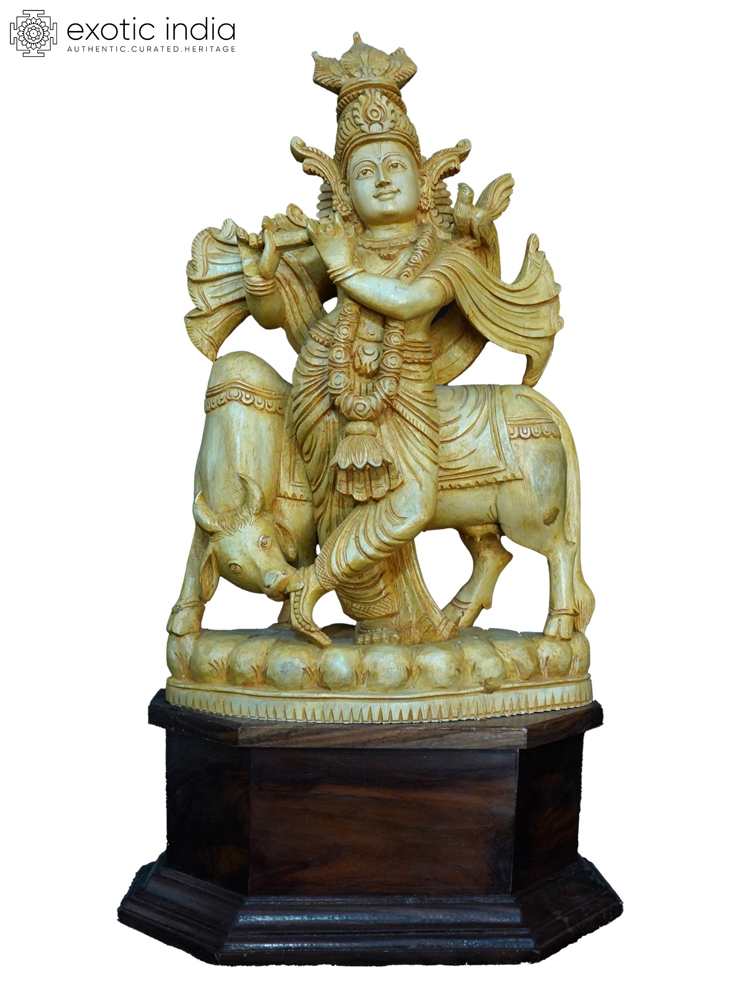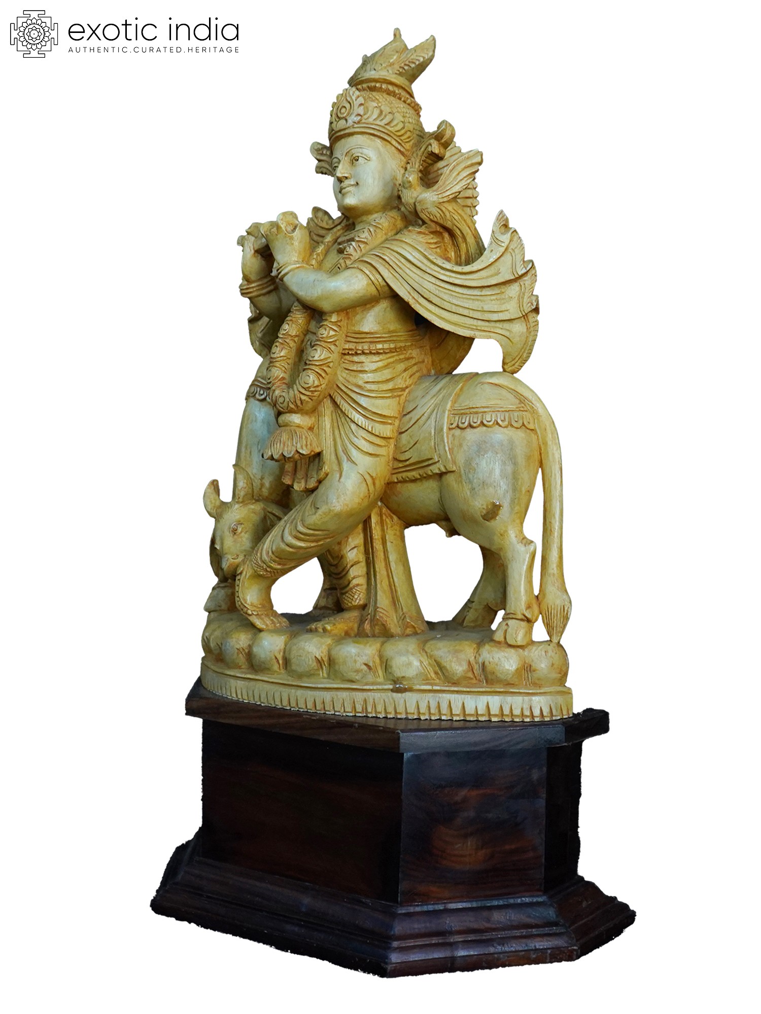34" Large Lord Krishna Standing on Lotus Playing Flute | Wood Carved Statue