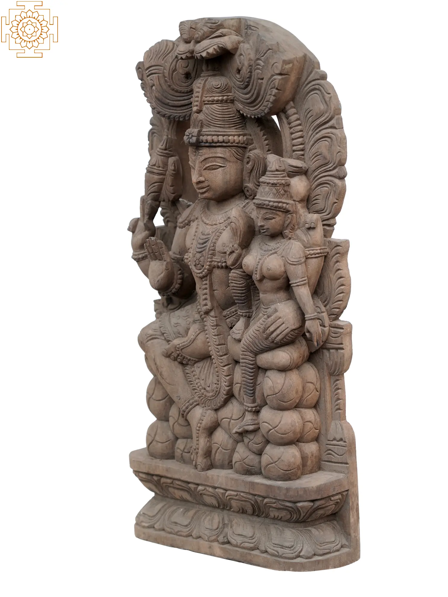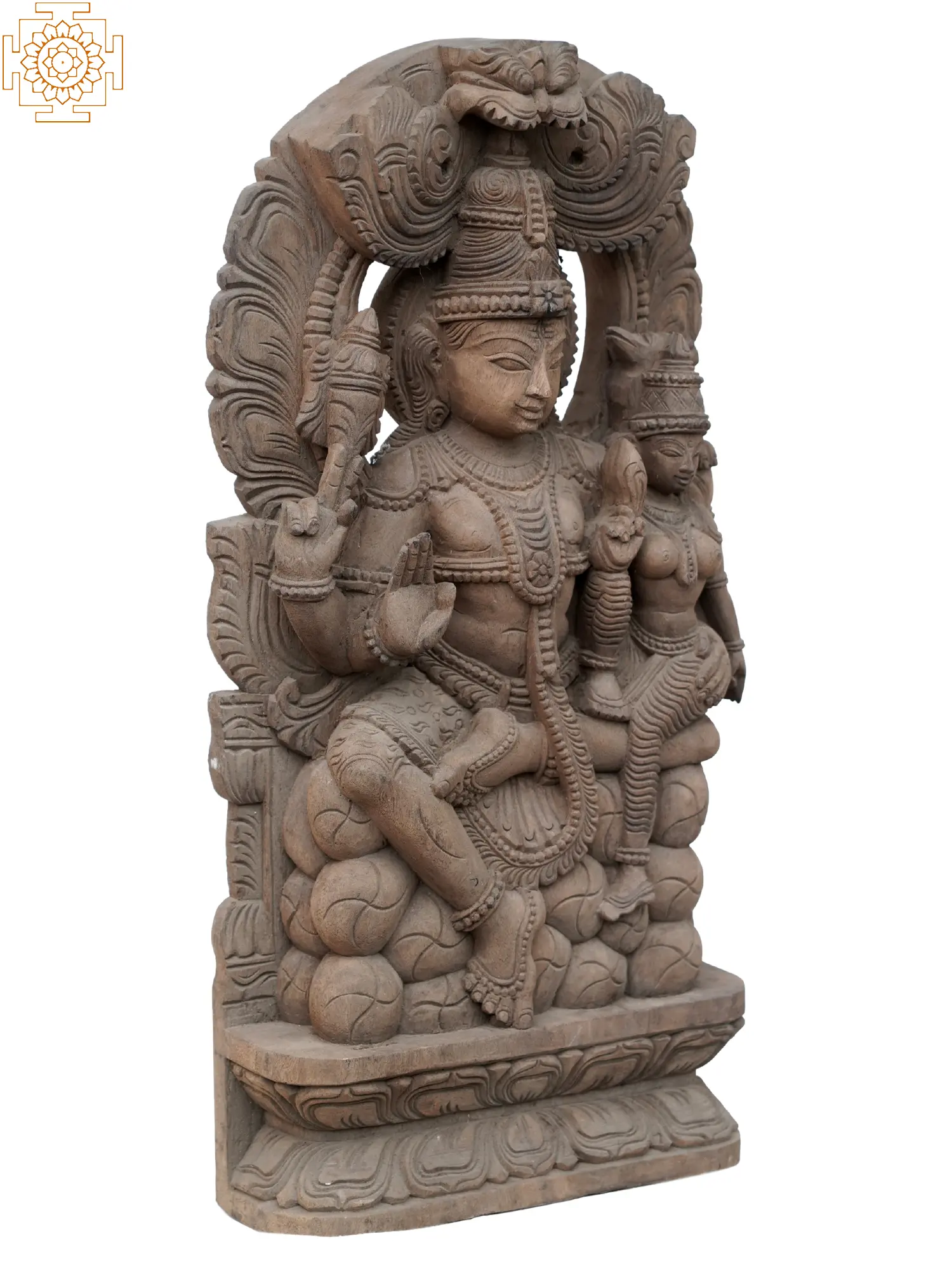 Enter the realm of stunning depiction of Lord shiva and Parvati on the throne crafted with wood exudes divine presence and grace. The divine couple sheathed upon an intricately carved throne, symbolizing their divine authority and celestial union. Lord Shiva, the embodiment of cosmic consciousness, sits in deep meditation, with his third eye symbolizing wisdom, with his third eye symbolizing wisdom and enlightenment. Beside him, Goddess Parvati, the epitom of divine feminine energy, radiates serenity and maternal love.