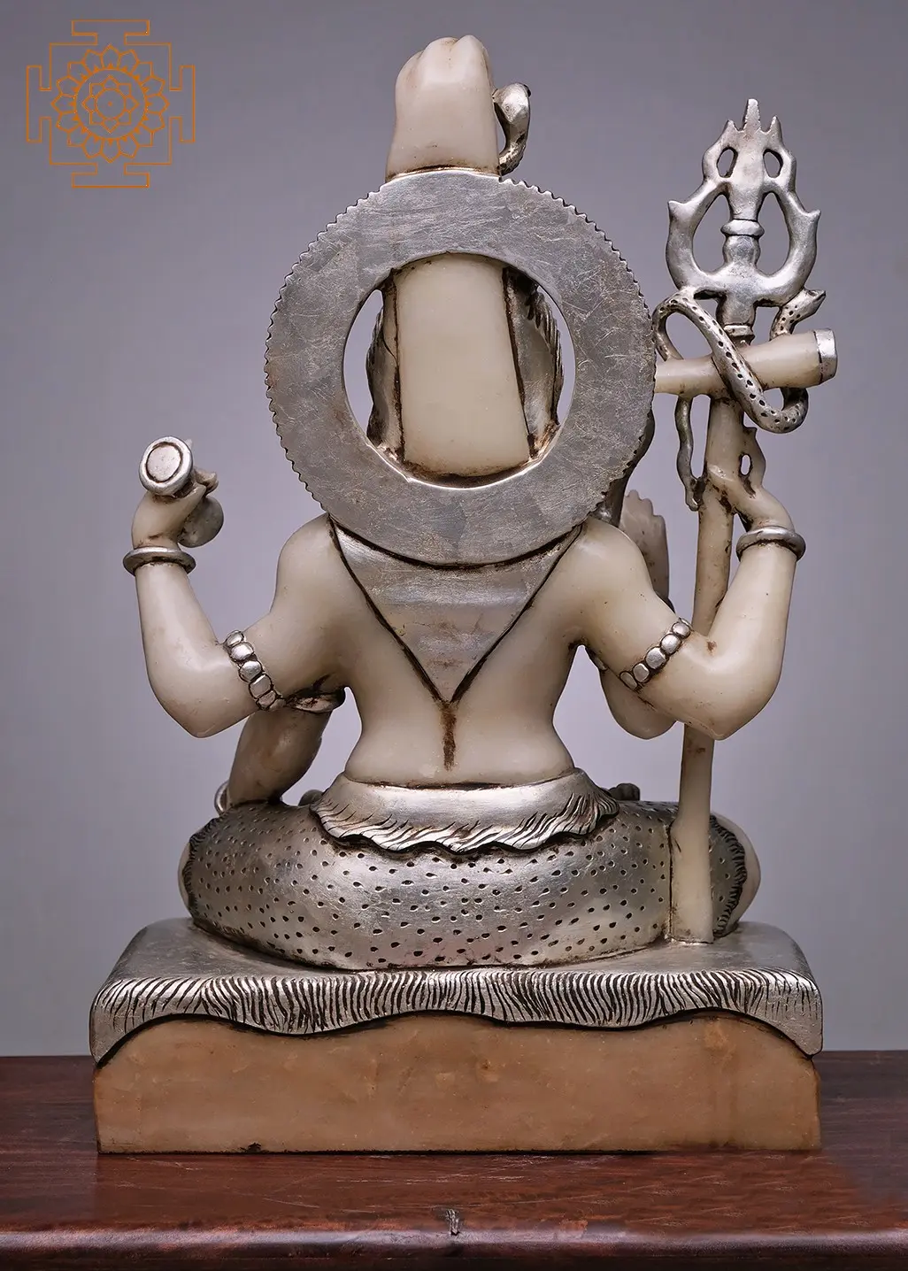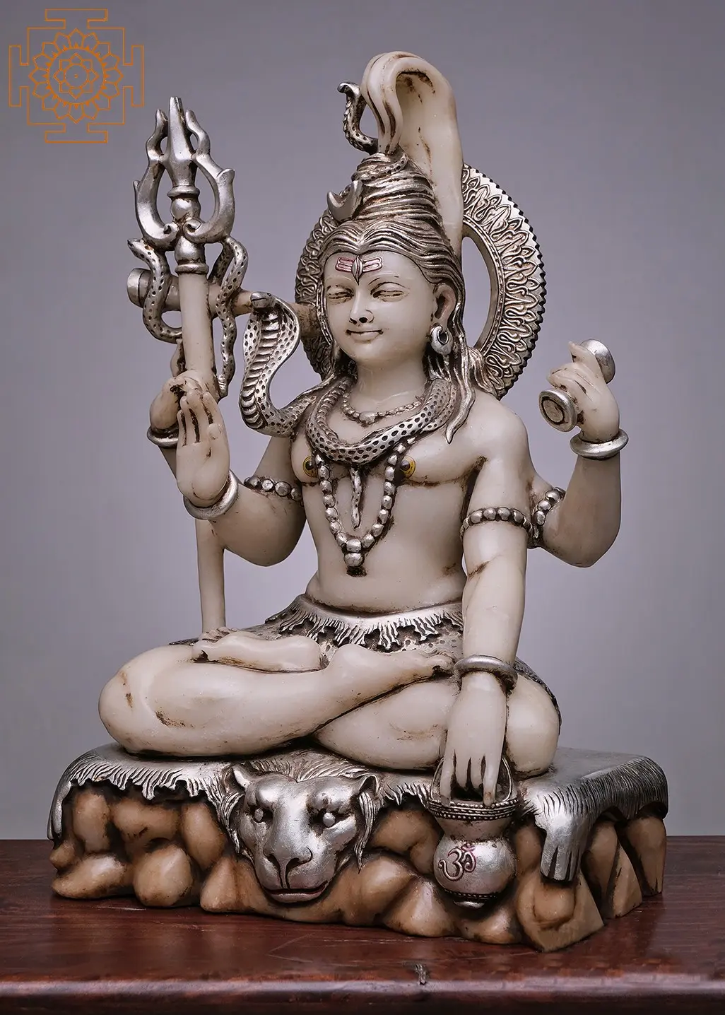 Every element of this sculpture is rich with symbolic meaning, reflecting the multifaceted nature of Lord Shiva. In his upper right hand, he holds the damaru, a small drum whose rhythmic sound is said to have created the universe. His upper left hand holds a kundika, a water pot, symbolizing purity and the source of life. The lower right hand is raised in the Abhaya Mudra, a gesture of fearlessness and protection, assuring devotees that he dispels all worries. His lower left hand rests gently, holding a vessel adorned with the sacred Om symbol, representing the primordial sound and the essence of all existence. Around his neck, a coiled serpent, Vasuki, is draped. The serpent signifies the control over primal energies and the overcoming of ego and destructive impulses. The trident, or Trishula, held in his upper left hand, is a symbol of his power over creation, preservation, and destruction – the cosmic trinity. The crescent moon adorning his matted locks represents his mastery over time and his connection to the cycles of nature. His third eye, depicted on his forehead, symbolizes wisdom and the ability to perceive beyond the ordinary realm. The tiger skin loincloth signifies his victory over lust and his renunciation of worldly attachments. This exquisite handmade statue serves as a powerful reminder of Lord Shiva's omnipresence and his role as the guardian of dharma and the liberator from suffering. The cool, smooth surface of the white marble enhances the divine aesthetic, inviting contemplation and spiritual connection. It is a masterpiece that brings the sacred presence of Lord Shiva and the serenity of Mount Kailash into your home or sacred space, offering a constant source of inspiration and peace.
