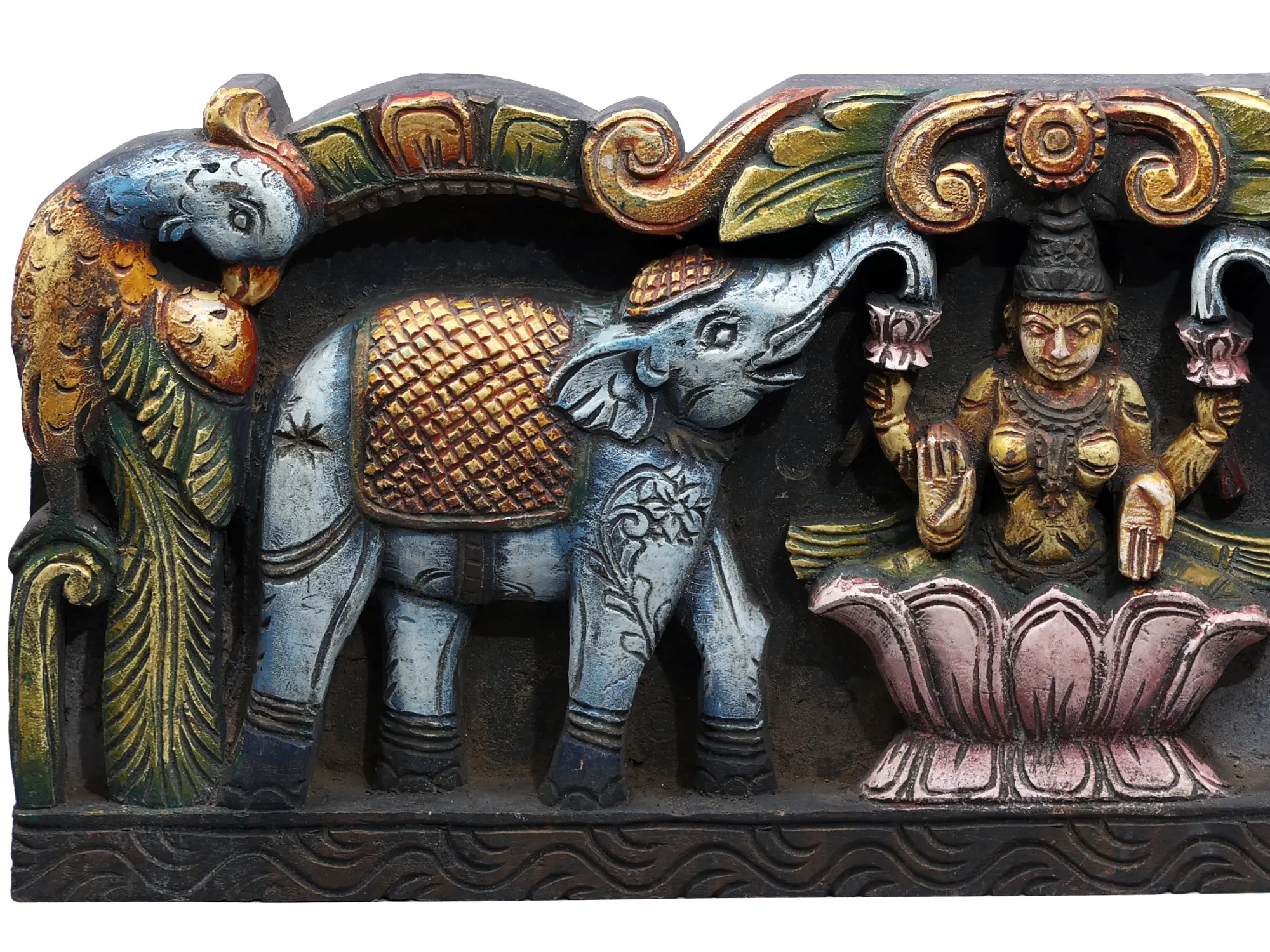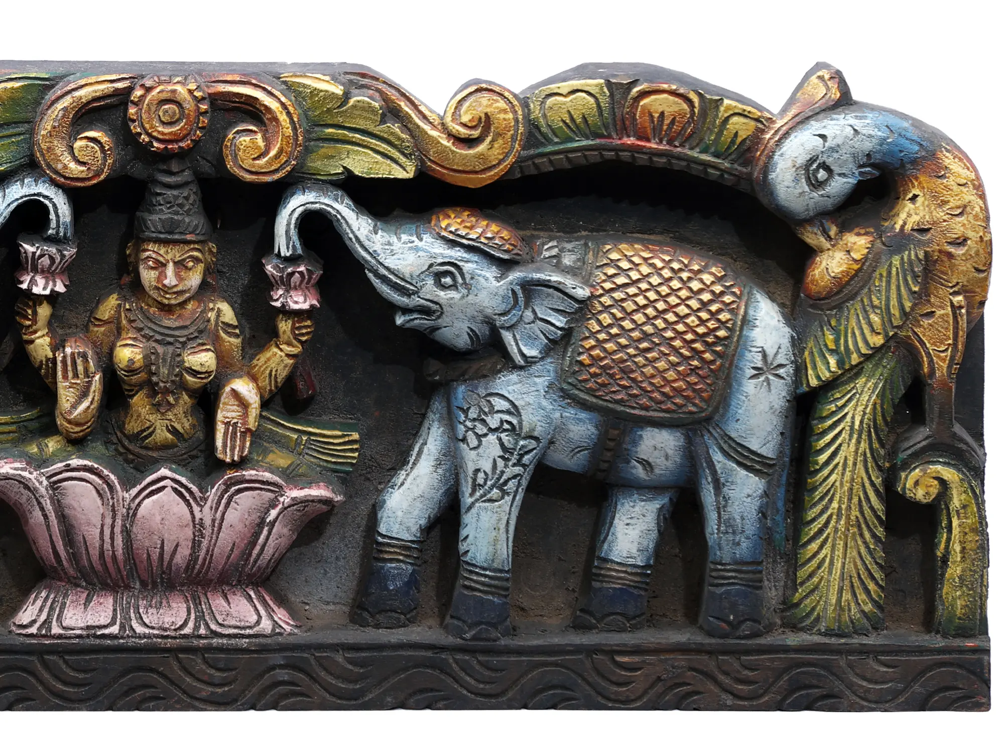 Gaja Lakshmi, also known as “Kamalatmika” or Lakshmi with elephants, the enchanting goddess of abundance, graces the centre of this exquisite wood panel, a vision of divine opulence. She sits, regal and resplendent, her presence radiating grace and prosperity. Two majestic elephants, their trunks arched like sacred fountains, pour forth cascades of life-giving water upon her, symbolising the blessings of abundance and fertility. A splendid frame of peacocks encircles her, their iridescent plumage a testament to the goddess’s splendour. It is a tableau that captures the essence of wealth and prosperity in a mesmerising dance of nature and divinity, an eternal ode to Gaja Lakshmi's benevolence.