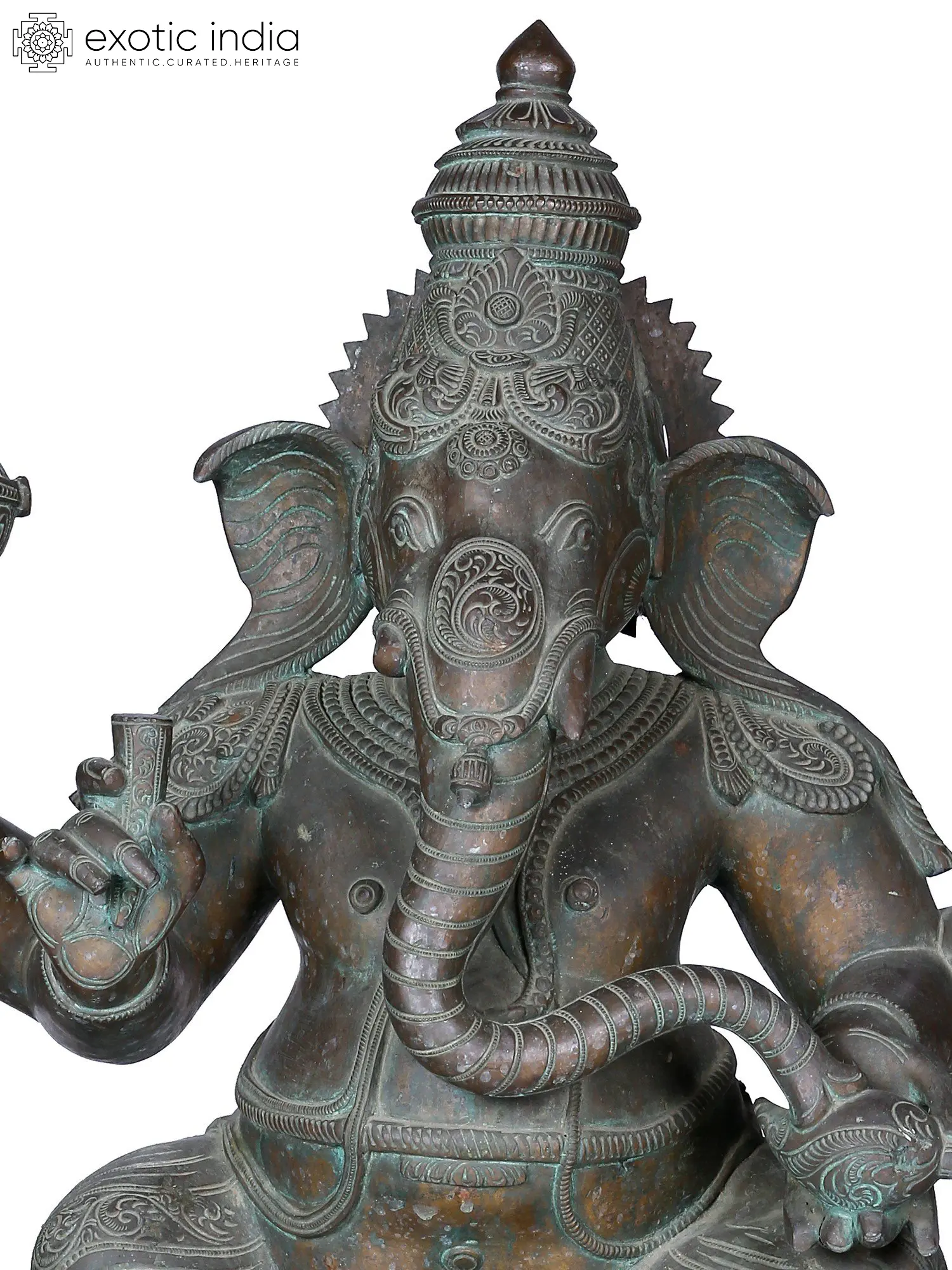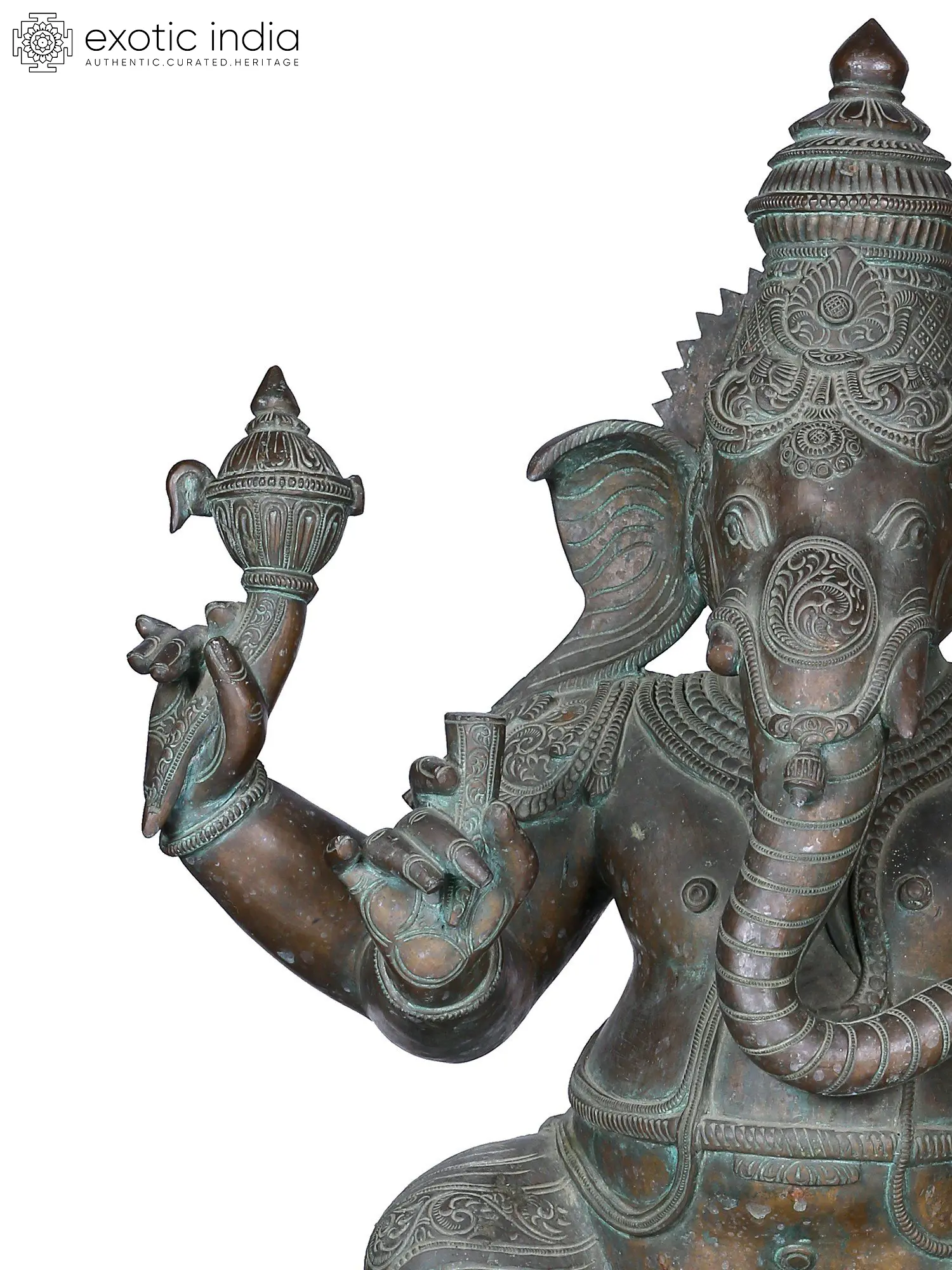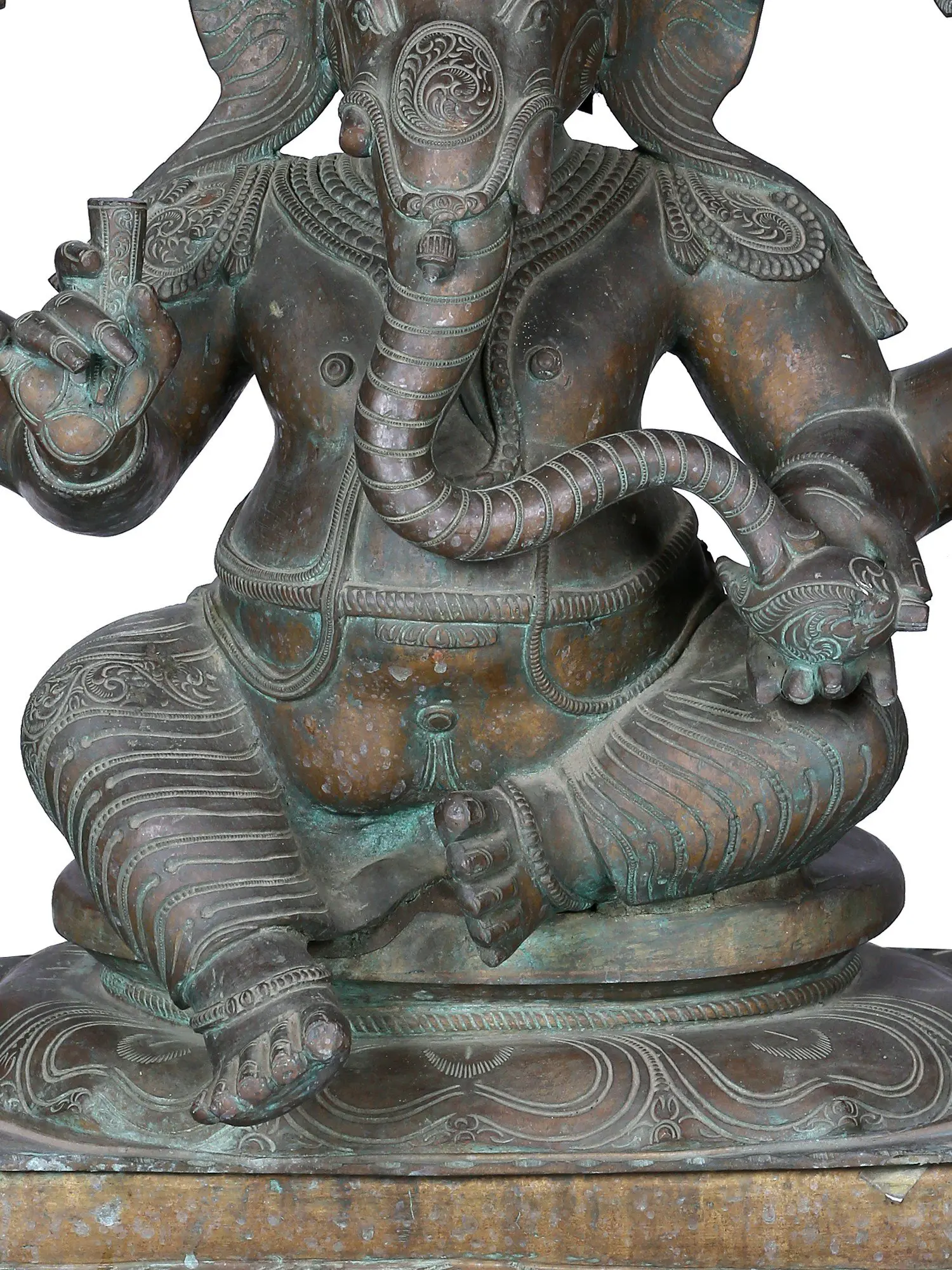 The spiritually rich and aesthetically endowed art of Panchaloha bronzes from Swamimalai brings a gem of a Ganesha statue to your space! The elephant-headed son of Shiva and Parvati appears in his most auspicious four-armed roopa, adorned with his attributes and exquisite jewelry which is delineated with tasteful precision in the bronze statue.