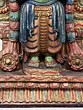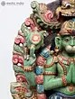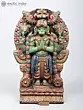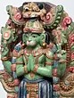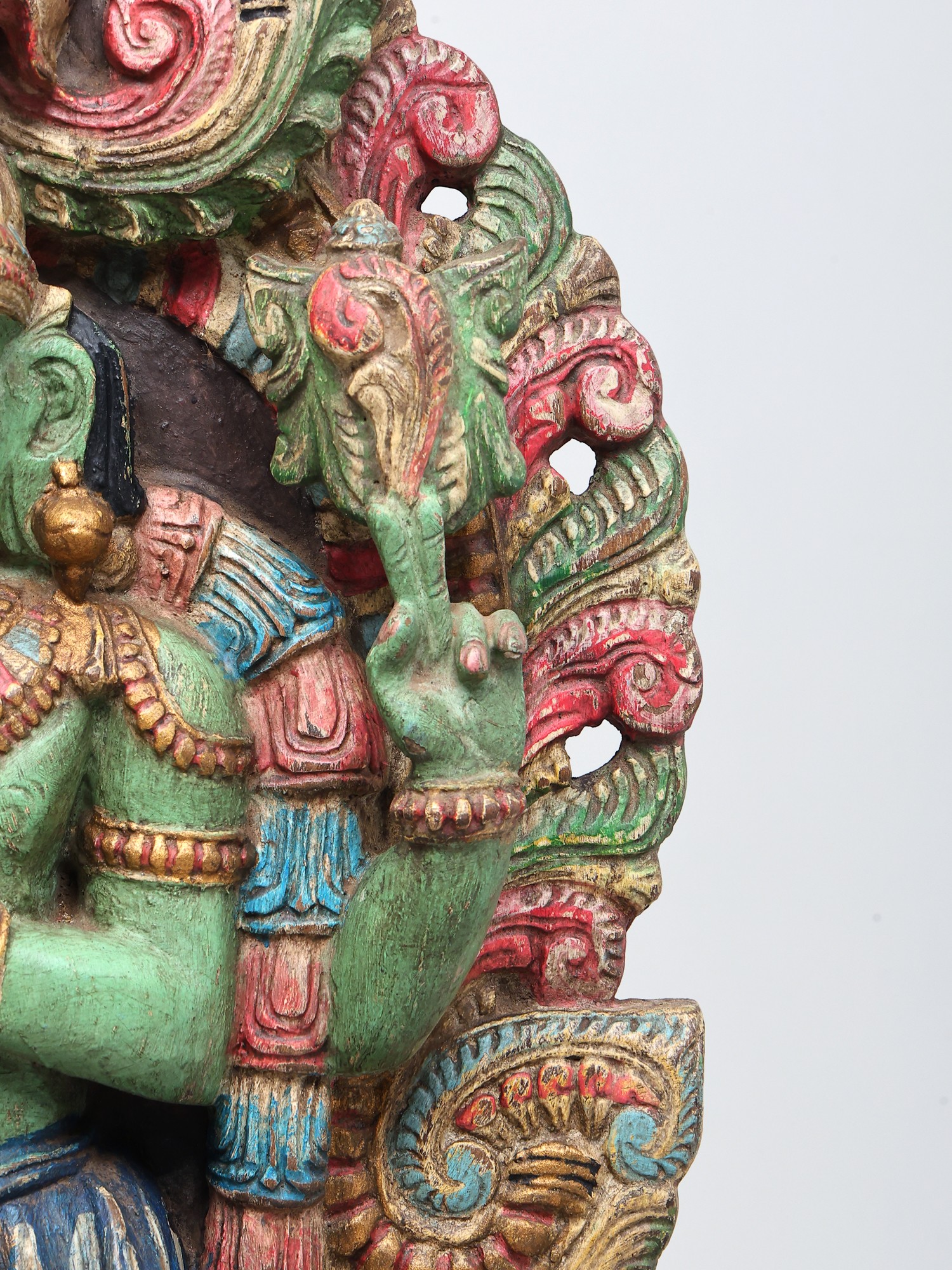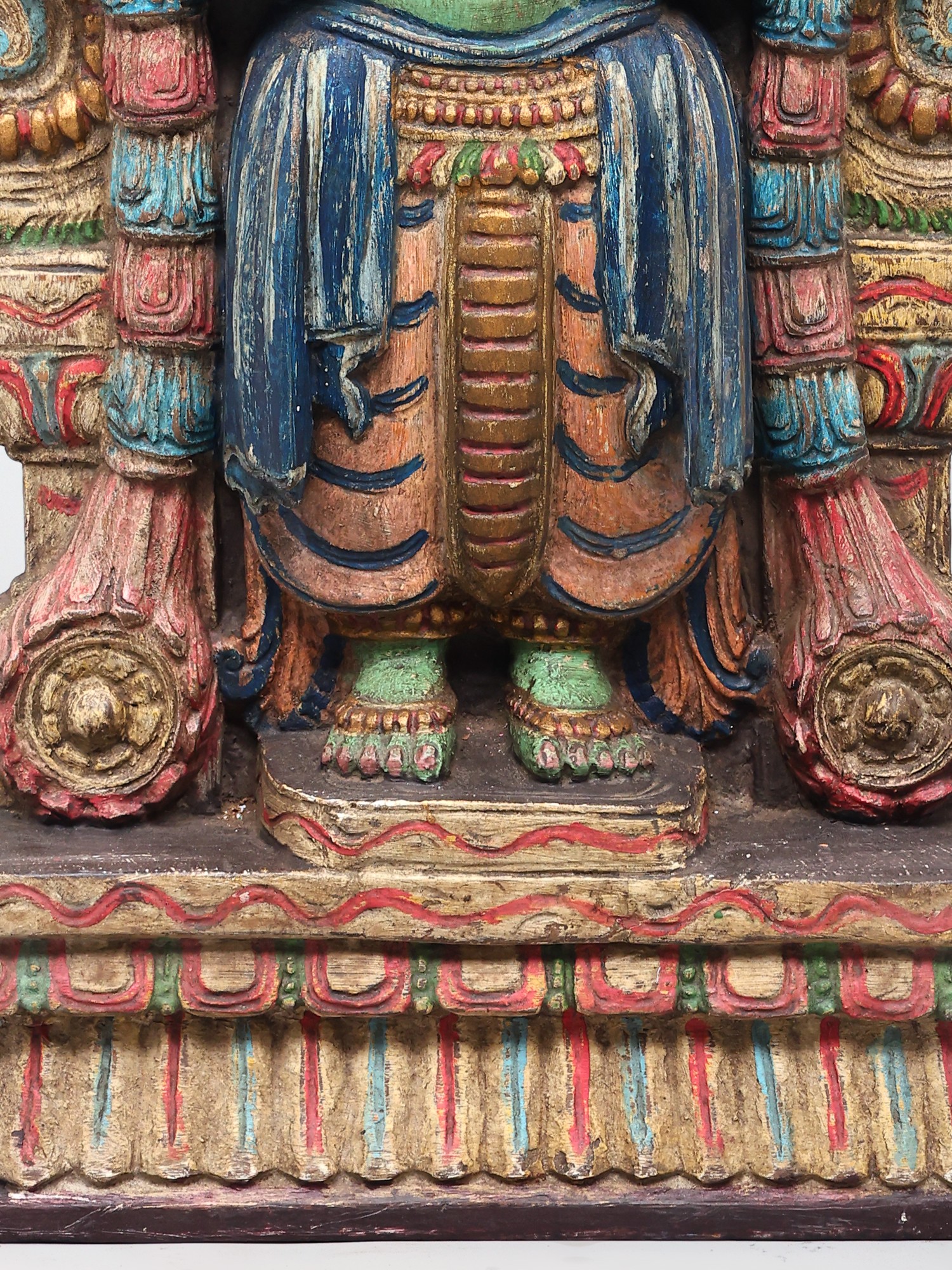 Crafted from high-quality wood, this sculpture showcases the rich tradition of Indian wood carving. The weathered, antique finish adds a layer of depth and character, hinting at the stories and blessings it has witnessed. The careful application of pigments in shades of red, blue, and gold accentuates the carved details, highlighting the delicate features and intricate patterns. Each stroke of the chisel is evident, revealing the artist's dedication and profound understanding of their subject. This piece is not merely decorative; it is a spiritual conduit, designed to bring peace, protection, and divine grace into your home. Its substantial presence makes it a striking centerpiece, radiating an aura of tranquility and spiritual significance.