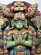 This exquisite wooden carving captures the essence of Lord Hanuman, the devoted son of Vayu, in a posture of profound reverence and unwavering loyalty. Standing at a commanding height, this statue is more than just an artifact; it is a testament to centuries of devotion and a powerful symbol of strength, courage, and selfless service. The intricate details, rendered with masterful skill, bring this divine figure to life, inviting contemplation and inspiring awe. The vibrant green hue of Hanuman's form signifies his inherent purity and connection to nature, while the multiple arms suggest his boundless energy and multifaceted abilities. Each hand is positioned with grace, some holding symbolic objects or in mudras of blessing and protection. The serene yet determined expression on his face embodies his unwavering commitment to Lord Rama, a central theme in the epic Ramayana. His ornate headdress and jewelry speak to his regal status and divine lineage.