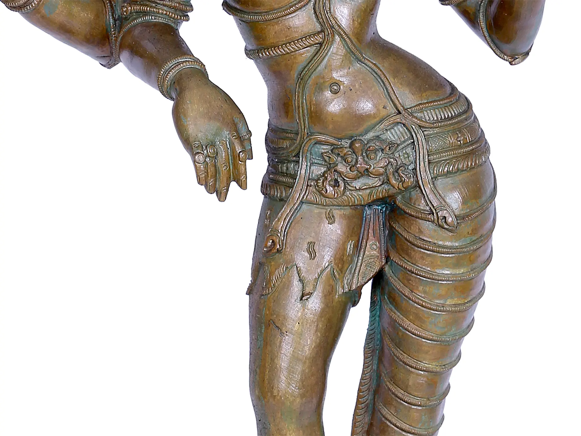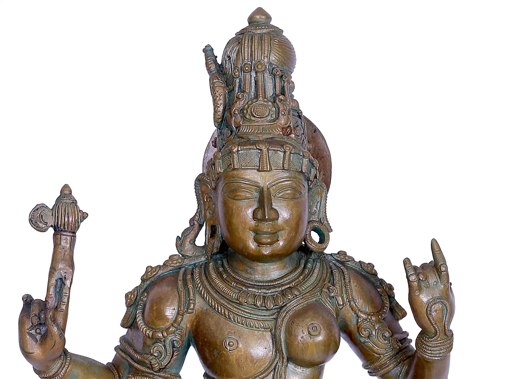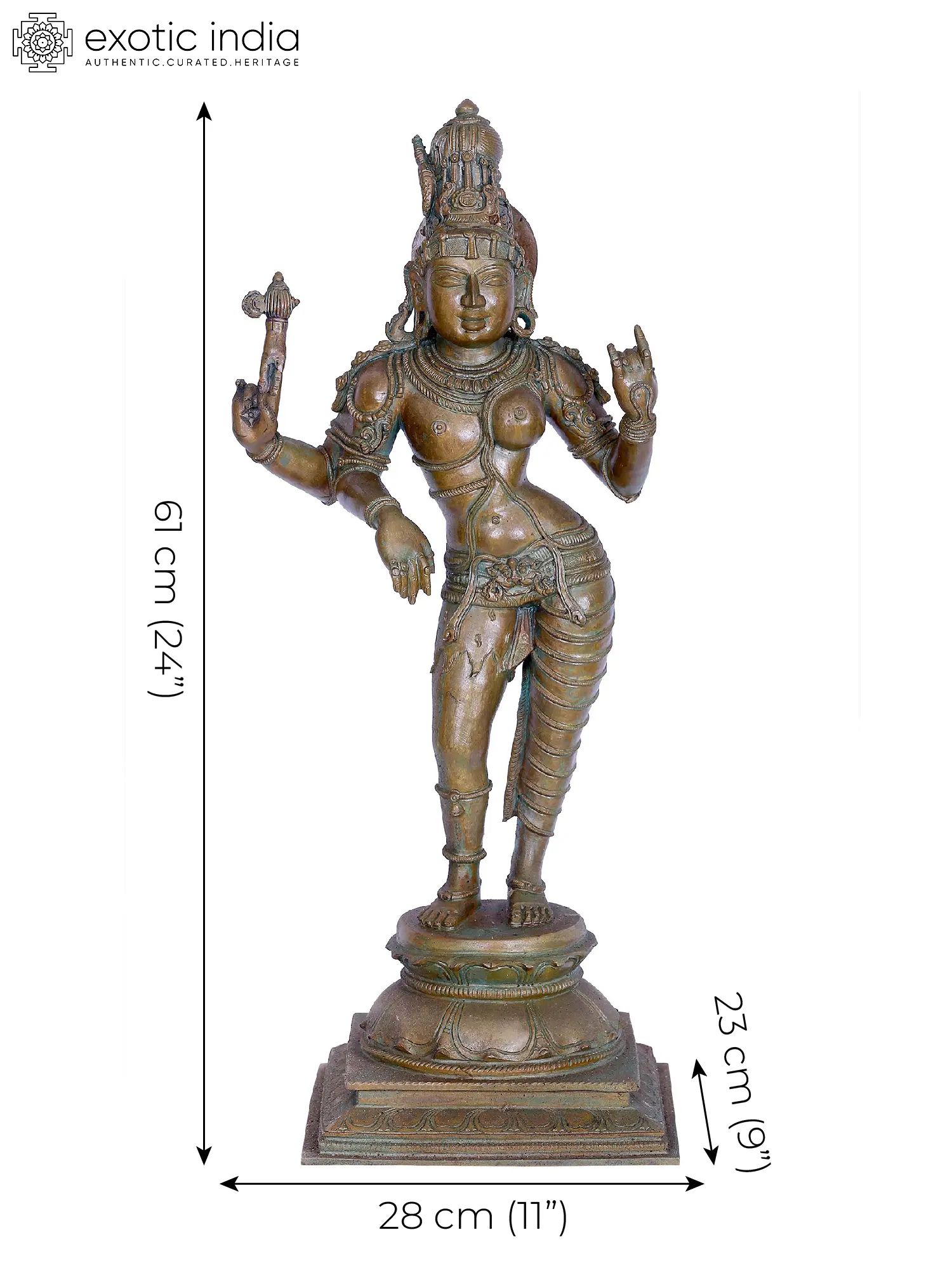 The mesmerizing beauty and divinity of Ardhanarishwara has been reimagined in this Chola-style bronze statue. The form of Ardhanarsihwara takes a graceful posture, standing on a lotus which is the symbol of the origin of the world. Uma-Parvati is Shiva’s Vamangi (residing on the left side, wife), wearing lovely ornaments and a fine dhoti whose folds are beautifully captured in metal. Her hair is tied in a long Jatamukuta, which she shares with Shiva, whose tresses are adorned with Ganga, followed by a Makara-shaped earring, a dhoti of tiger hide, and a bell and anklet on his foot. This form of Shiva and Shakti is a unique three-armed one, with Uma raising her hand in a graceful gesture, and a two-armed Shiva danging one hand toward the ground and holding an Ankusha or goad in the other.