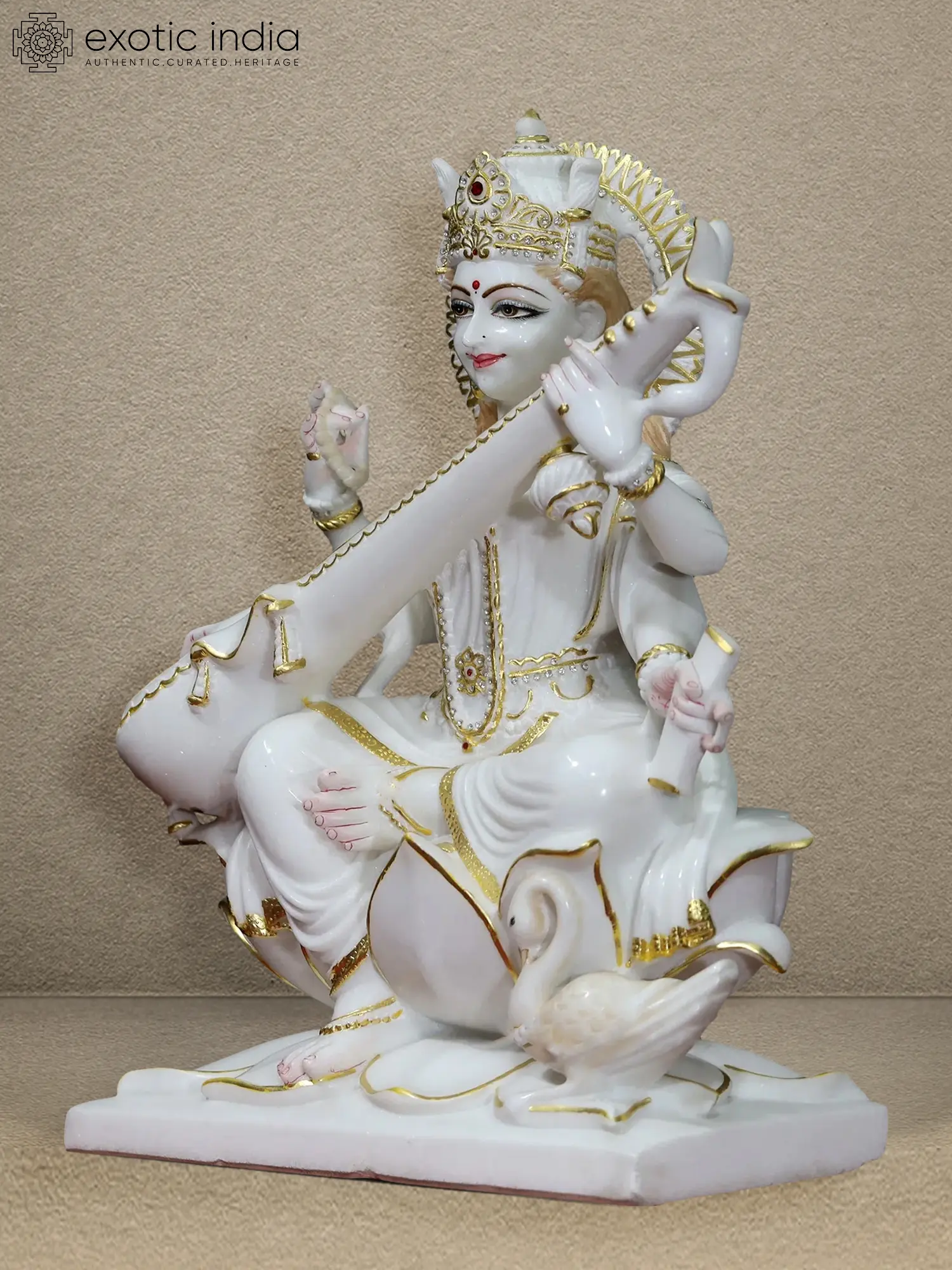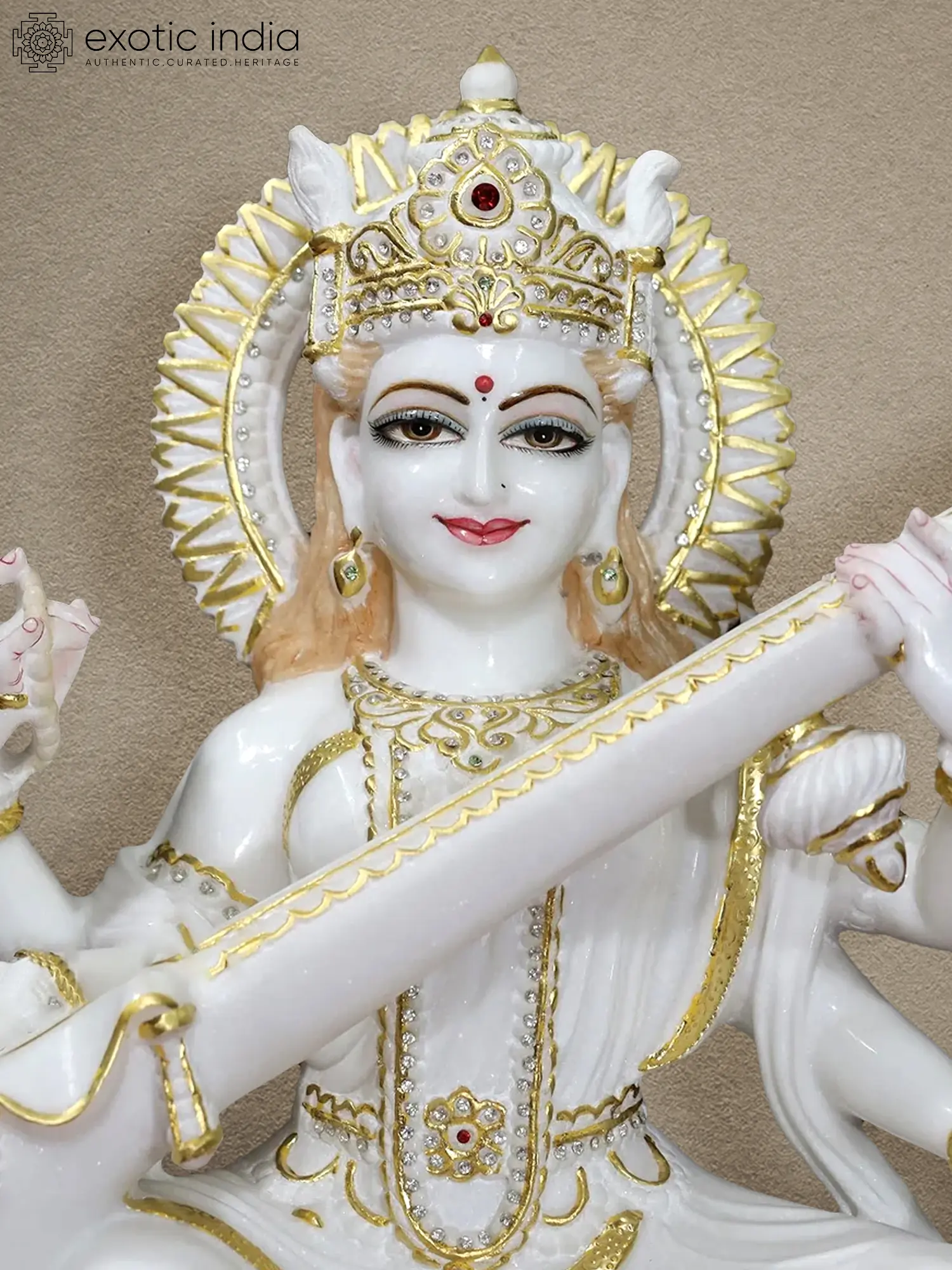 18" Handmade Statue Of Goddess Saraswati | White Makrana Marble Sculpture