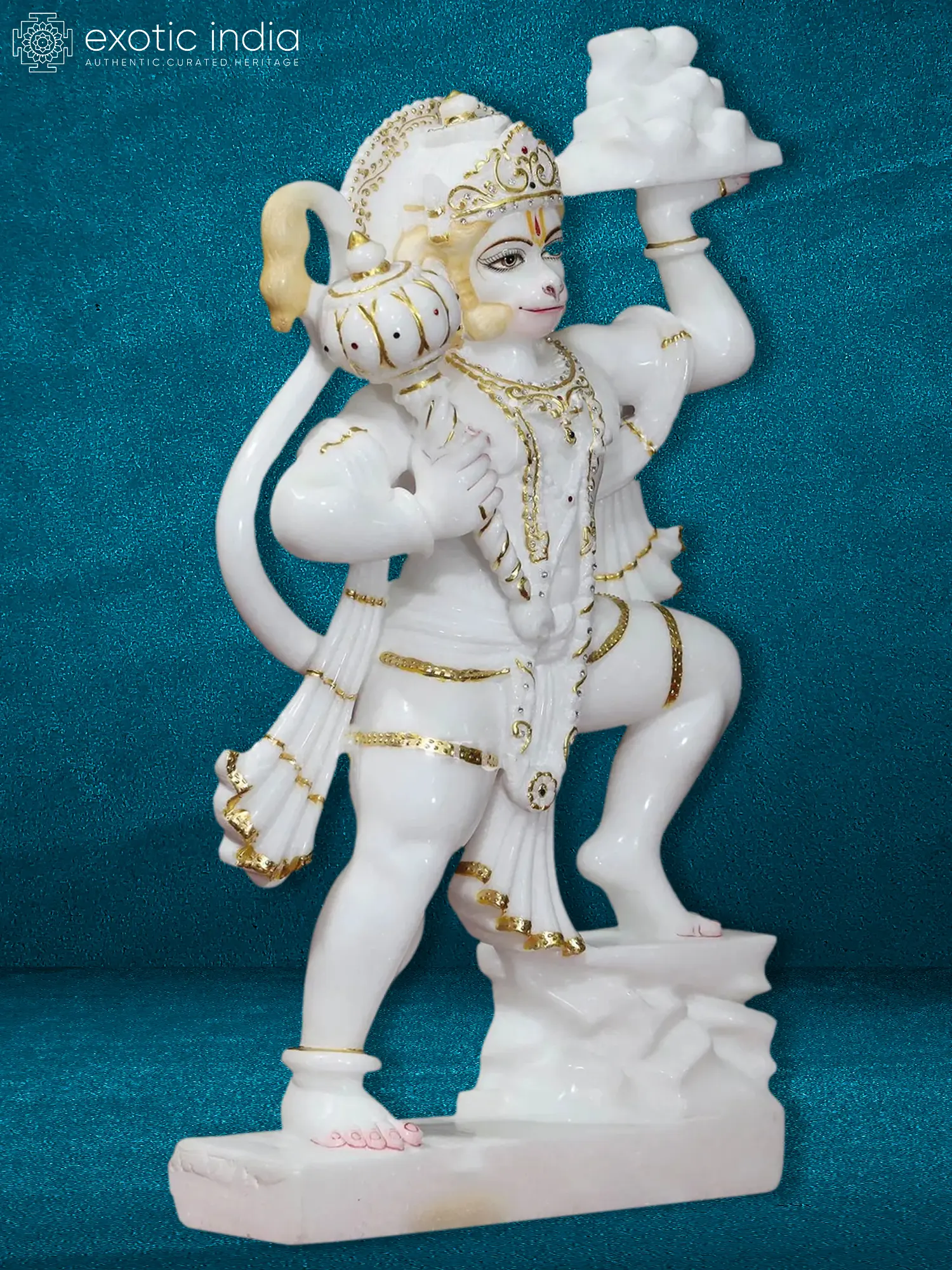 Invoke the divine presence of Lord Hanuman, the steadfast devotee of Lord Rama and an embodiment of strength, devotion, and courage, with this magnificent 24-inch sculpture. Carved from the finest Makrana marble, renowned for its purity and luminous quality, this piece transcends mere decoration to become a focal point of spiritual significance and artistic mastery. The cool, pristine white of the marble, sourced from the quarries of Rajasthan, echoes the purity of Hanuman's heart and his unwavering loyalty.