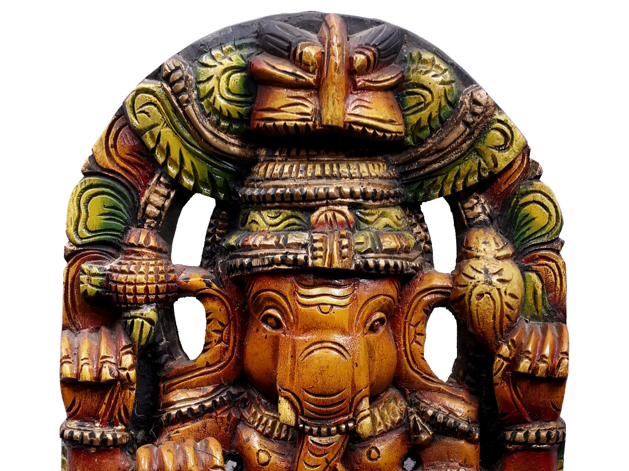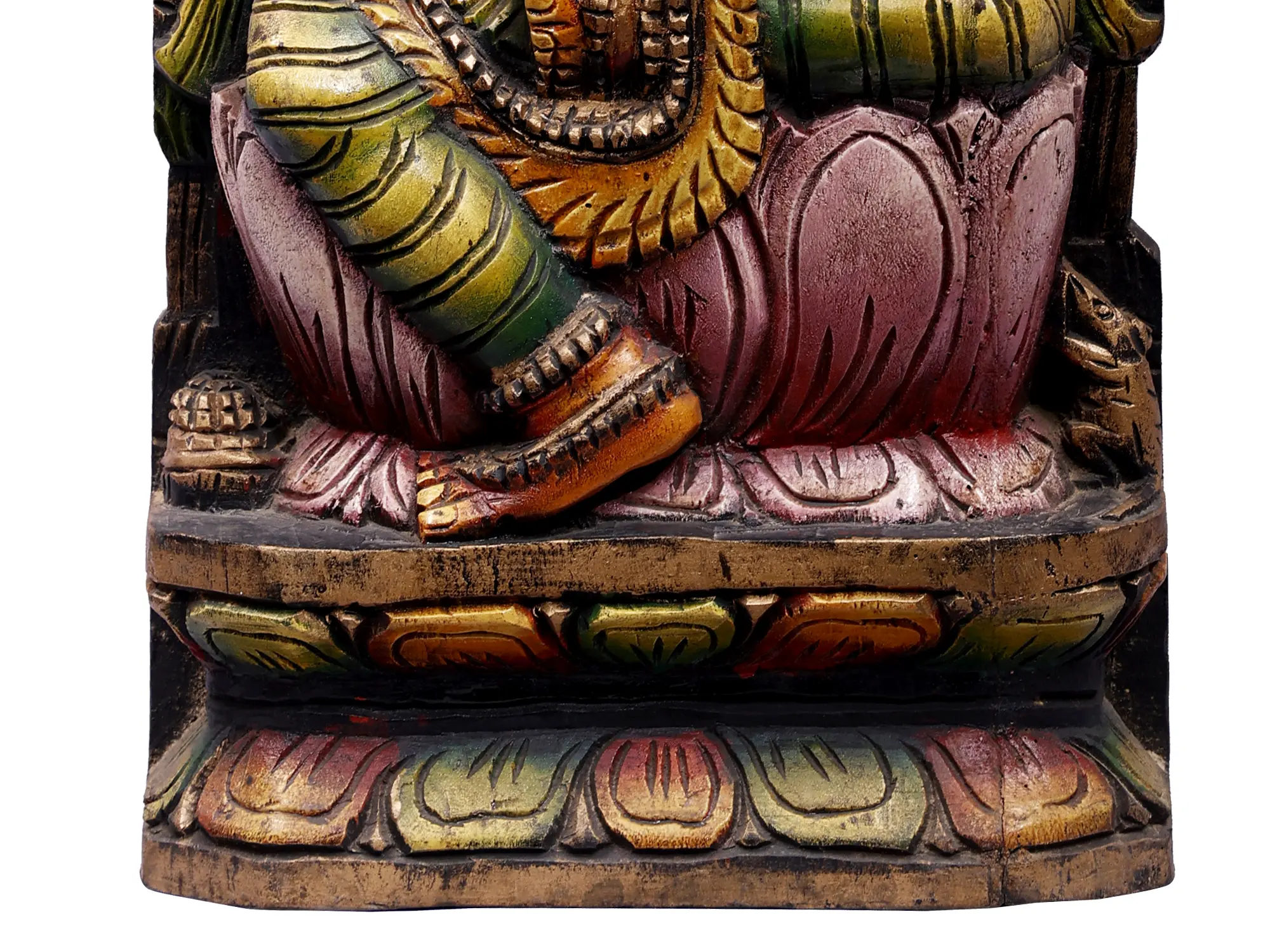 In the Hindu religion, Ganesha represents the unity of all virtue and goodness. Ganesha, the brother of Karttikeya and the son of Shiva and Parvati is sometimes portrayed as a pampered youngster. Still, kings and sages revere him for his extraordinary power and divine knowledge. This wooden statue captures Sri Ganesha's grandeur in the style of South Indian wood carvings. Sitting on a lotus throne, which represents the blossoming of wisdom, Ganesha is decorated with a flowery dhoti (lower body robe), a crown, and other jewels. Both the lotus vine and the tripunda (a Shaivite mark) on his forehead are symbols of pure wisdom.