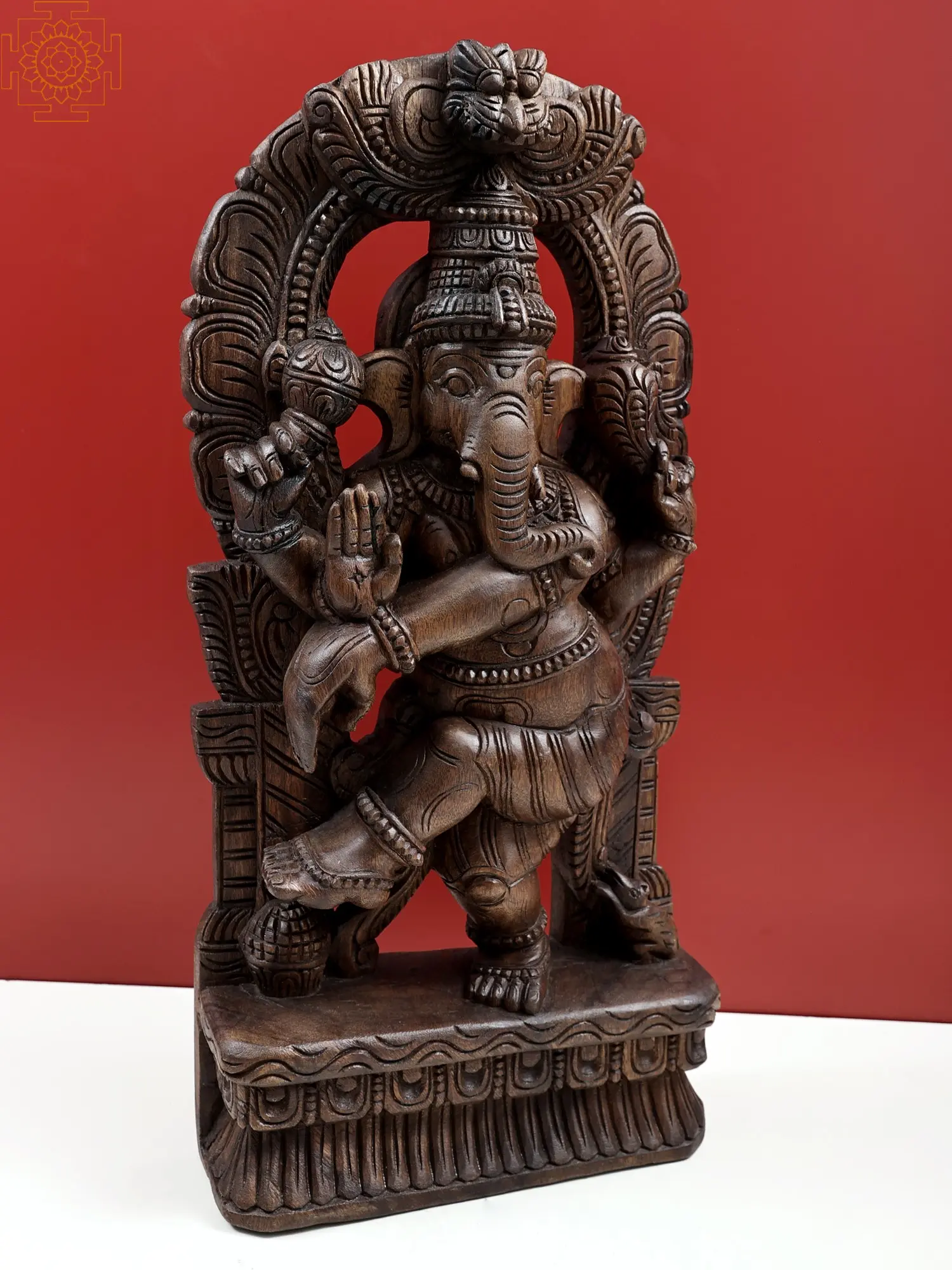 24" Wooden Dancing Ganesha with Kirtimukha Prabhavali Wall Hanging | Handmade