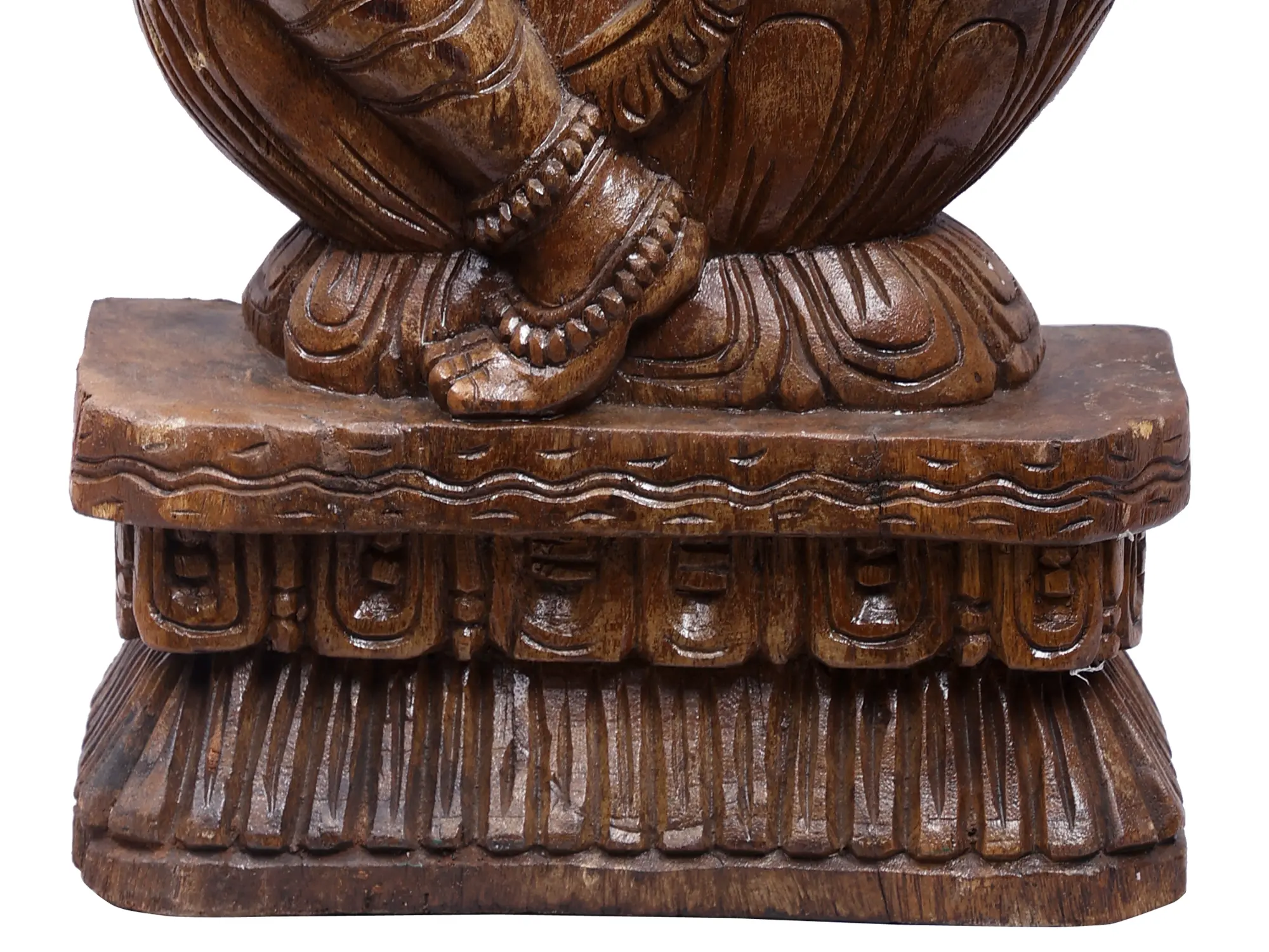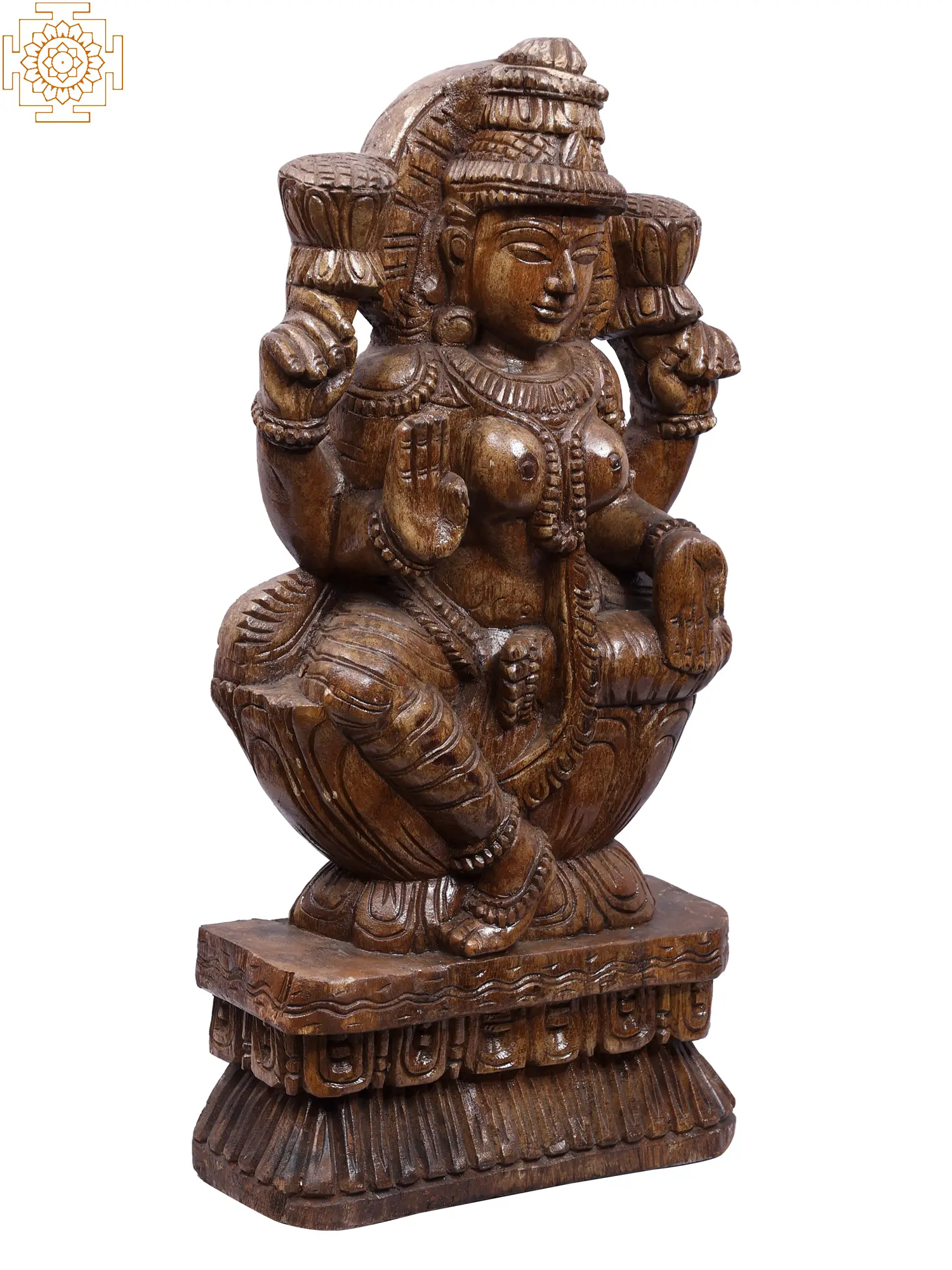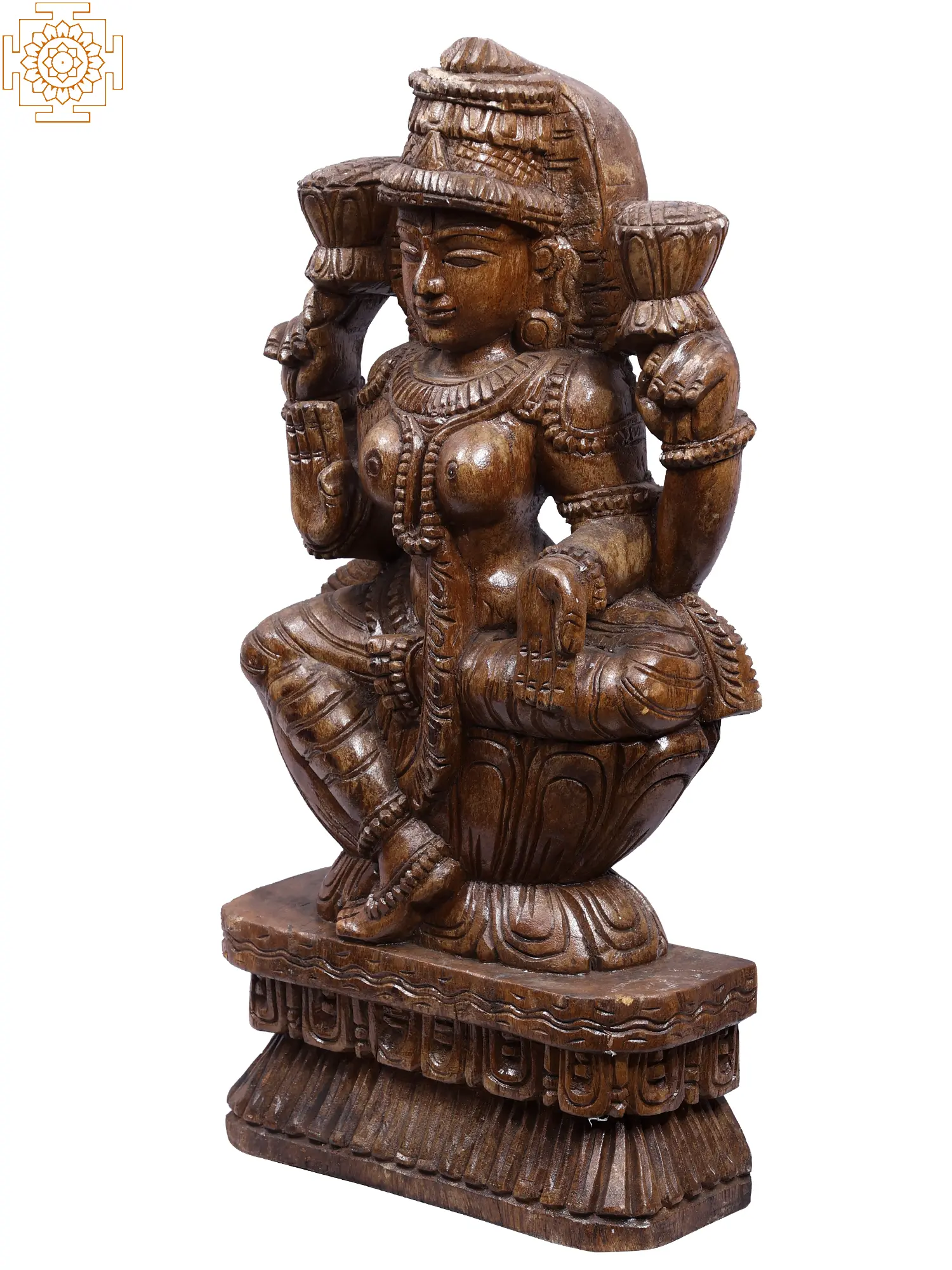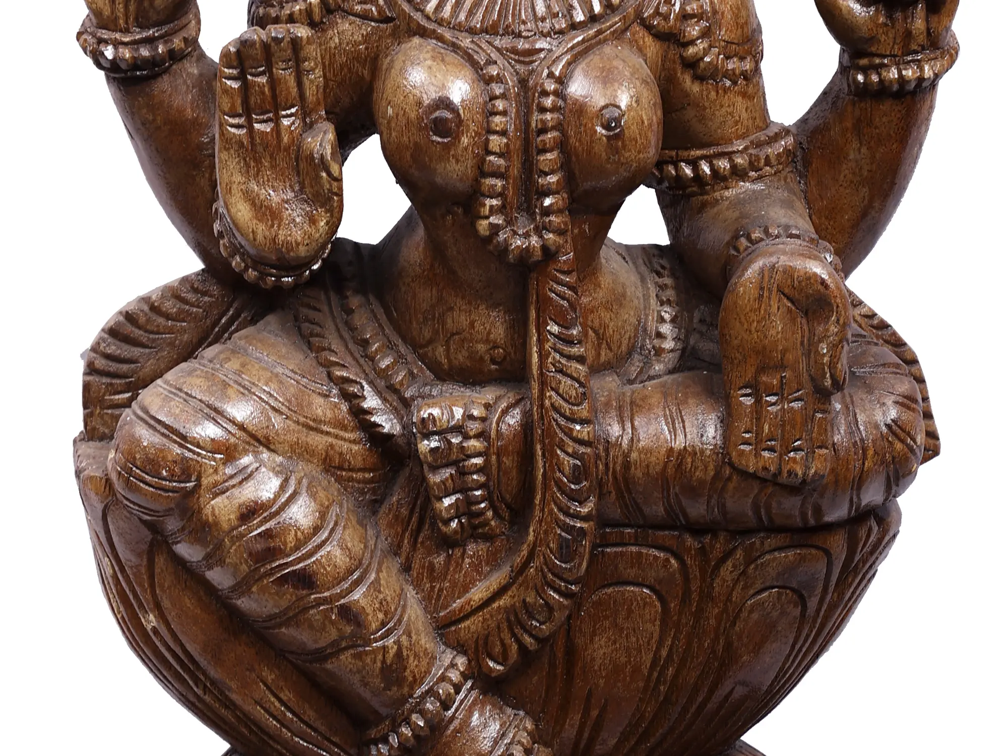 For generations, Indian artists have been captivated by Devi Lakshmi, the Hindu goddess of wealth, and have used her to depict Sri Hari's adored in exquisite ways. Devi Lakshmi appears in this wooden figure as her four-armed Chaturbhuja Roopa, wearing regal clothing and jewelry, and clutching blossoming lotuses in her hands. She is making the gestures of Abhaya, or fearlessness, and Varada, or granting boons. Goddess Lakshmi, symbolizing the boundless nature of her kindness, bestows prosperity from her hand in Varada mudra.