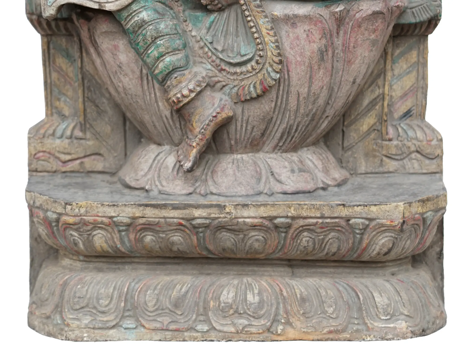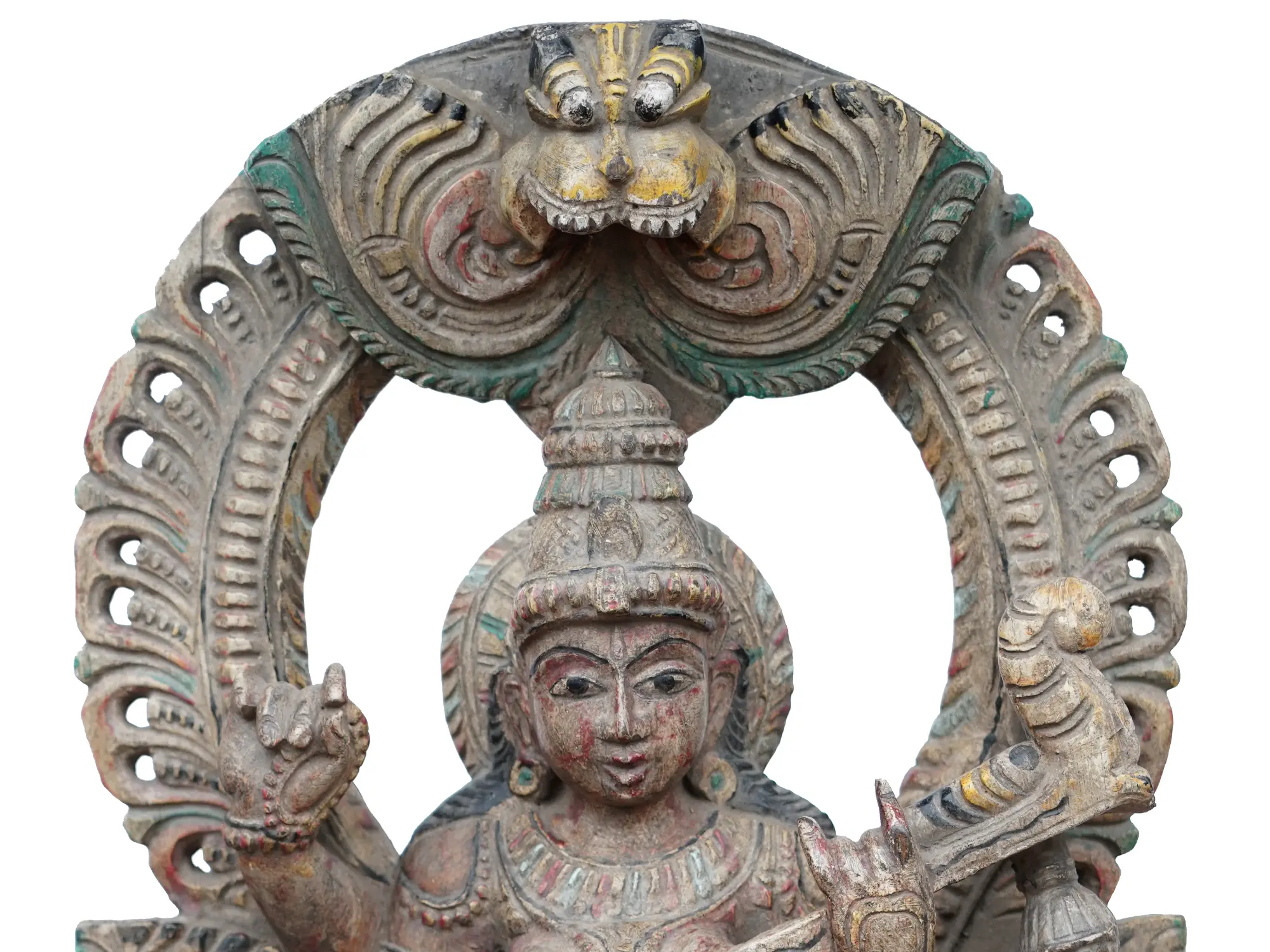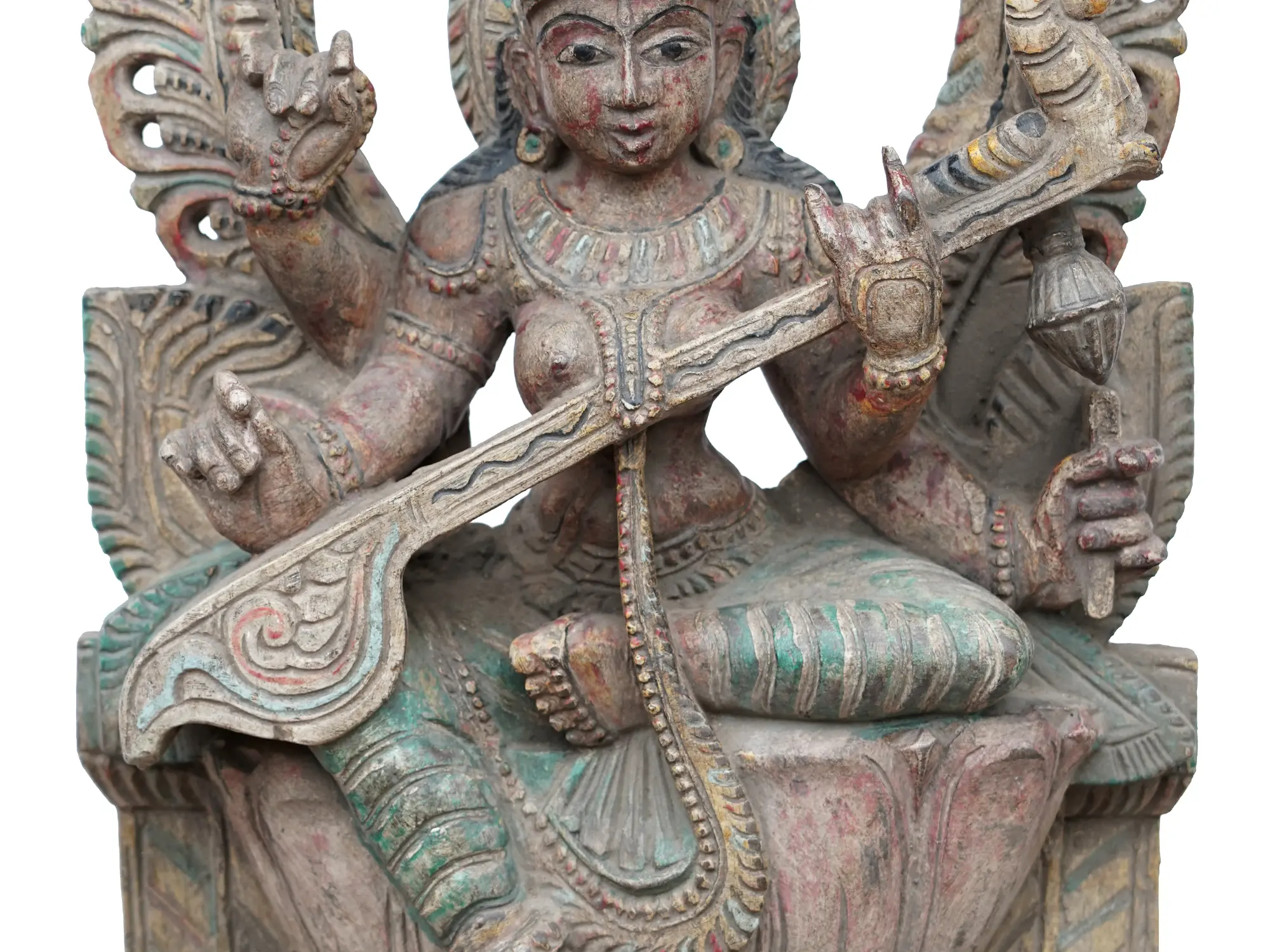Devi Saraswati is Padmasana, sitting on a Padma or lotus throne, adorned in a queenly manner. The Veena she carries has the symbol of Makara on its end, which represents divinity and royalty in Indian art. Embellished with hints of colors and carved with marvelous details, this wooden artwork brims with the essence of the goddess of wisdom.