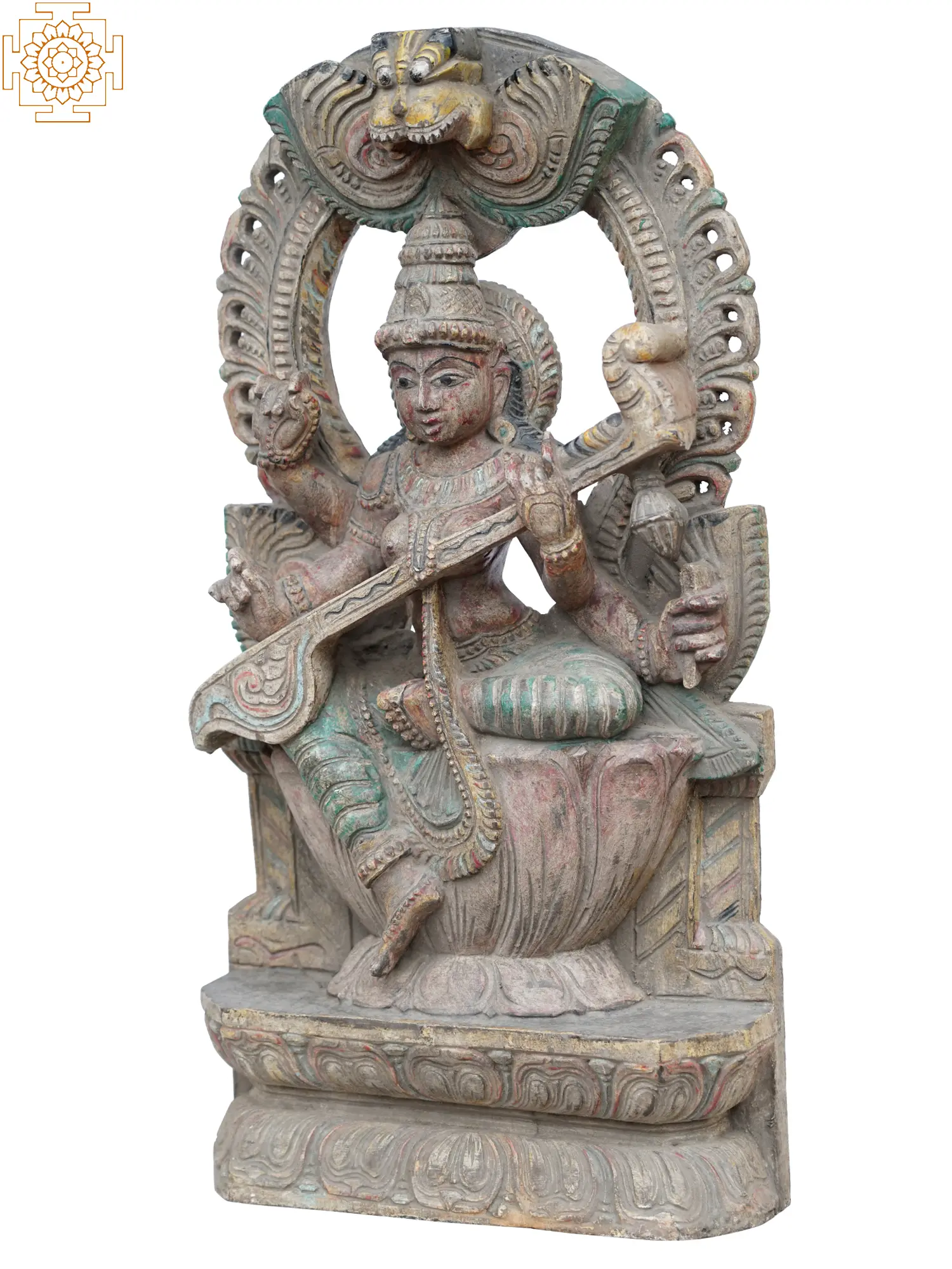 Sculpting the icons of goddess Saraswati on the walls of the sanctums they constructed, ancient Shilpis gave an ode to the great mother goddess, the source of their inspiration and skills. Inspired by the same temple art, this wooden statue recreates the aura of Devi Saraswati. A splendor radiates from the secondary elements of the statute- the Kirtimukha aureole, lotus pedestal, and pillars between the two.